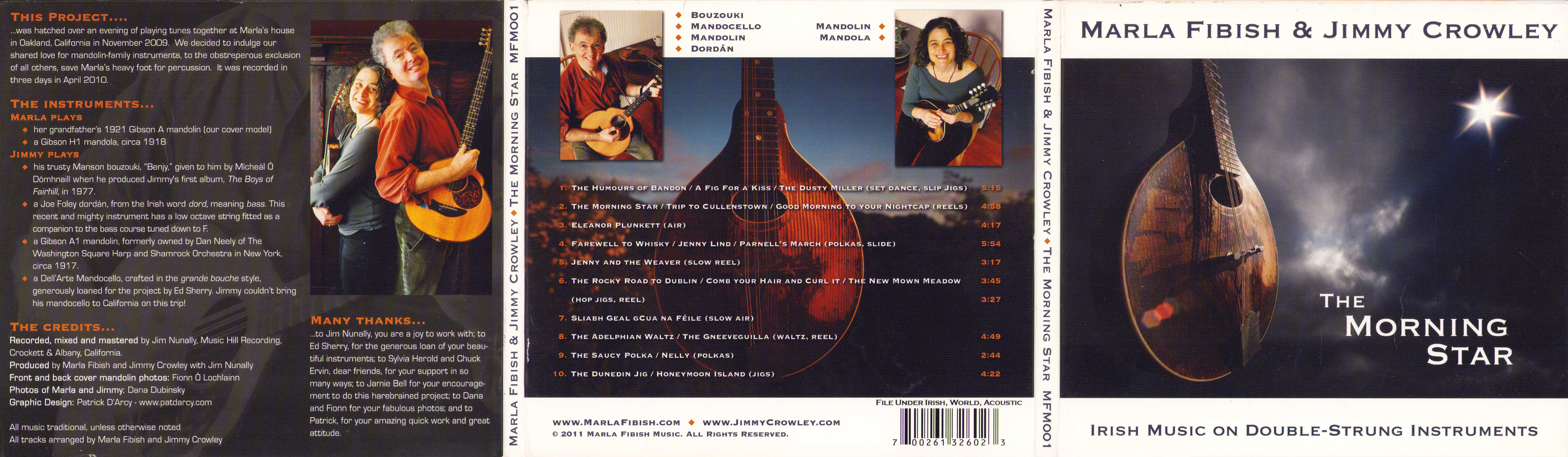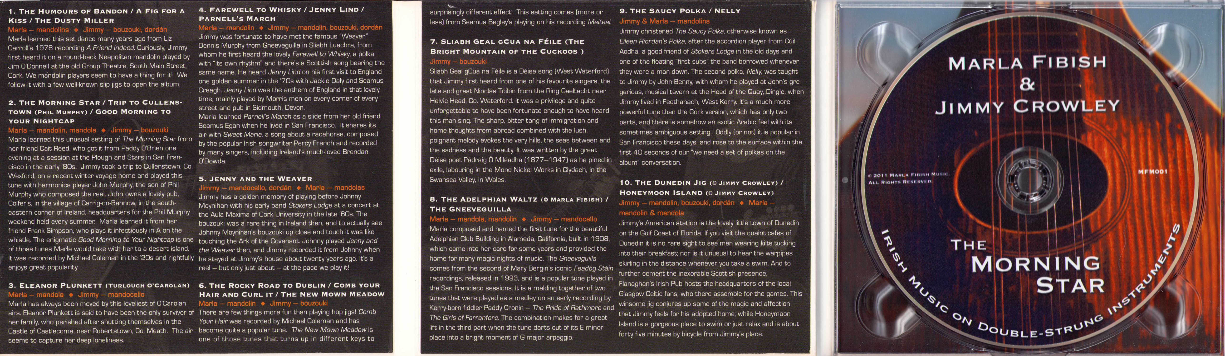 The Humours of Bandon, A Fig for a Kiss & The Dusty Miller — Marla learned this set dance many years ago from Liz Carroll's 1978 recording A Friend Indeed Curiously, Jimmy first heard it on a round-back Neapolitan mandolin played by Jim O'Donnell at the old Group Theatre, South Main Street, Cork. We mandolin players seem to have a thing for it! We follow it with a few well-known slip jigs to open the album.