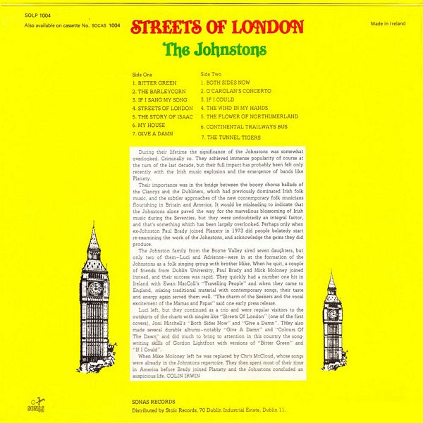 Their importance was in the bridge between the boozy chorus ballads of the Clancys and the Dubliners, which had previously dominated Irish folk music, and the subtler approaches of the new contemporary folk musicians flourishing in Britain and America. It would be misleading to indicate that the Johnstons alone paved the way for the marvellous blossoming of Irish music during the Seventies, but they were undoubtedly an integral factor, and that's something which has been largely overlooked. Perhaps only when ex-Johnston Paul Brady joined Planxty in 1973 did people belatedy start re-examining the work of the Johnstons, and acknowledge the gems they did produce.