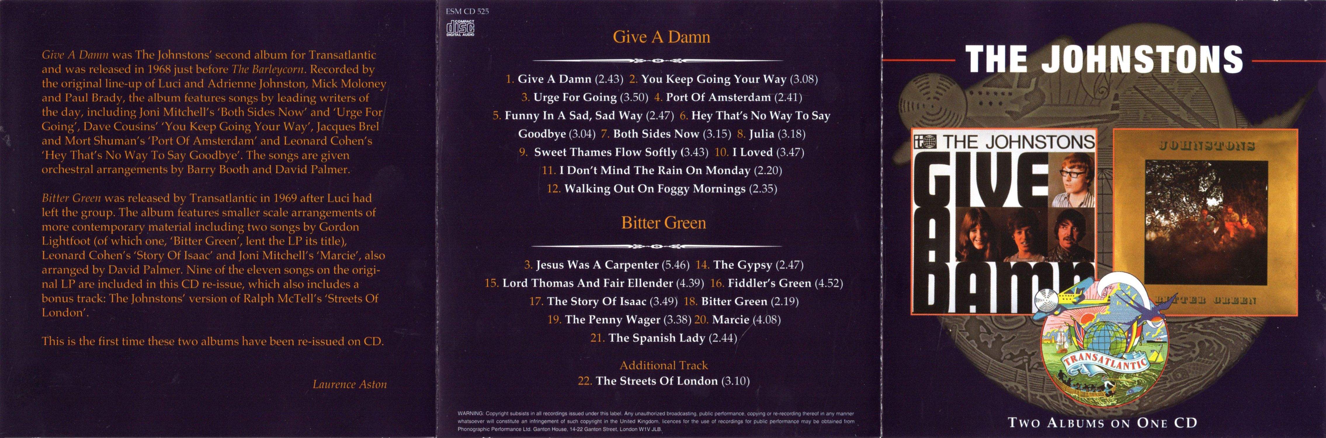 Give A Damn was The Johnstons' second album for Transatlantic and was released in 1968 just before The Barleycorn. Recorded by the original line-up of Luci and Adrienne Johnston, Mick Moloney and Paul Brady, the album features songs by leading writers of the day, including Joni Mitchell's 'Both Sides Now' and 'Urge For Going', Dave Cousins' 'You Keep Going Your Way', Jacques Brel and Mort Shuman's 'Port Of Amsterdam' and Leonard Cohen's 'Hey That's No Way To Say Goodbye'. The songs are given orchestral arrangements by Barry Booth and David Palmer.