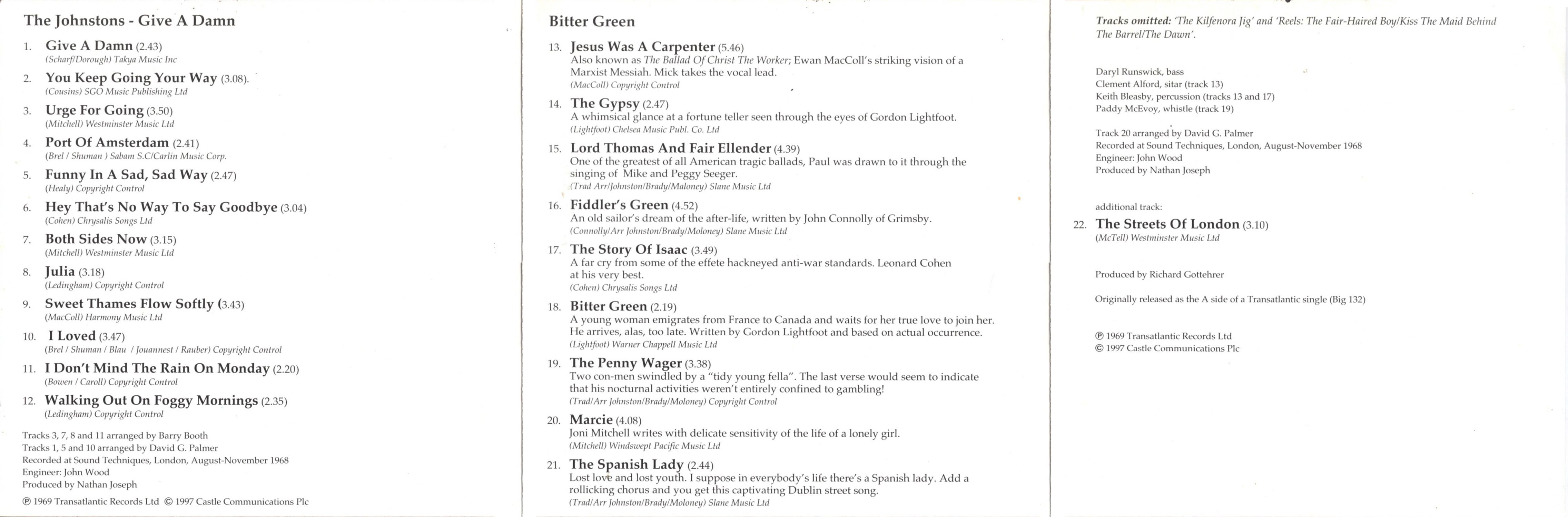 Bitter Green was released by Transatlantic in 1969 after Luci had left the group. The album features smaller scale arrangements of more contemporary material including two songs by Gordon Lightfoot (of which one, 'Bitter Green', lent the LP its title), Leonard Cohen's 'Story Of Isaac' and Joni Mitchell's 'Marcie', also arranged by David Palmer. Nine of the eleven songs on the original LP are included in this CD re-issue, which also includes a bonus track: The Johnstons' version of Ralph McTell's 'Streets Of London'.