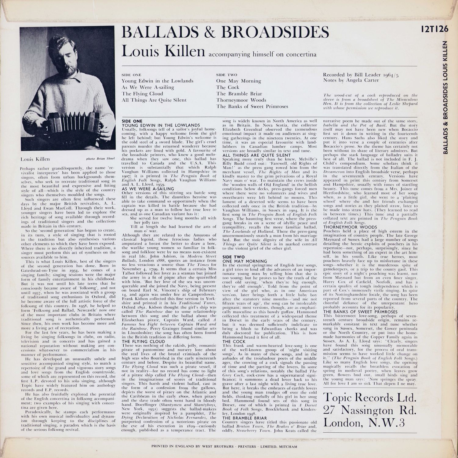 This is what Louis Killen, best of the singers of the second generation has done. Born in Gateshead-on-Tyne in 1934, he comes of a singing family; singing sessions were the major form of family entertainment in his childhood. But it was not until his late teens that he consciously became aware of 'folksong', and not until 1957, when he was associated with a group of traditional song enthusiasts in Oxford, did he become aware of the full artistic force of the folksong of this country. In 1958, he helped to form 'Folksong and Ballad, Newcastle' now one of the most important clubs in Britain where traditional song is authentically performed. Since then, his own work has become more and more a living act of recreation.