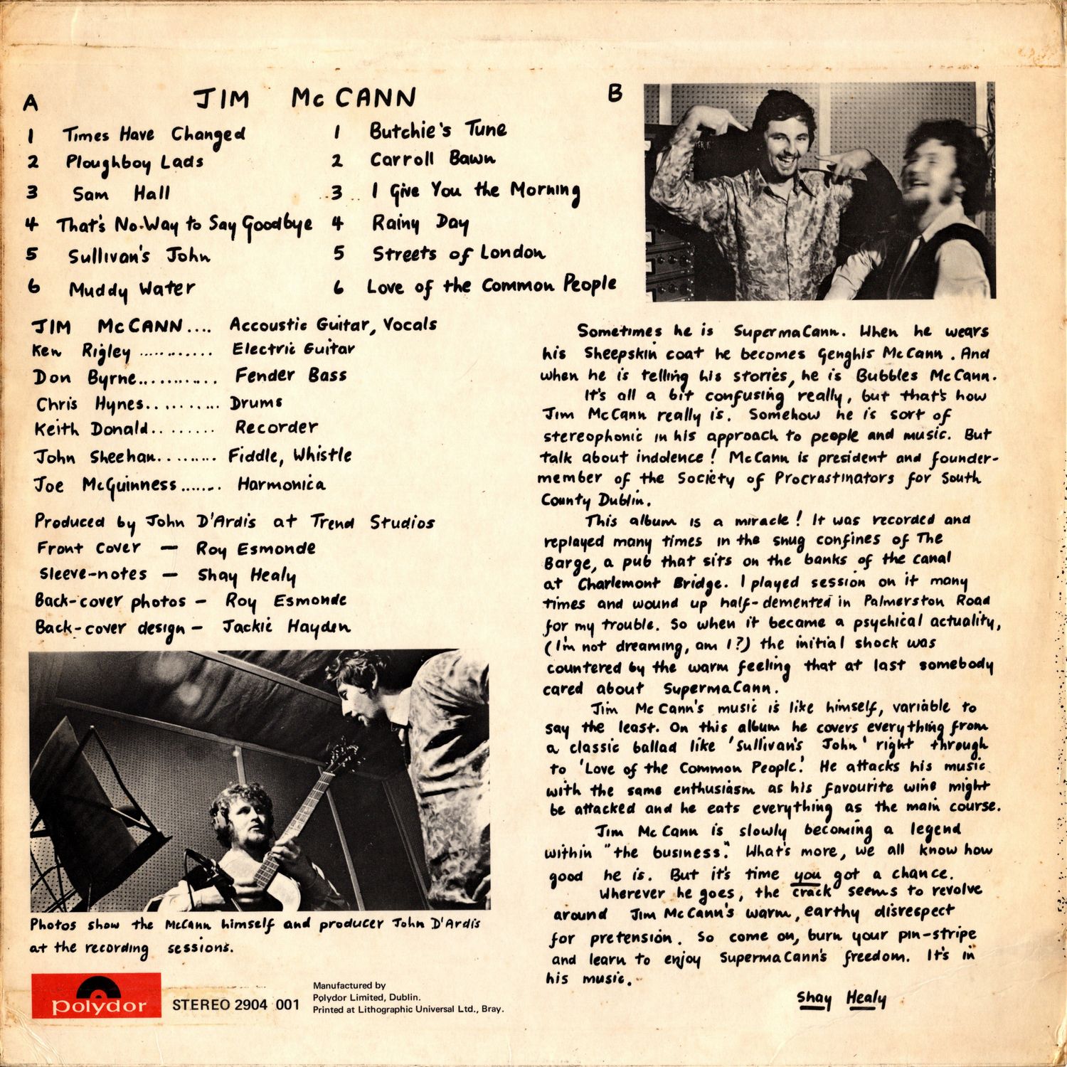 Jim McCann's music is like himself, variable to say the least. On this album he covers everything from a classic ballad like "Sullivan's John right through to Love of the Common People. He attacks his music with the same enthusiasm as his favourite wine might be attacked and he eats everything as the main course.