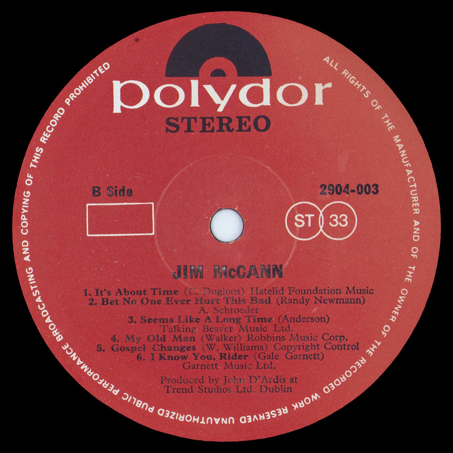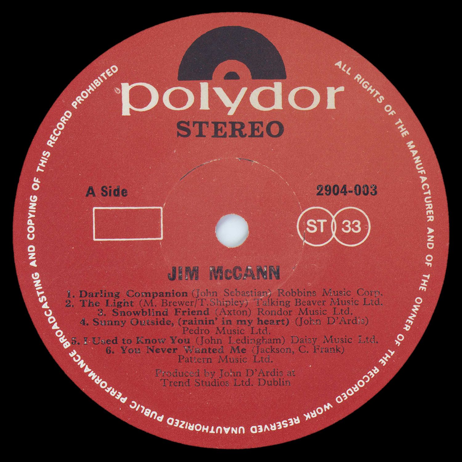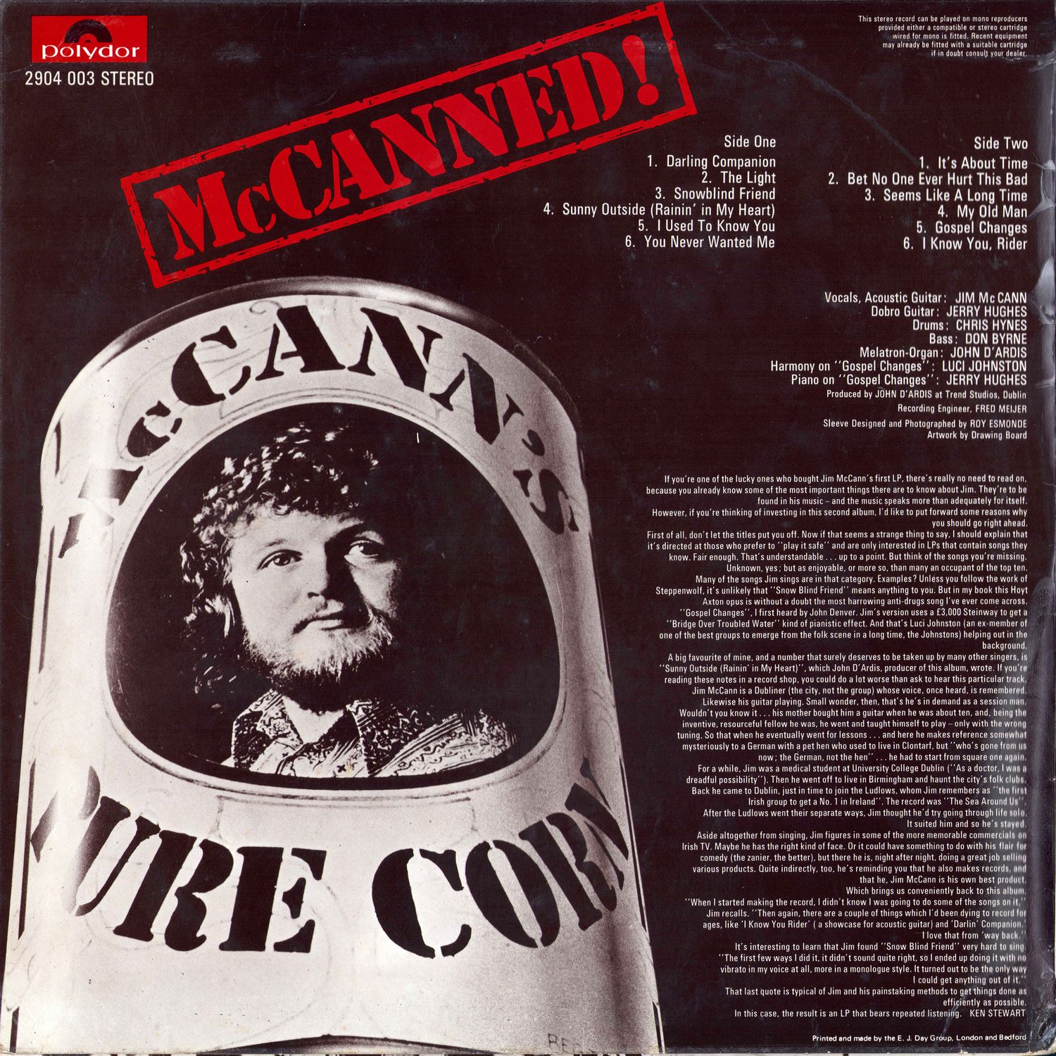 A big favourite of mine, and a number that surely deserves to be taken up by many other singers, is "Sunny Outside (Rainin' in My Heart)", which John D'Ardis, producer of this album, wrote. If you're reading these notes in a record shop, you could do a lot worse than ask to hear this particular track. Jim McCann is a Dubliner (the city, not the group) whose voice, once heard, is remembered. Likewise his guitar playing. Small wonder, then, that's he's in demand as a session man. Wouldn't you know it... his mother bought him a guitar when he was about ten, and, being the inventive, resourceful fellow he was, he went and taught himself to play — only with the wrong tuning. So that when he eventually went for lessons … and here he makes reference somewhat mysteriously to a German with a pet hen who used to live in Clontarf, but "who's gone from us now; the German, not the hen" … he had to start from square one again For a while, Jim was a medical student at University College Dublin ("As a doctor, I was a dreadful possibility"). Then he went off to live in Birmingham and haunt the city's folk clubs. Back he came to Dublin, just in time to join the Ludlows, whom Jim remembers as "the first Irish group to get a No. 1 in Ireland". The record was "The Sea Around Us". After the Ludlows went their separate ways, Jim thought he'd try going through life solo.