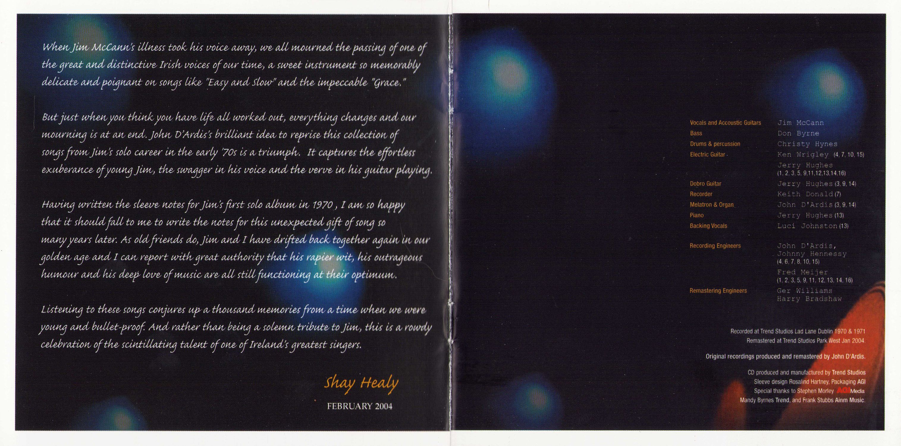 When Jim McCann's illness took his voice away, we all mourned the passing of one of the great and distinctive Irish voices of our time, a sweet instrument to memorably delicate and poignant on songs Like "Easy and Slow" and the impeccable "Grace."