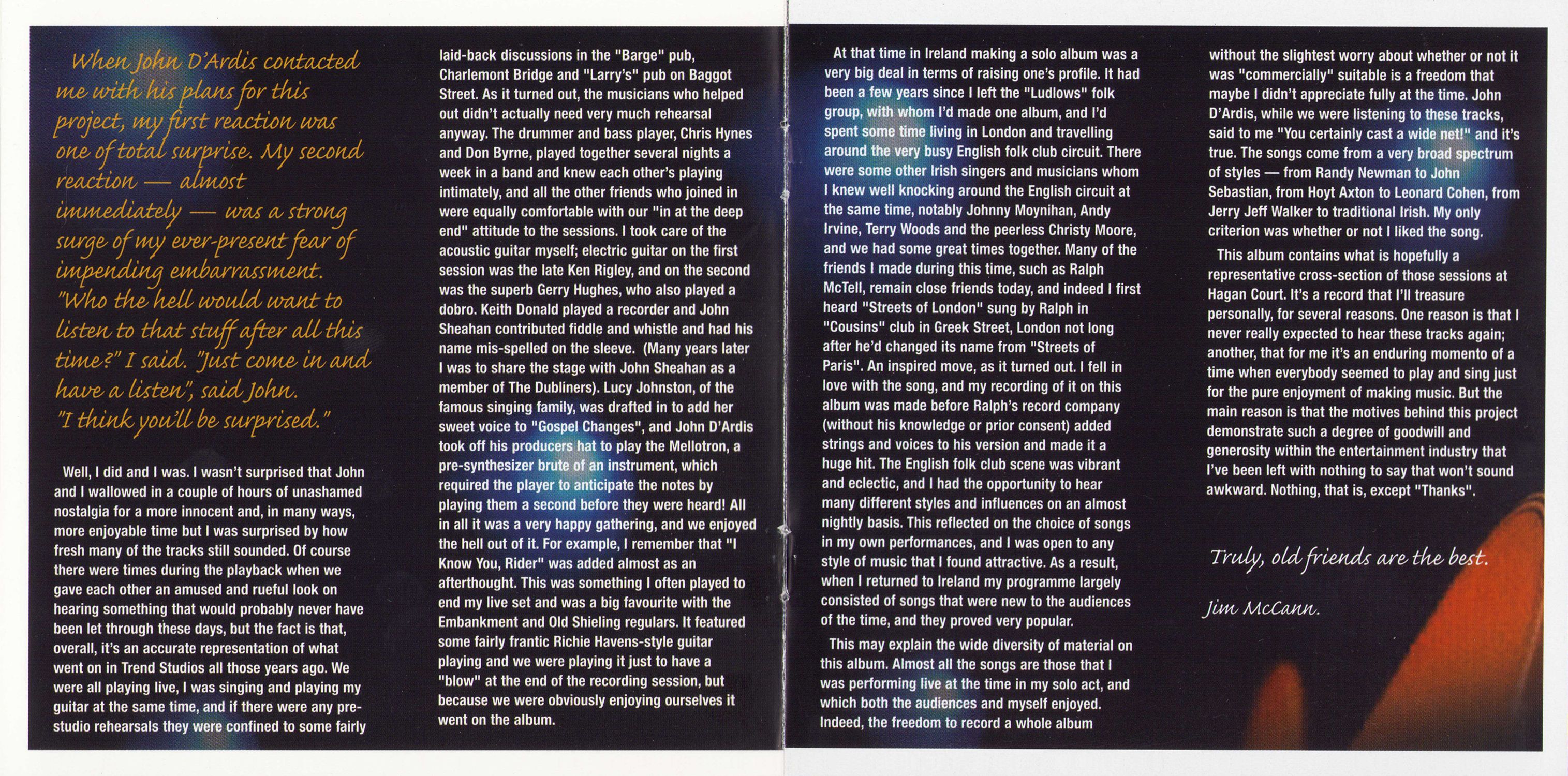 Having written the sleeve note for Jim's first solo album in 1970, I am so happy that it should fall to me to write the notes for this unexpected gift of song so many years later. As old friends do, Jim and I have drifted back together again in our golden age and I can report with great authority that his rapier wit, his outrageous humour and his deep love of music are all still functioning at their optimum.