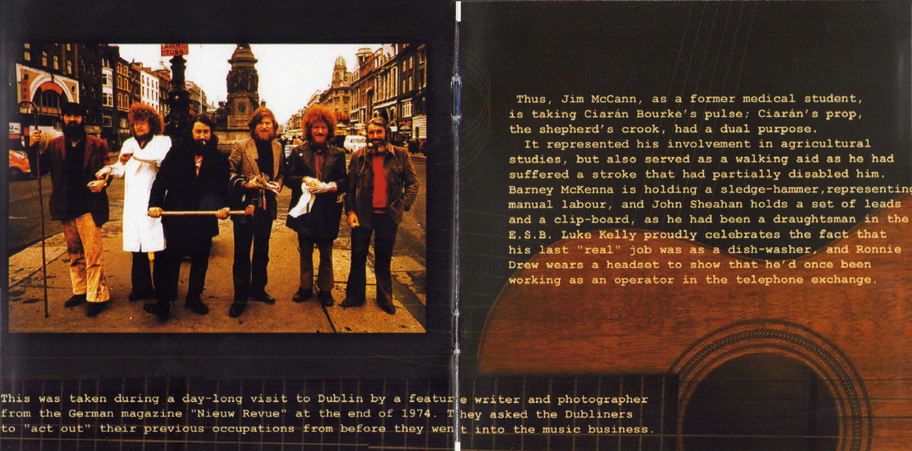 Thus, Jim McCann, as a former medical student, is taking Ciaran Bourke's pulse; Ciaran's prop, the shepherd's crook, had a dual purpose. It represented his involvement in agricultural studies, but also served as a walking aid as he had suffered a stroke that had partially disabled him. Barney McKenna is holding a sledge-hammer, representing manual labour, and John Sheahan holds a set of leads and a clip-board, as he had been a draughtsman in the E.S.B. Luke Kelly proudly celebrates the fact that his last "real" job was as a dish-washer, and Ronnie Drew wears a headset to show that he'd once been working as an operator in the telephone exchange.