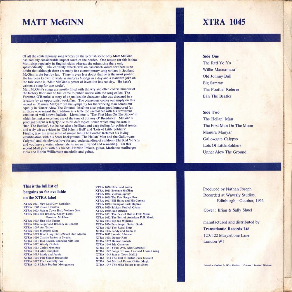 Finally, take his great sense of simple fun (The Footba' Referee) his loving identification with his Scots background (The Heilan' Man and the Gallowgate Calypso) and his obvious love for and understanding of children (The Red Yo Yo) and you have a writer whose talents are rich, varied and rewarding. On this record Matt joins with his friends, Hamish Imlach, guitar, Marianne Aarlberger viola and Robin Williamson mandolin and guitar.