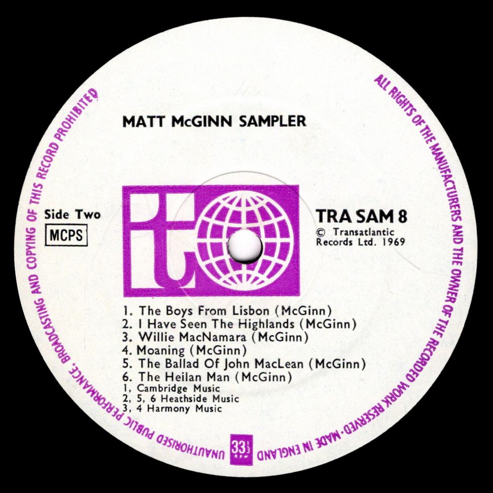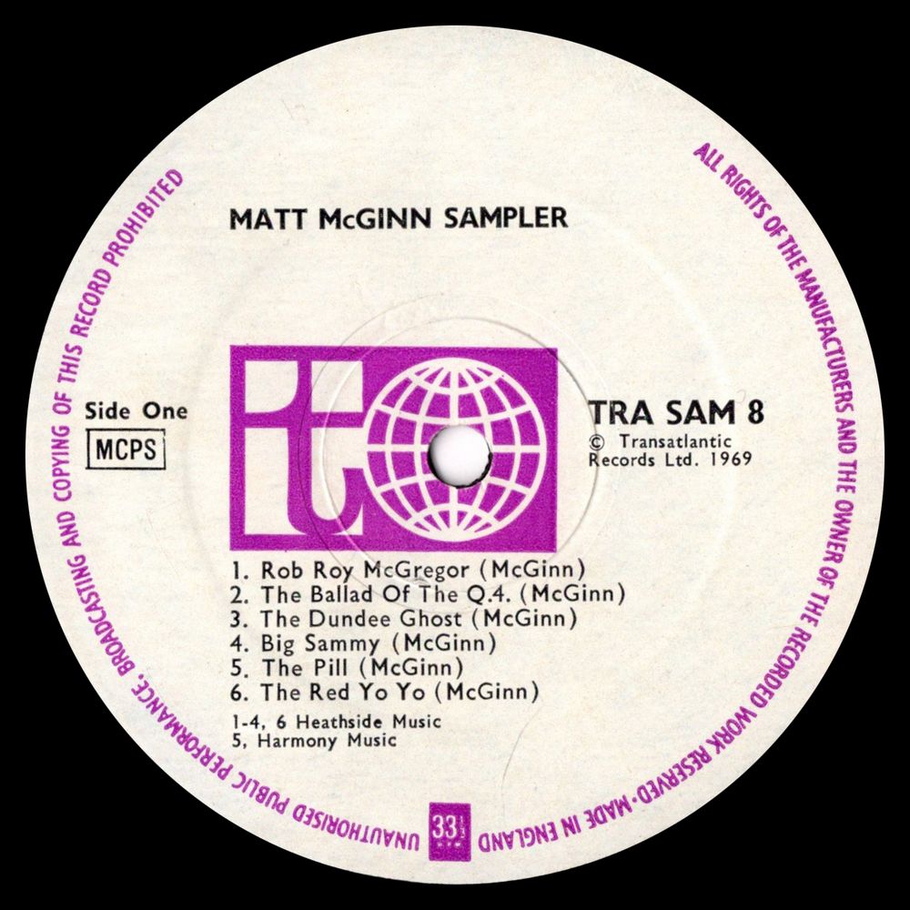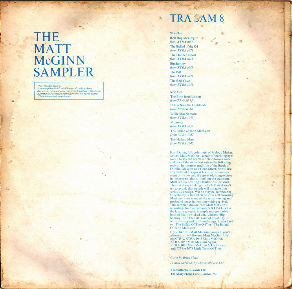 Karl Dallas, folk columnist of Melody Maker, writes: Matt McGinn — a pair of sparkling eyes over a bushy red beard, a rich sonorous voice. and one of the wickedest wits in the folksong revival. In the great tradition of the Bards of Dublin, Glasgow and Grub Street, he will use any material to express his ire or his amusement or his joy and if a great old song expires in the process, that's tough on the tradition. Matt is busy creating a tradition of his own. There is always a danger, which Matt doesn't try to avoid, that people will not take him seriously enough. Wit he maybe, lampooner he certainly is, but when he leaves off clowning Matt can write some of the most moving and profound songs in the song writing revival. This sampler, drawn from Matt McGinn's recordings for Transatlantic's XTRA label in the last three years, is amply representative both of Matt's wicked wit, (witness "Big Sammy" or "The Pill") and of his ability to write moving and profound songs. Listen hard to "The Ballad of the Q4" or "The Ballad Of John MacLean".