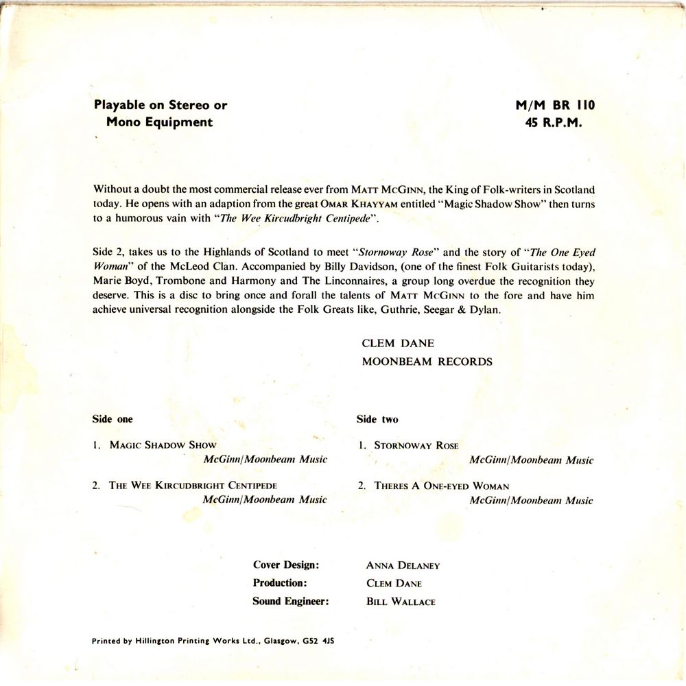 Without a doubt the most commercial release ever from Matt McGinn, the King of Folk-writers in Scotland today. He opens with an adaptation from the great Omar Khayyam entitled "Magic Shadow Show" then turns to a humorous vain with "The Wee Kircudbright Centipede". Side 2, takes us to the Highlands of Scotland to meet "Stornoway Rose" and the story of "The One Eyed Woman" of the McLeod Clan.