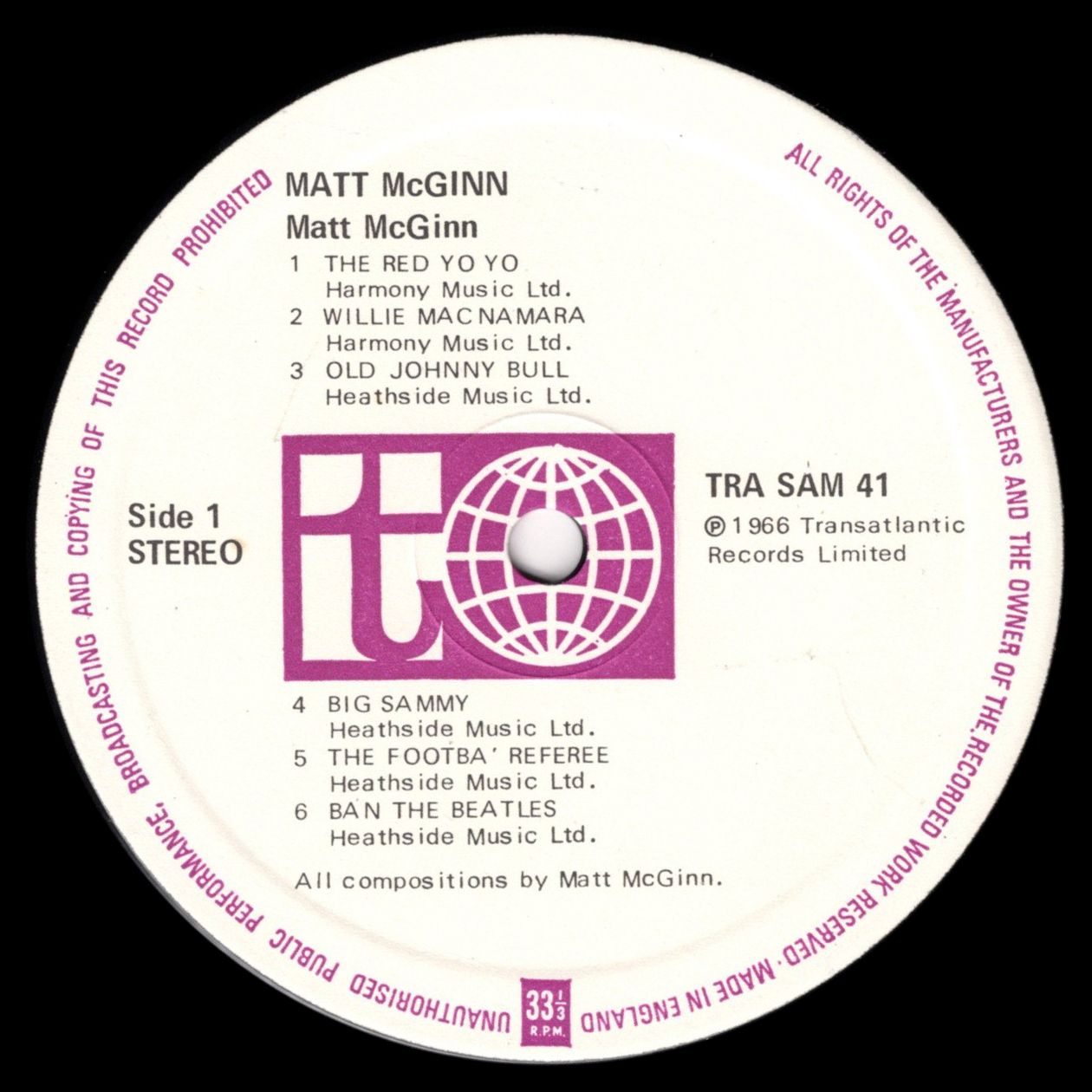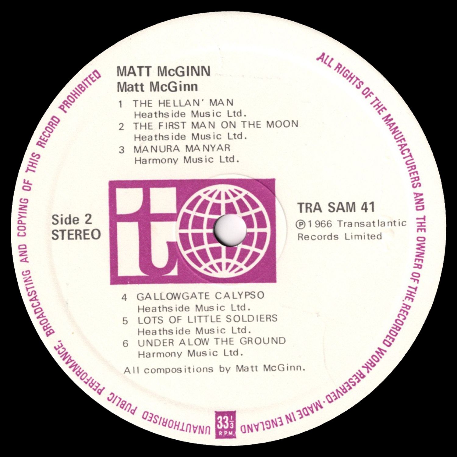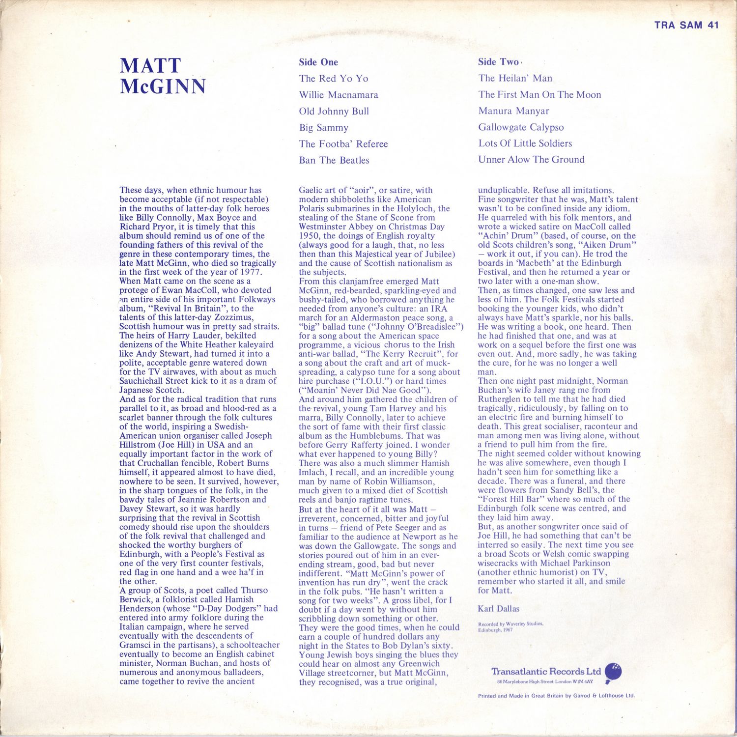 These days, when ethnic humour has become acceptable (if not respectable) in the mouths of latter-day folk heroes like Billy Connolly, Max Boyce and Richard Pryor, it is timely that this album should remind us of one of the founding fathers of this revival of the genre in these contemporary times, the late Matt McGinn, who died so tragically in the first week of the year of 1977. When Matt came on the scene as a protege of Ewan MacColl, who devoted an entire side of his important Folkways album, "Revival In Britain", to the talents of this latter-day Zozzimus, Scottish humour was in pretty sad straits. The heirs of Harry Lauder, bekilted denizens of the White Heather kaleyaird like Andy Stewart, had turned it into a polite, acceptable genre watered down for the TV airwaves, with about as much Sauchiehall Street kick to it as a dram of Japanese Scotch.