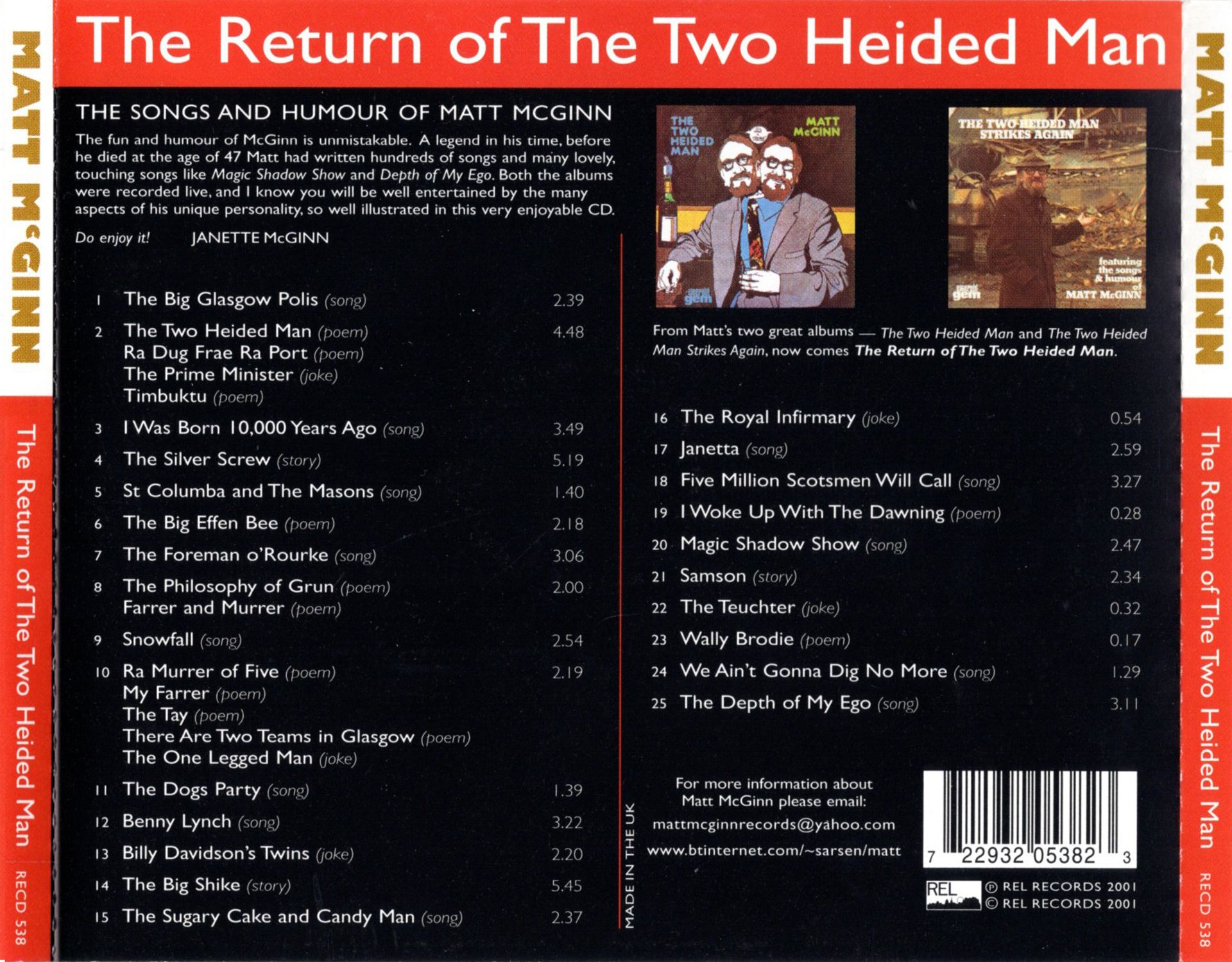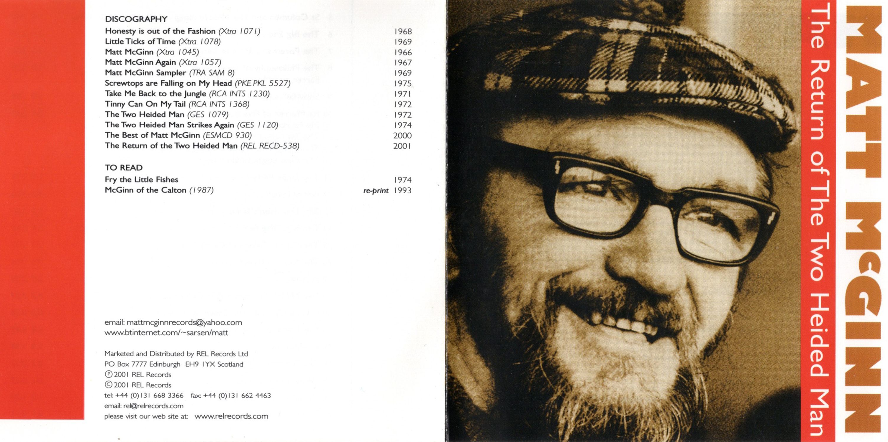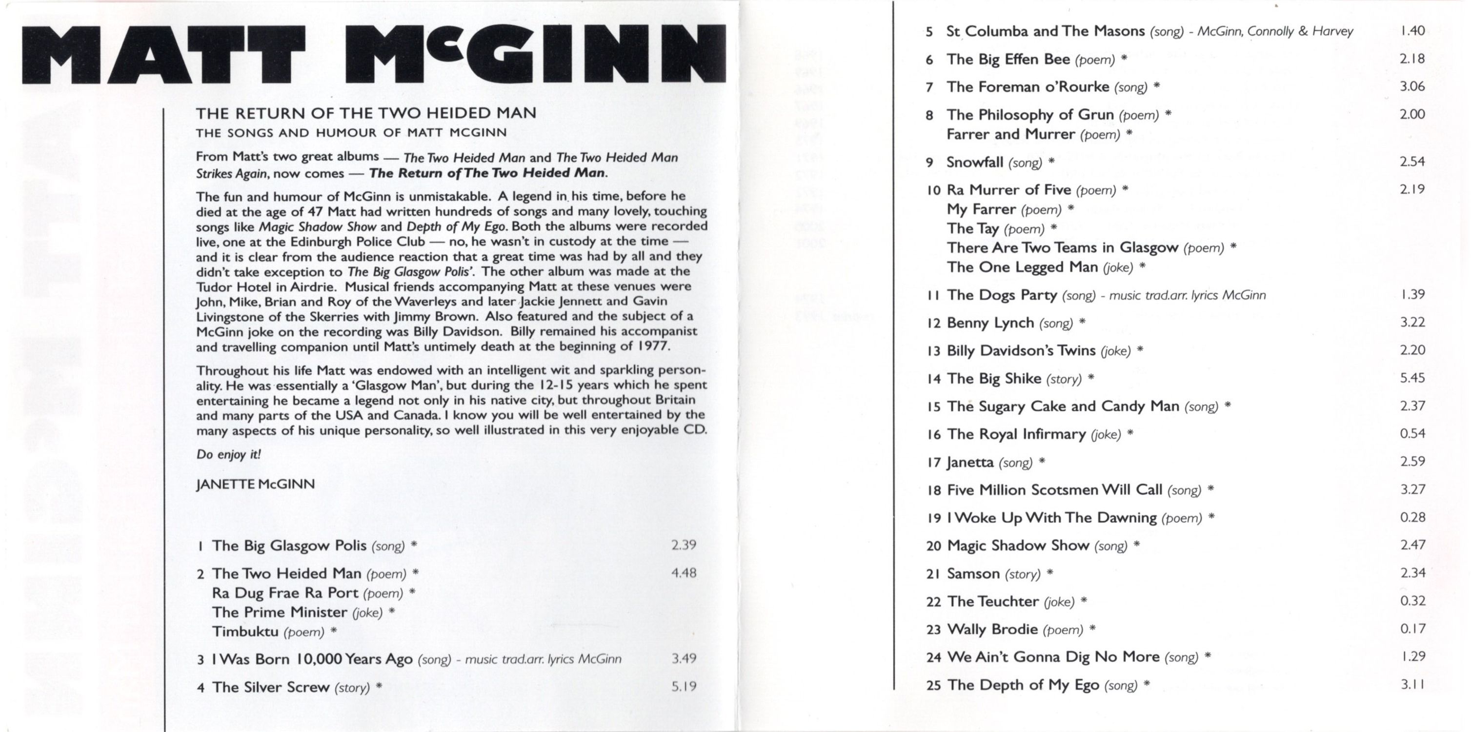 The fun and humour of McGinn is unmistakable. A legend in his time, before he died at the age of 47 Matt had written hundreds of songs and many lovely, touching songs like Magic Shadow Show and Depth of My Ego. Both the albums were recorded live, one at the Edinburgh Police Club — no, he wasn't in custody at the time — and it is clear from the audience reaction that a great time was had by all and they didn't take exception to The Big Glasgow Polls'. The other album was made at the Tudor Hotel in Airdrie. Musical friends accompanying Matt at these venues were John, Mike, Brian and Roy of the Waverleys and later Jackie Jennett and Gavin Livingstone of the Skerries with Jimmy Brown. Also featured and the subject of a McGinn joke on the recording was Billy Davidson. Billy remained his accompanist and traveling companion until Matt's untimely death at the beginning of 1977. Throughout his life Matt was endowed with an intelligent wit and sparkling personality. He was essentially a Glasgow Man, but during the 12-15 years which he spent entertaining he became a legend not only in his native city, but throughout Britain and many parts of the USA and Canada. I know you will be well entertained by the many aspects of his unique personality, so well illustrated in this very enjoyable CD.