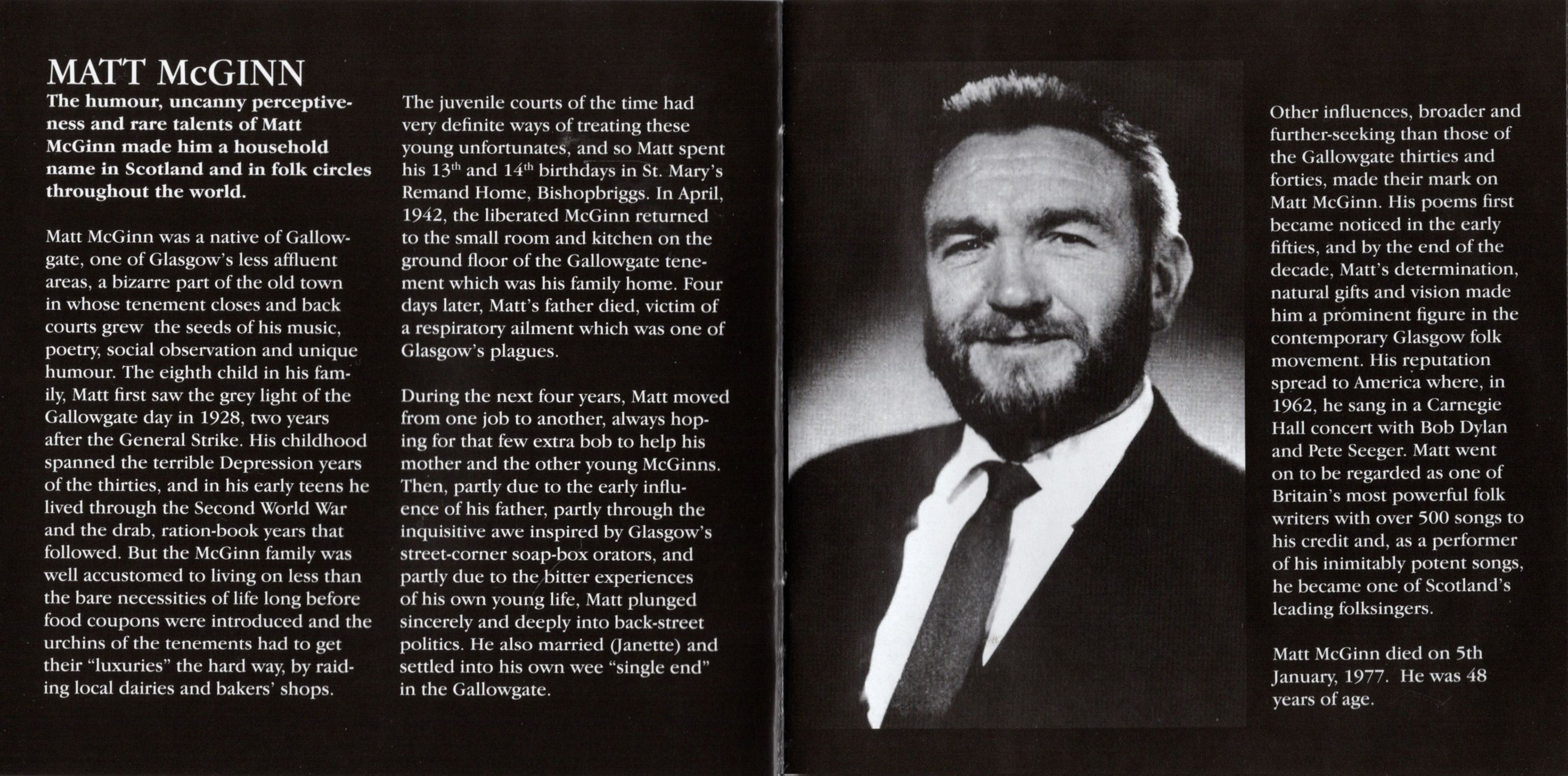 Matt McGinn was a native of Gallowgate, one of Glasgow's less affluent areas, a bizarre part of the old town in whose tenement closes and back courts grew the seeds of his music, poetry, social observation and unique humour. The eighth child in his family, Matt first saw the grey light of the Gallowgate day in 1928, two years after the General Strike. His childhood spanned the terrible Depression years of the thirties, and in his early teens he lived through the Second World War and the drab, ration-,book years that followed. But the McGinn family was well accustomed to living on less than the bare necessities of life long before food coupons were introduced and the urchins of the tenements had to get their "luxuries" the hard way, by raiding local dairies and bakers' shops. The juvenile courts of the time had very definite ways of treating these young unfortunates, and so Matt spent his 13th and 14th birthdays in St. Mary's Remand Home, Bishopbriggs. In April, 1942, the liberated McGinn returned to the small room and kitchen on the ground floor of the Gallowgate tenement which was his family home. Four days later, Matt's father died, victim of a respiratory ailment which was one of Glasgow's plagues.