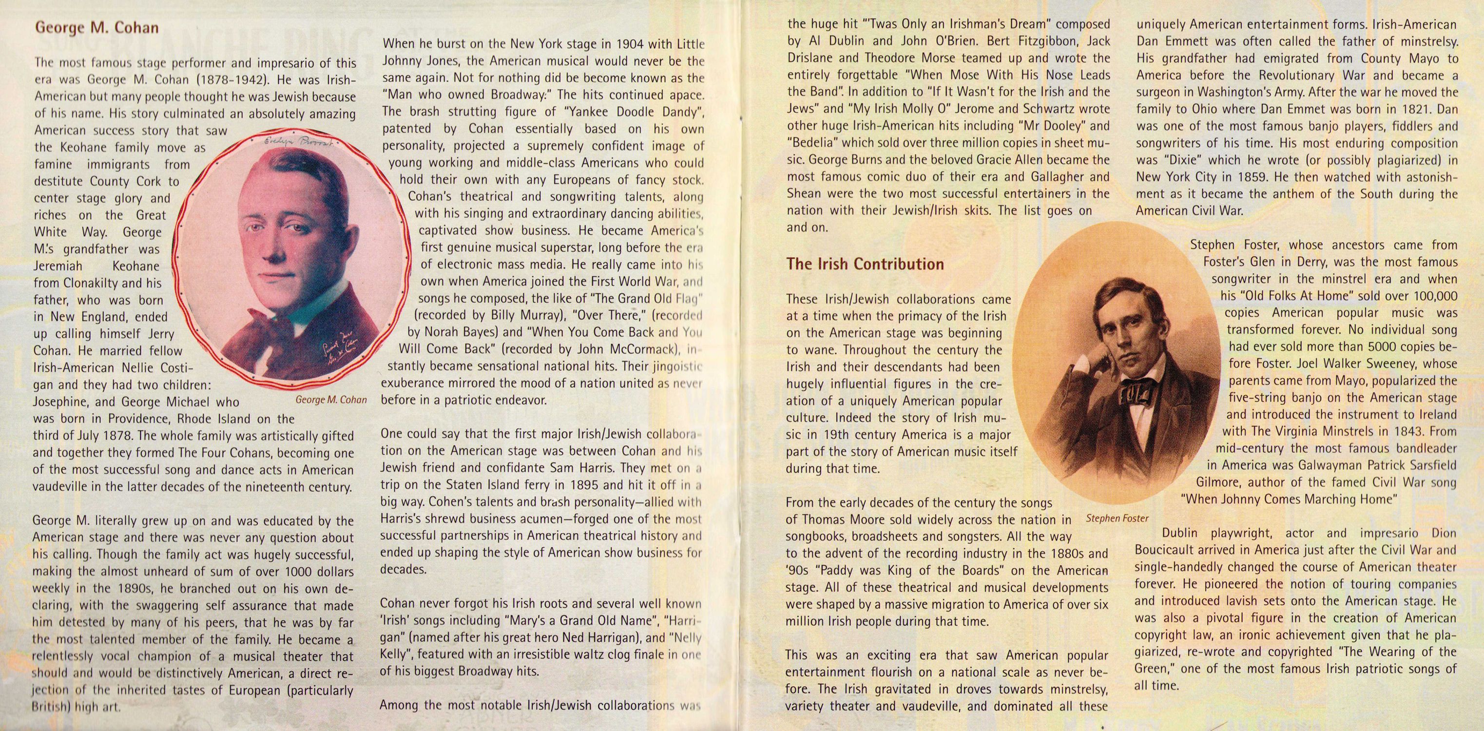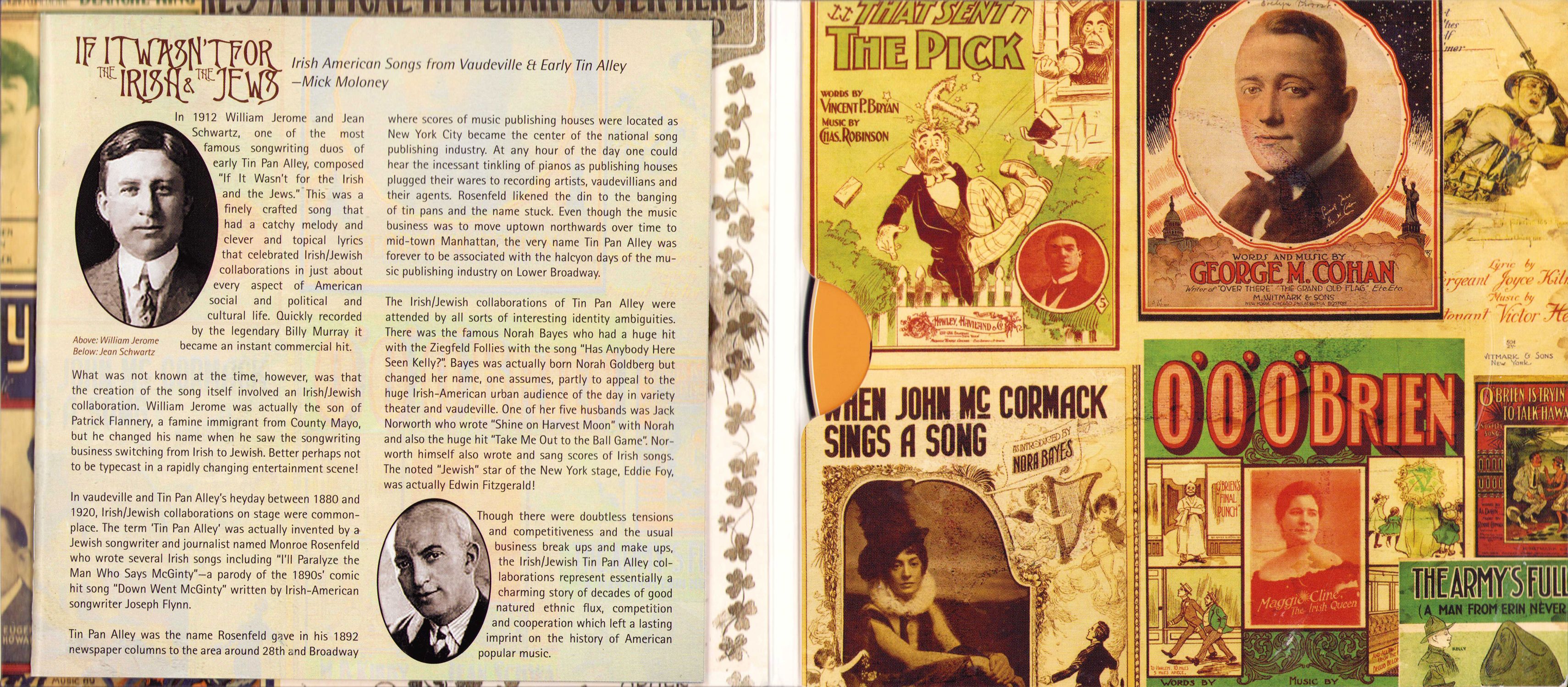 Among the most notable Irish/Jewish collaborations was the huge hit "'Twas Only an Irishman's Dream" composed by Al Dublin and John O'Brien. Bert Fitzgibbon, Jack Drislane and Theodore Morse teamed up and wrote the entirely forgettable "When Mose With His Nose Leads the Band". In addition to "If It Wasn't for the Irish and the Jews" and "My Irish Molly O" Jerome and Schwartz wrote other huge Irish-American hits including "Mr Dooley" and "Bedelia" which sold over three million copies in sheet music. George Burns and the beloved Gracie Allen became the most famous comic duo of their era and Gallagher and Shean were the two most successful entertainers in the nation with their Jewish/lrish skits. The list goes on and on.