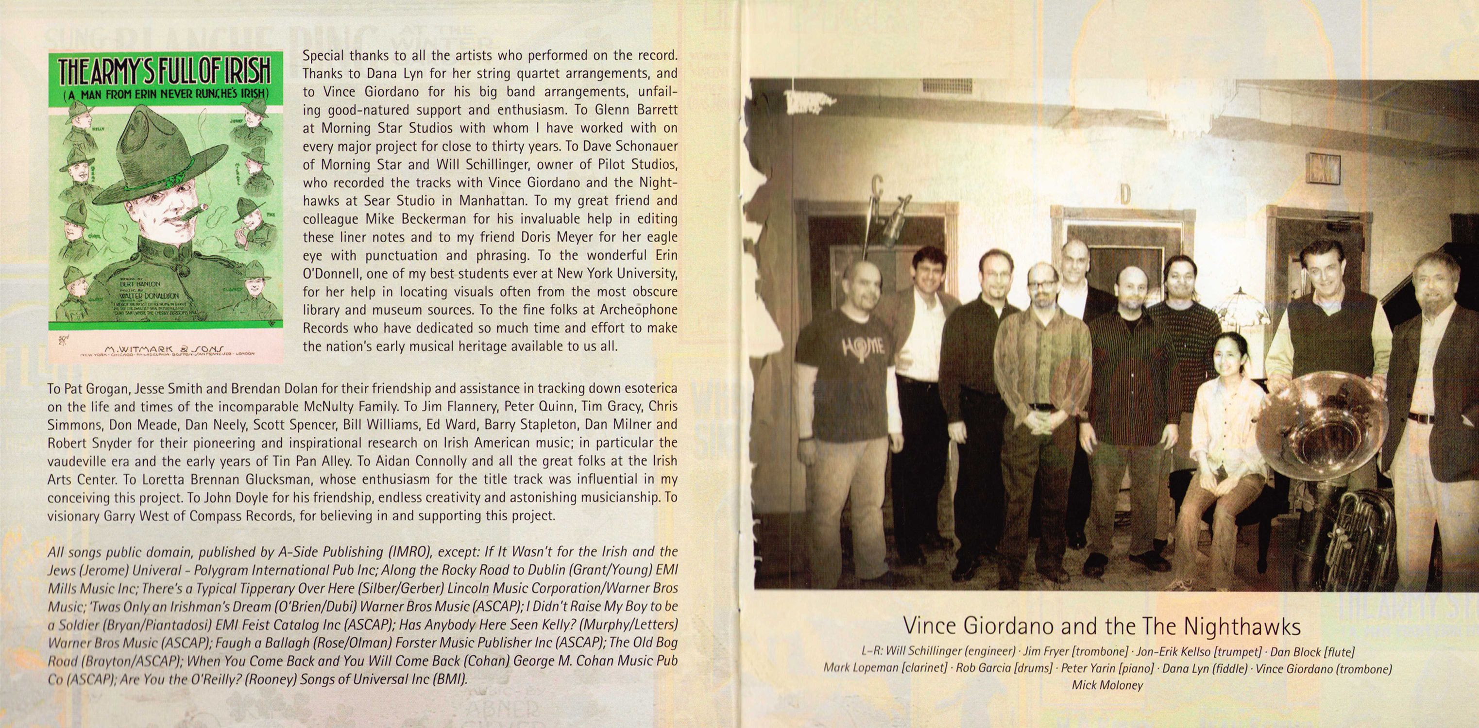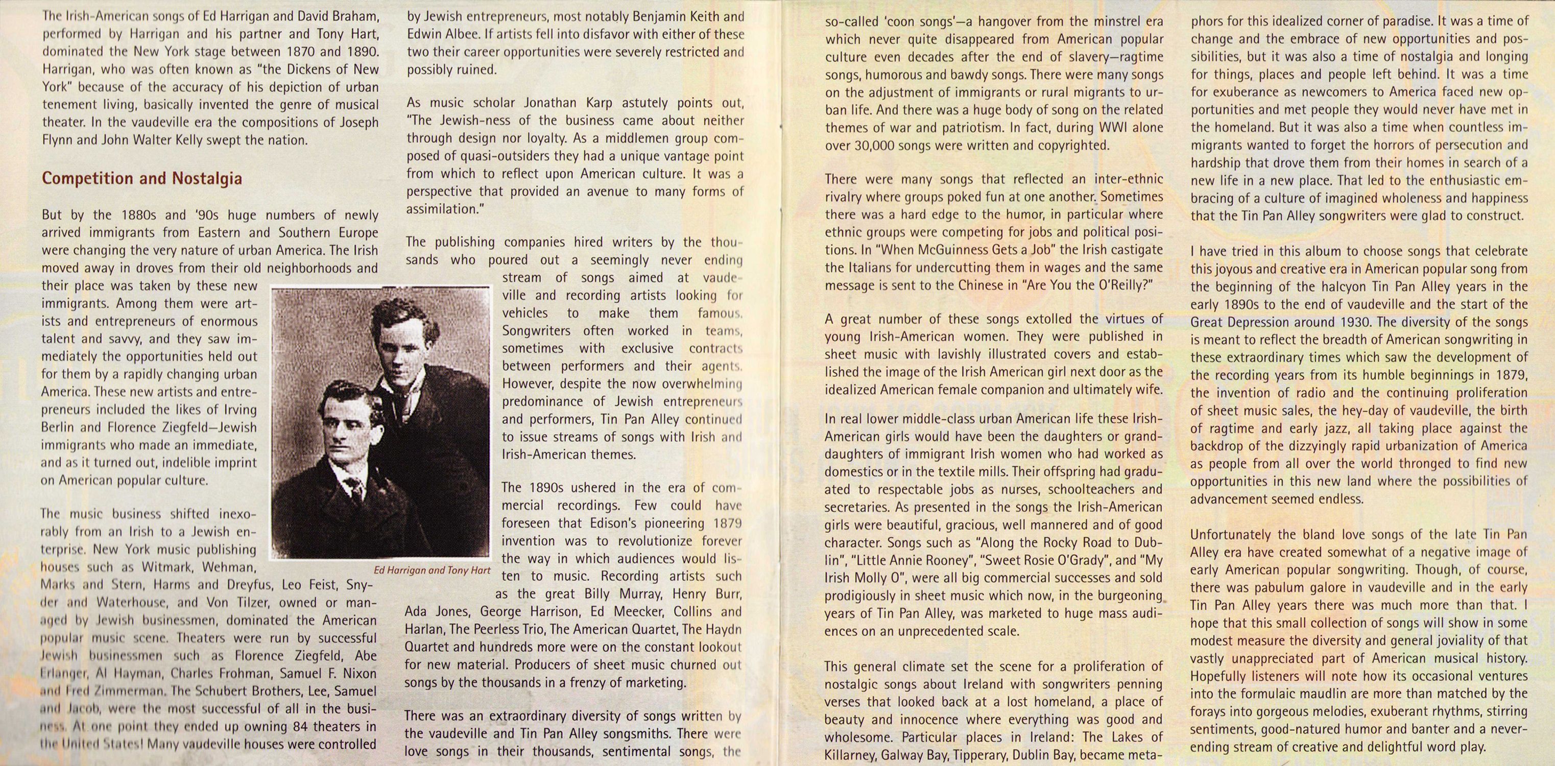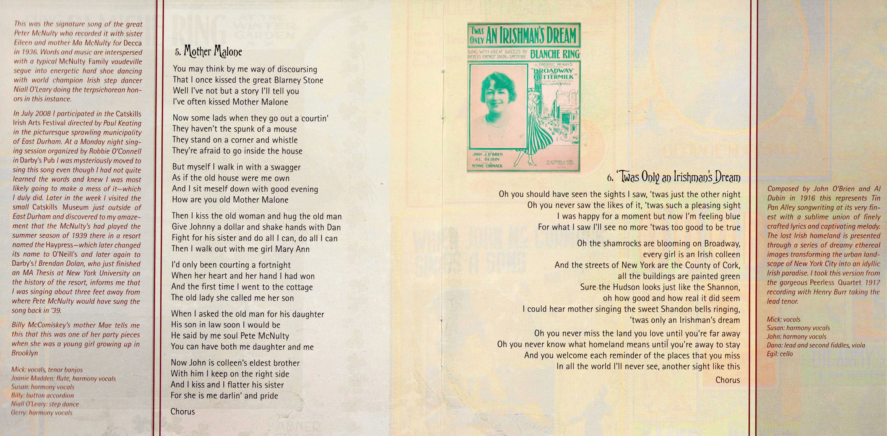To Pat Grogan, Jesse Smith and Brendan Dolan for their friendship and assistance in tracking down esoterica on the life and times of the incomparable McNulty Family. To Jim Flannery, Peter Quinn, Tim Gracy, Chris Simmons, Don Meade, Dan Neely, Scott Spencer, Bill Williams, Ed Ward, Barry Stapleton, Dan Milner and Robert Snyder for their pioneering and inspirational research on Irish American music; in particular the vaudeville era and the early years of Tin Pan Alley To Aidan Connolly and all the great folks at the Irish Arts Center. To Loretta Brennan Glucksman, whose enthusiasm for the title track was influential in my conceiving this project. To John Doyle for his friendship, endless creativity and astonishing musicianship. To visionary Garry West of Compass Records, for believing in and supporting this project.