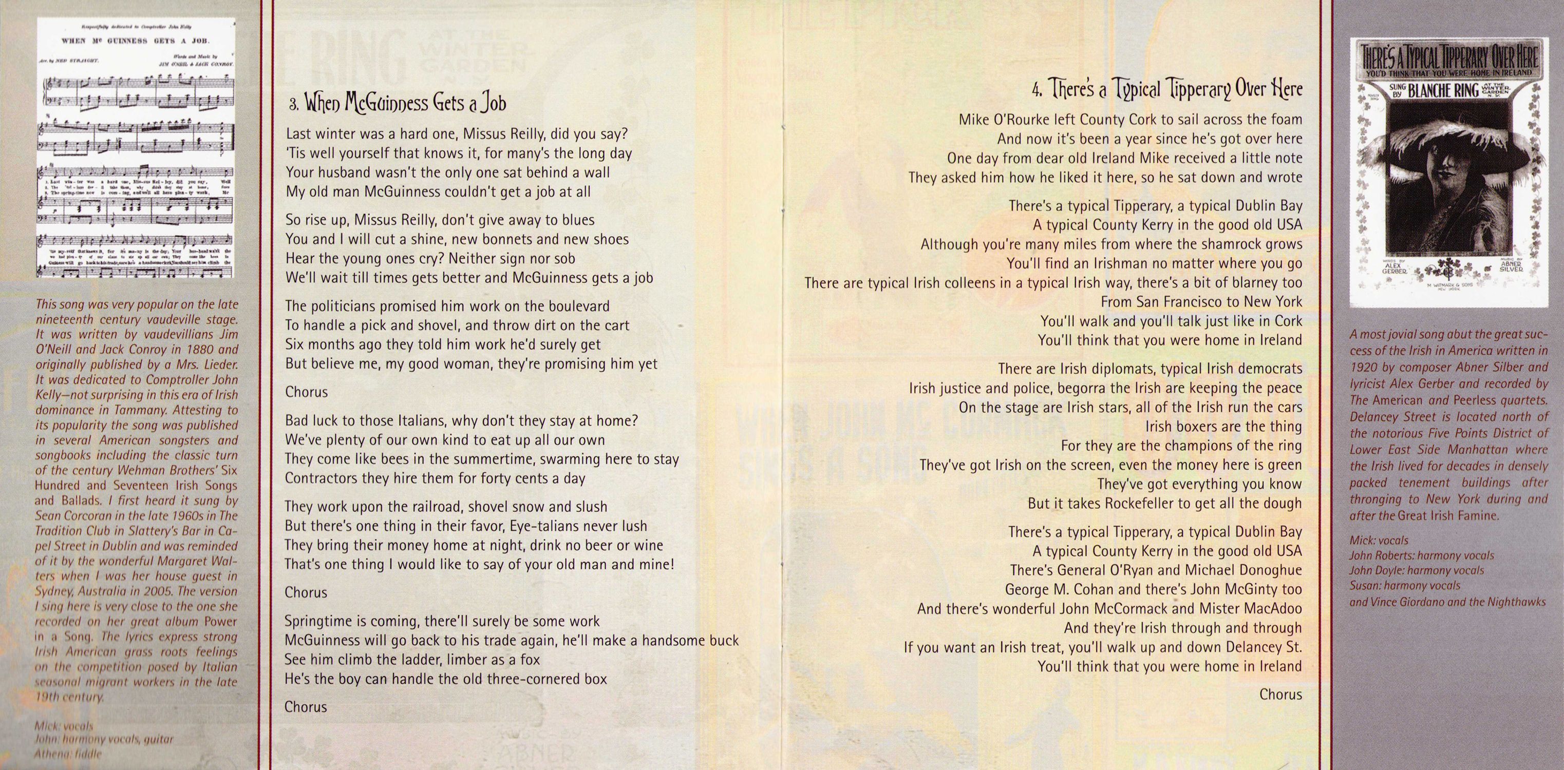 When McGuinness Gets a job — This song was very popular on the late nineteenth century vaudeville stage. It was written by vaudevillians Jim O'Neill and Jack Conroy in 1880 and originally published by a Mrs. Lieder. It was dedicated to Comptroller John Kelly — not surprising in this era of Irish dominance in Tammany. Attesting to its popularity the song was published in several American songsters and songbooks including the classic turn of the century Wehman Brothers' Six Hundred and Seventeen Irish Songs and Ballads. I first heard it sung by Sean Corcoran in the late 1960s in The Tradition Club in Slattery's Bar in Cape! Street in Dublin and was reminded of it by the wonderful Margaret Walters when I was her house guest in Sydney, Australia in 2005. The version I sing here is very close to the one she recorded on her great album Power in a Song. The lyrics express strong lush American grass roots feelings on I he competition posed by Italian seasonal migrant workers in the late 19th century.