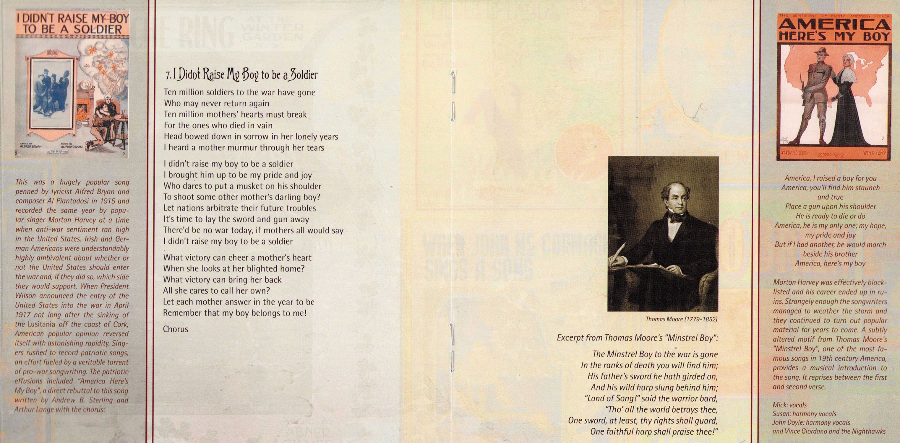 I Didn't Raise My Boy to be a Soldier — This was a hugely popular song penned by lyricist Alfred Bryan and composer Al Piantadosi in 1915 and recorded the same year by popular singer Morton Harvey at a time when anti-war sentiment ran high in the United States. Irish and German Americans were understandably highly ambivalent about whether or not the United States should enter the war and, if they did so, which side they would support. When President Wilson announced the entry of the United States into the war in April 1917 not long after the sinking of the Lusitania off the coast of Cork, American popular opinion reversed itself with astonishing rapidity. Singers rushed to record patriotic songs, an effort fueled by a veritable torrent of pro-war songwriting. The patriotic effusions included "America Here's My Boy", a direct rebuttal to this song written by Andrew B. Sterling and Arthur Lange with the chorus: