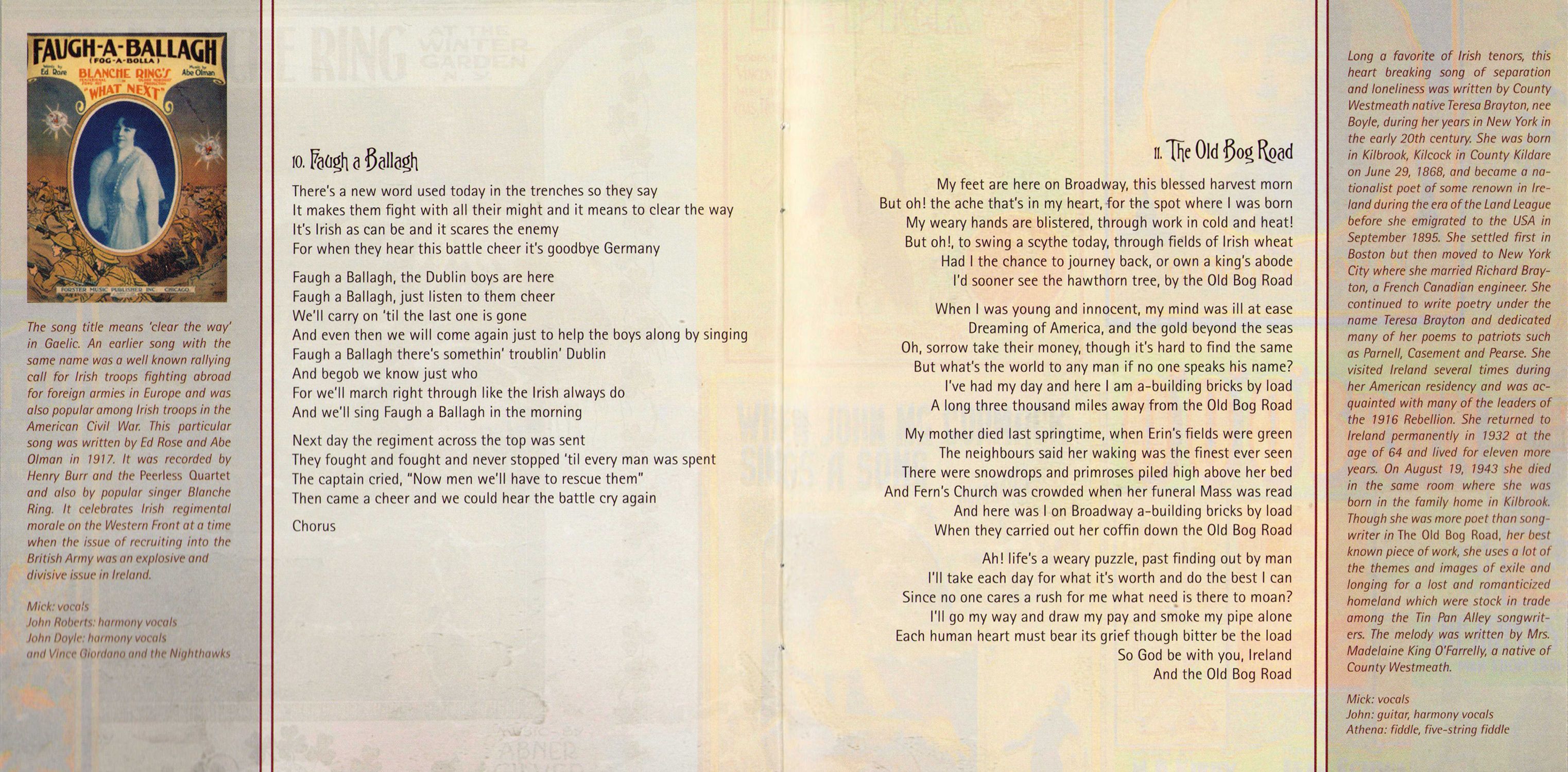 Faugh a Ballagh — The song title means 'clear the way' in Gaelic. An earlier song with the same name was a well known rallying call for Irish troops fighting abroad for foreign armies in Europe and was also popular among Irish troops in the American Civil War. This particular song was written by Ed Rose and Abe Olman in 1917. It was recorded by Henry Burr and the Peerless Quartet and also by popular singer Blanche Ring. It celebrates Irish regimental morale on the Western Front at a time when the issue of recruiting into the British Army was an explosive and divisive issue in Ireland.