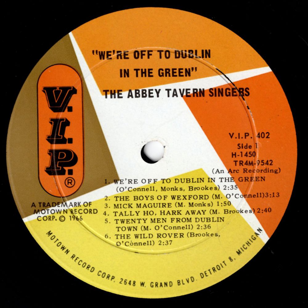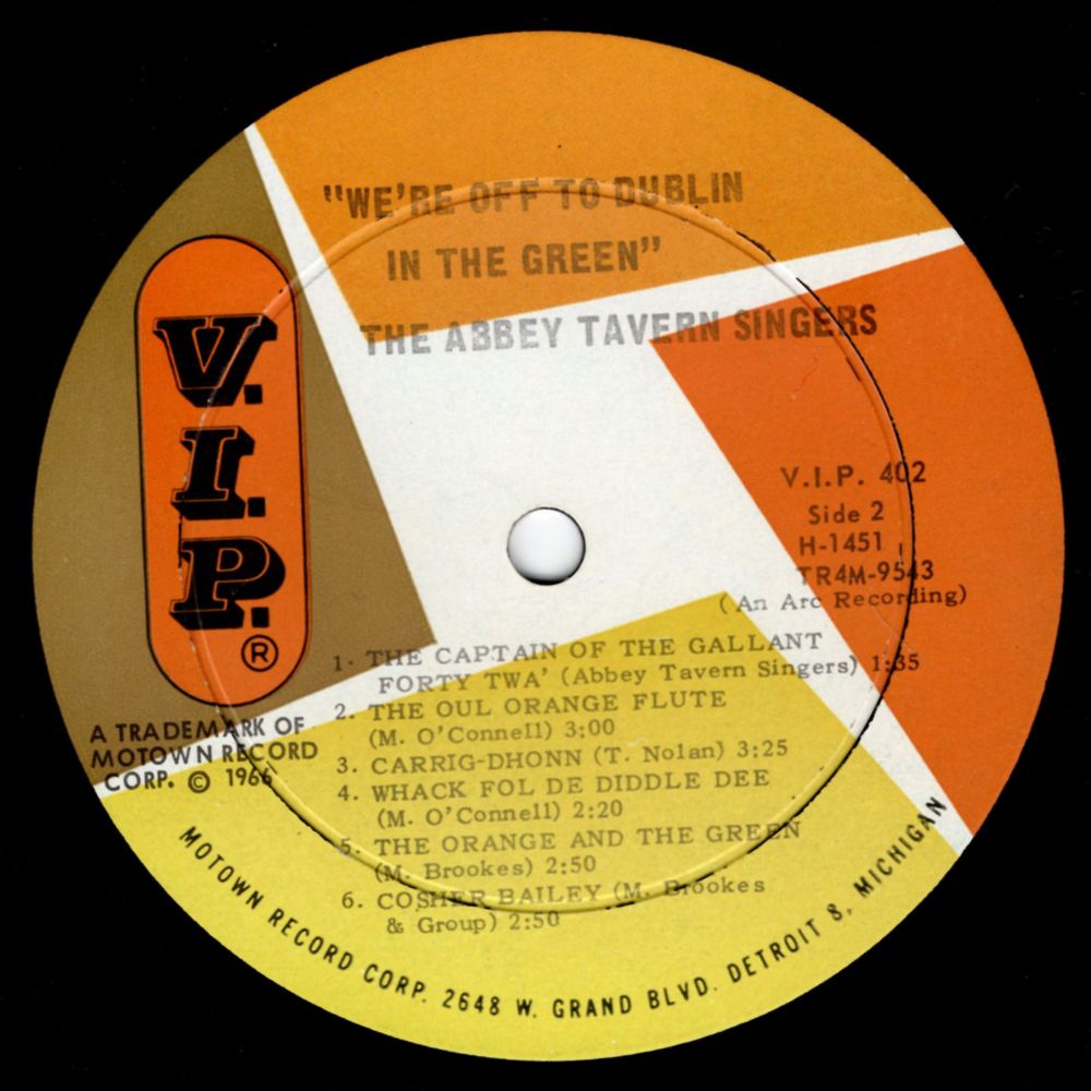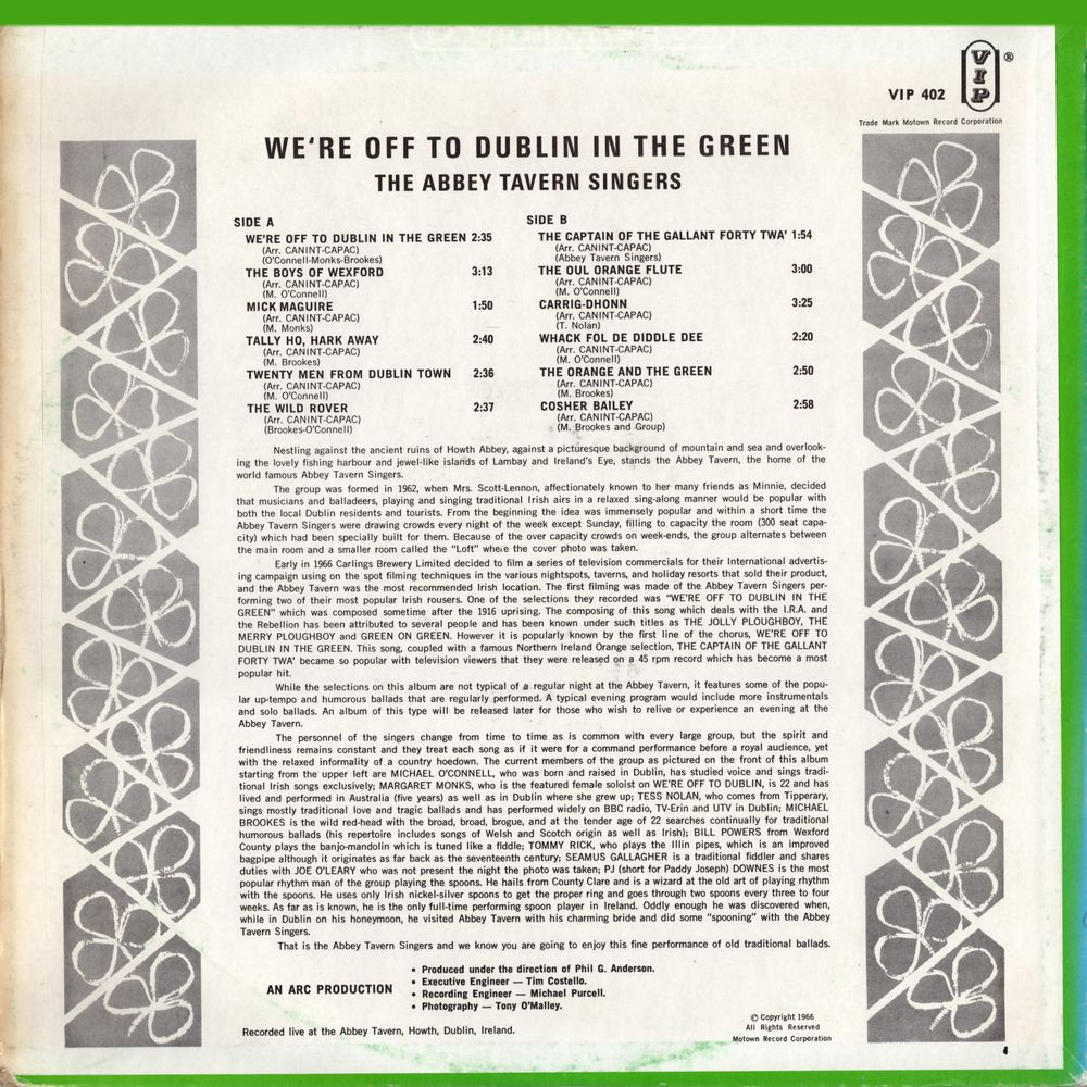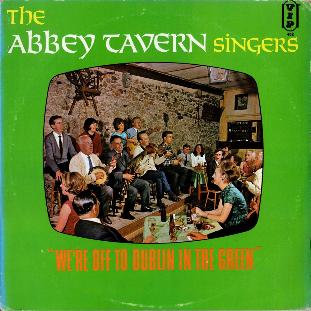 Early in 1966 Carlings Brewery Limited decided to film a series of television commercials for their International advertising campaign using on the spot filming techniques in the various nightspots, taverns, and holiday resorts that sold their product, and the Abbey Tavern was the most recommended Irish location. The first filming was made of the Abbey Tavern Singers performing two of their most popular Irish rousers. One of the selections they recorded was "WE'RE OFF TO DUBLIN IN THE GREEN" which was composed sometime after the 1916 uprising. The composing of this song which deals with the I.R.A. and the Rebellion has been attributed to several people and has been known under such titles as THE JOLLY PLOUGHBOY, THE MERRY PLOUGHBOY and GREEN ON GREEN. However it is popularly known by the first line of the chorus, WE'RE OFF TO DUBLIN IN THE GREEN. This song, coupled with a famous Northern Ireland Orange selection, THE CAPTAIN OF THE GALLANT FORTY TWA' became so popular with television viewers that they were released on a 45 rpm record which has become a most popular hit.