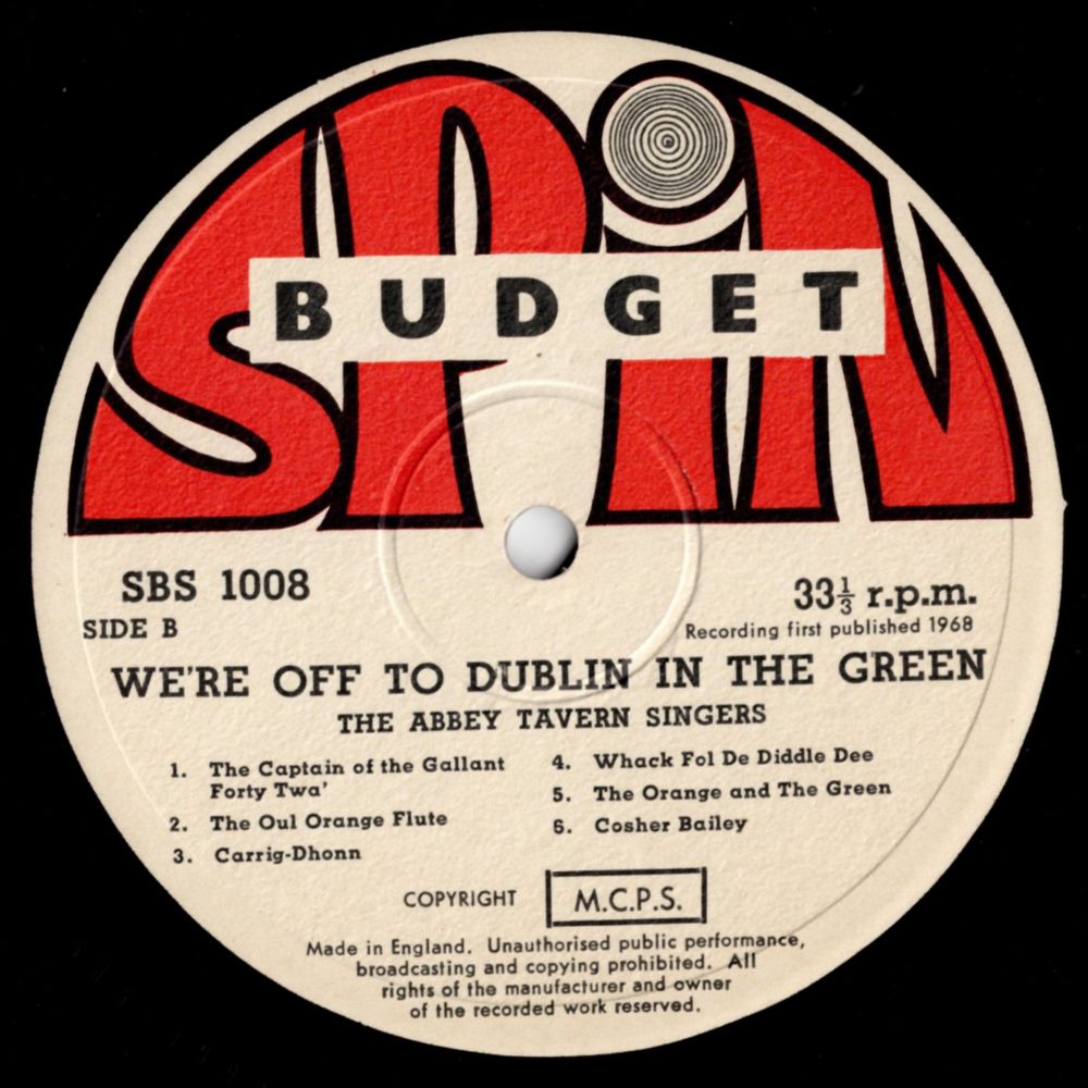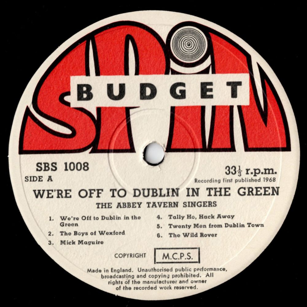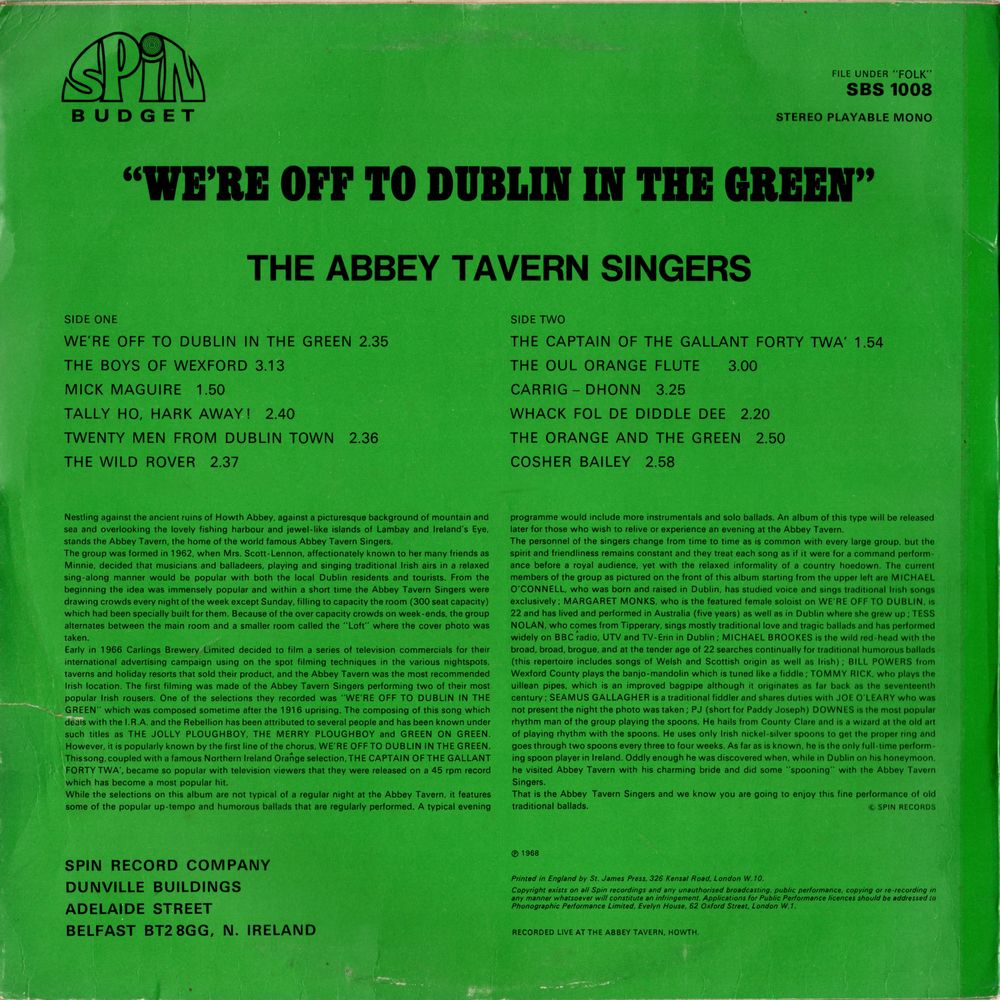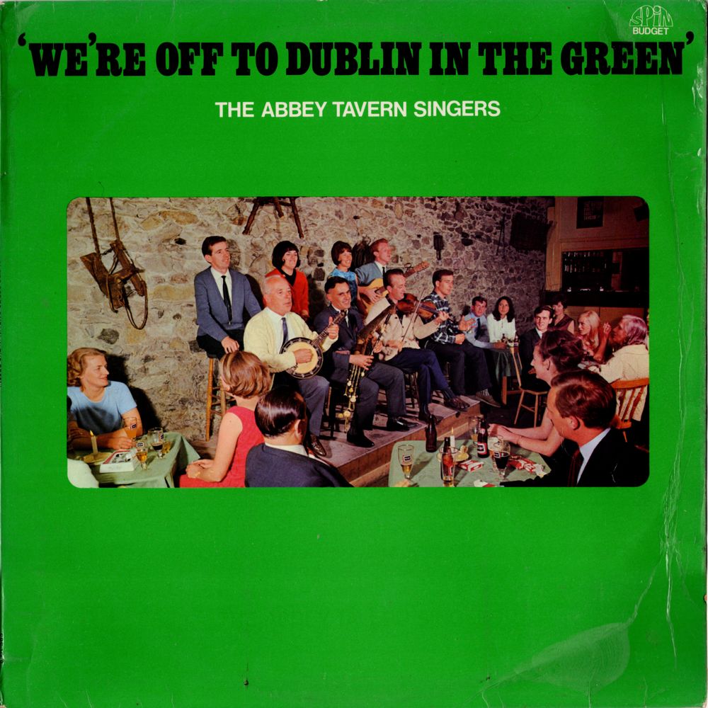 Early in 1966 Carlings Brewery Limited decided to film a series of television commercials for their international advertising campaign using on the spot filming techniques in the various nightspots, taverns and holiday resorts that sold their product, and the Abbey Tavern was the most recommended Irish location. The first filming was made of the Abbey Tavern Singers performing two of their most popular Irish rousers. One of the selections they recorded was "WE RE OFF TO DUBLIN IN THE GREEN" which was composed sometime after the 1916 uprising. The composing of this song which deals with the I.R.A. and the Rebellion has been attributed to several people and has been known under such titles as THE JOLLY PLOUGHBOY, THE MERRY PLOUGHBOY and GREEN ON GREEN. However, it is popularly known by the first line of the chorus, WE'RE OFF TO DUBLIN IN THE GREEN. This song, coupled with a famous Northern Ireland Orange selection, THE CAPTAIN OF THE GALLANT FORTY TWA', became so popular with television viewers that they were released on a 45 rpm record which has become a most popular hit.