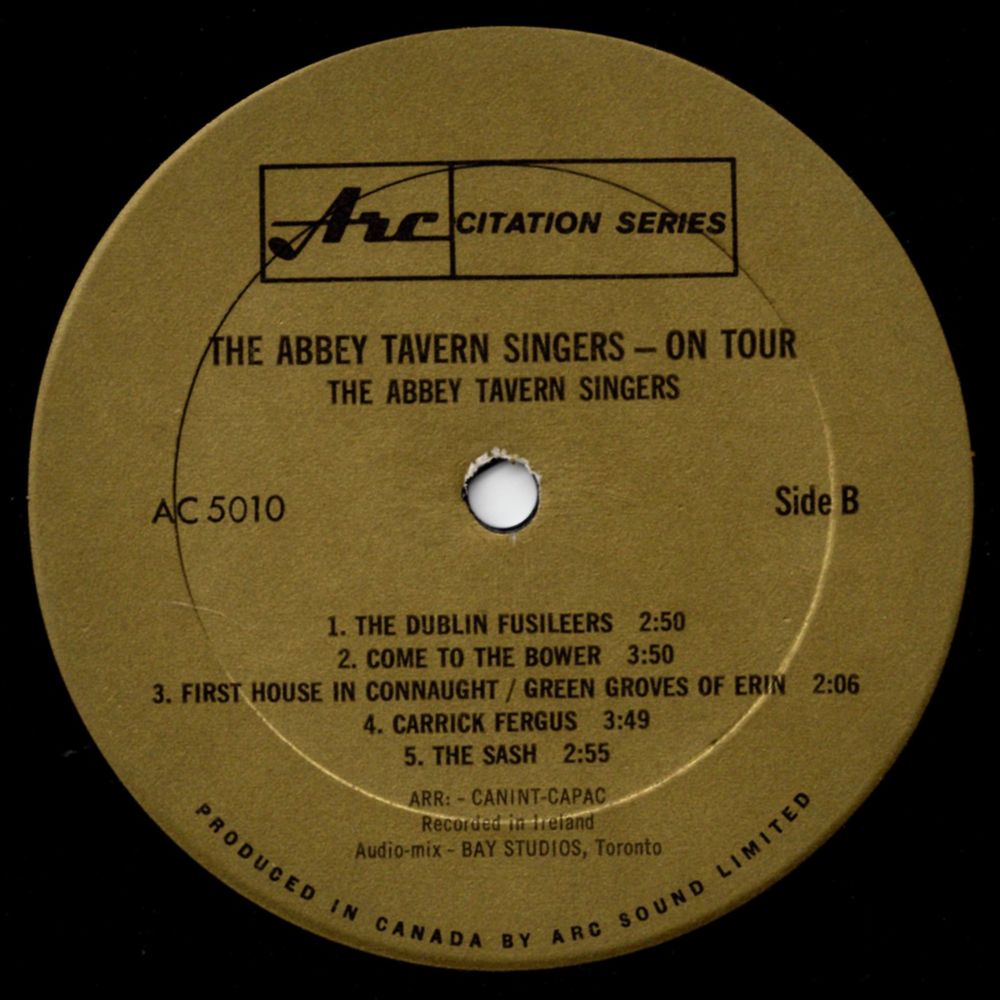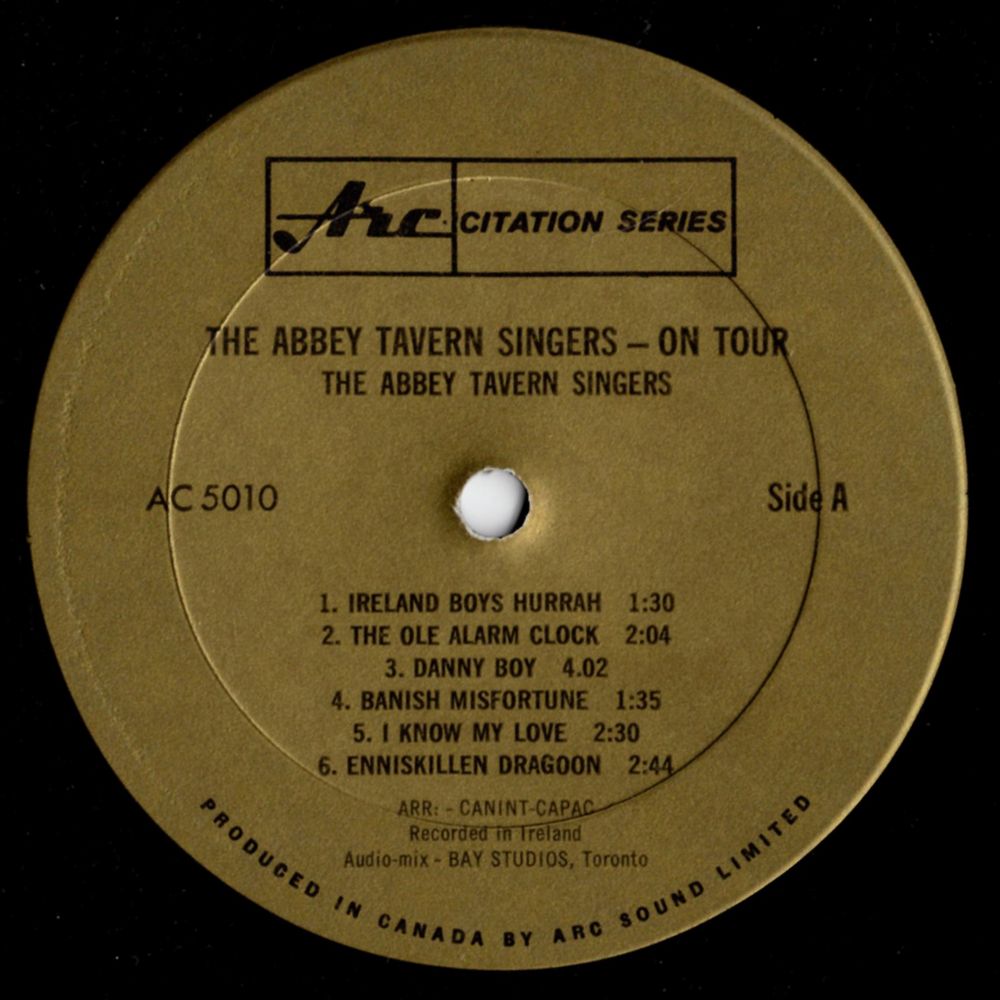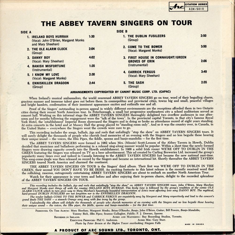 THE ABBEY TAVERN SINGERS ON TOUR is the Singers' third album. Their first was WE'RE OFF TO DUBLIN IN THE GREEN, their second YOU DON'T HAVE TO BE IRISH. An exciting footnote to this latest release is the recently received word that the rollicking, raucous, outrageously entertaining ABBEY TAVERN SINGERS are about to embark on another North American Tour.