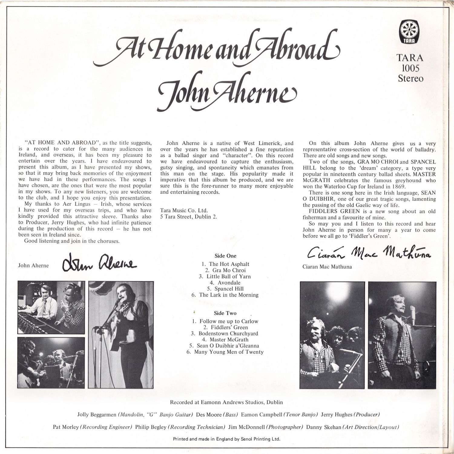 John Aherne is a native of West Limerick, and over the years he has established a fine reputation as a ballad singer and "character". On this record we have endeavoured to capture the enthusiasm, gutsy singing, and spontaneity which emanates from this man on the stage. His popularity made it imperative that this album be produced, and we are sure this is the fore-runner to many more enjoyable and entertaining records.