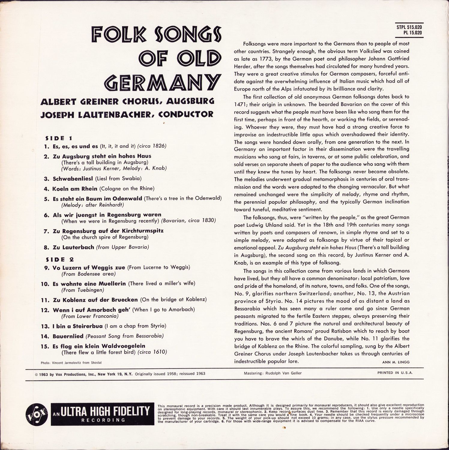 The first collection of old anonymous German folksongs dates back to 1471; their origin in unknown. The bearded Bavarian on the cover of this record suggests what the people must have been like who sang them for the first time, perhaps in front of the hearth, or working the fields, or serenading. Whoever they were, they must have had a strong creative force to improvise an indestructible little opus which overshadowed their identity. The songs were handed down orally, from one generation to the next. In Germany an important factor in their dissemination were the travelling musicians who sang at fairs, in taverns, or at some public celebration, and sold verses on separate sheets of paper to the audience who sang with them until they knew the tunes by heart. The folksongs never became obsolete. The melodies underwent gradual metamorphosis in centuries of oral transmission and the words were adapted to the changing vernacular. But what remained unchanged were the simplicity of melody, rhyme and rhythm, the perennial popular philosophy, and the typically German inclination toward tuneful, meditative sentiment.