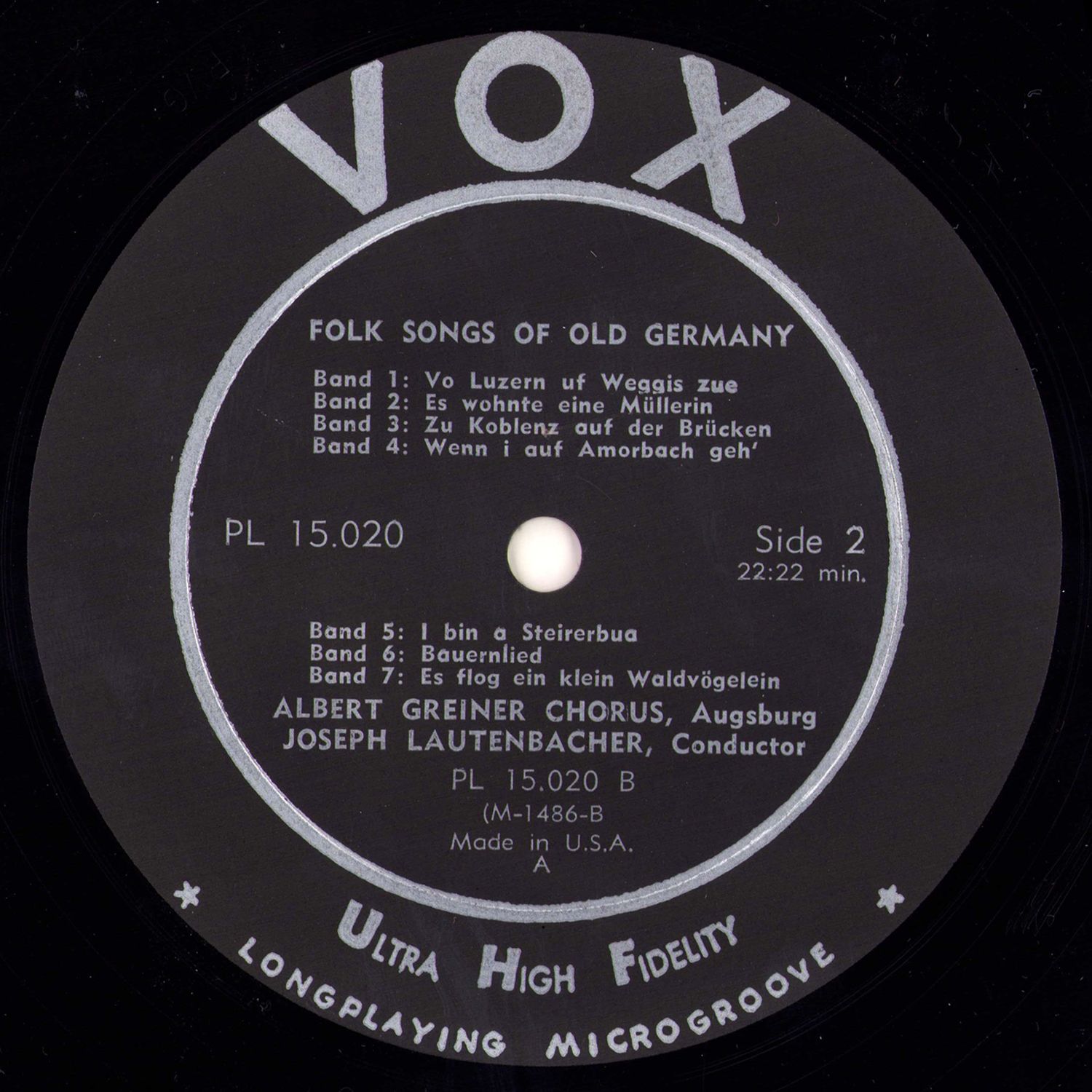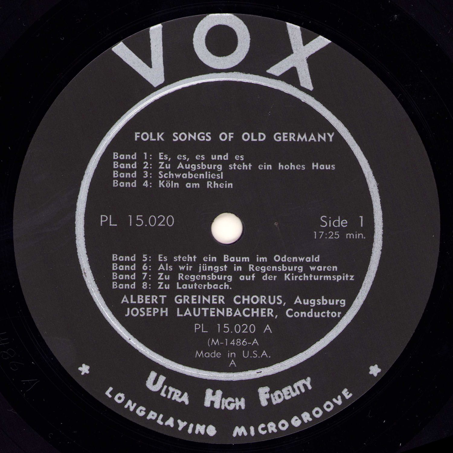 The songs in this collection come from various lands in which Germans have lived, but they all have a common denominator: local patriotism, love and pride of the homeland, of its nature, towns, and folks. One of the songs, No. 9, glorifies northern Switzerland; another, No. 13, the Austrian province of Styria. No. 14 pictures the mood of as distant a land as Bessarabia which has seen many a ruler come and go since German peasants migrated to the fertile Eastern steppes, always preserving their traditions. Nos. 6 and 7 picture the natural and architectural beauty of Regensburg, the ancient Romans' proud Ratisbon which to reach by boat you have to brave the whirls of the Danube, while No. 11 glorifies the bridge of Koblenz on the Rhine. The colorful sampling, sung by the Albert Greiner Chorus under Joseph Lautenbacher takes us through centuries of indestructible popular lore.