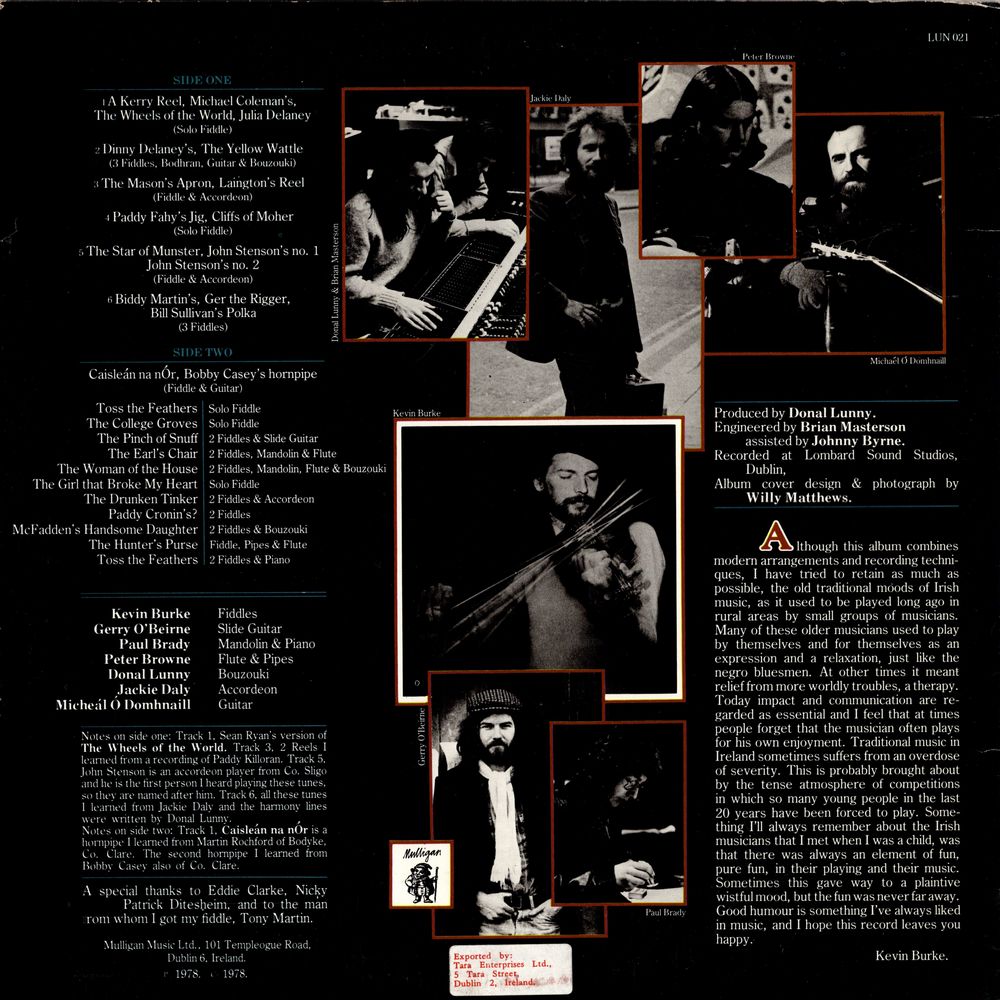 Although this album combines modem arrangements and recording techniques, I have tried to retain as much as possible, the old traditional moods of Irish music, as it used to be played long ago in rural areas by small groups of musicians. Many of these older musicians used to play by themselves and for themselves as an expression and a relaxation, just like the negro bluesmen. At other times it meant relief from more worldly troubles, a therapy. Today impact and communication are regarded as essential and I feel that at times people forget that the musician often plays for his own enjoyment. Traditional music in Ireland sometimes suffers from an overdose of severity. This probably brought about by the tense atmosphere of competitions in which so many young people in the last 20 years have been forced to play. Something I'll always remember about the Irish musicians that I met when I was a child, was that there was always an element of fun, pure fun, in their playing and their music. Sometimes this gave way to a plaintive wistful mood, but the fun was never far away. Good humour is something I've always liked in music, and I hope this record leaves you happy.