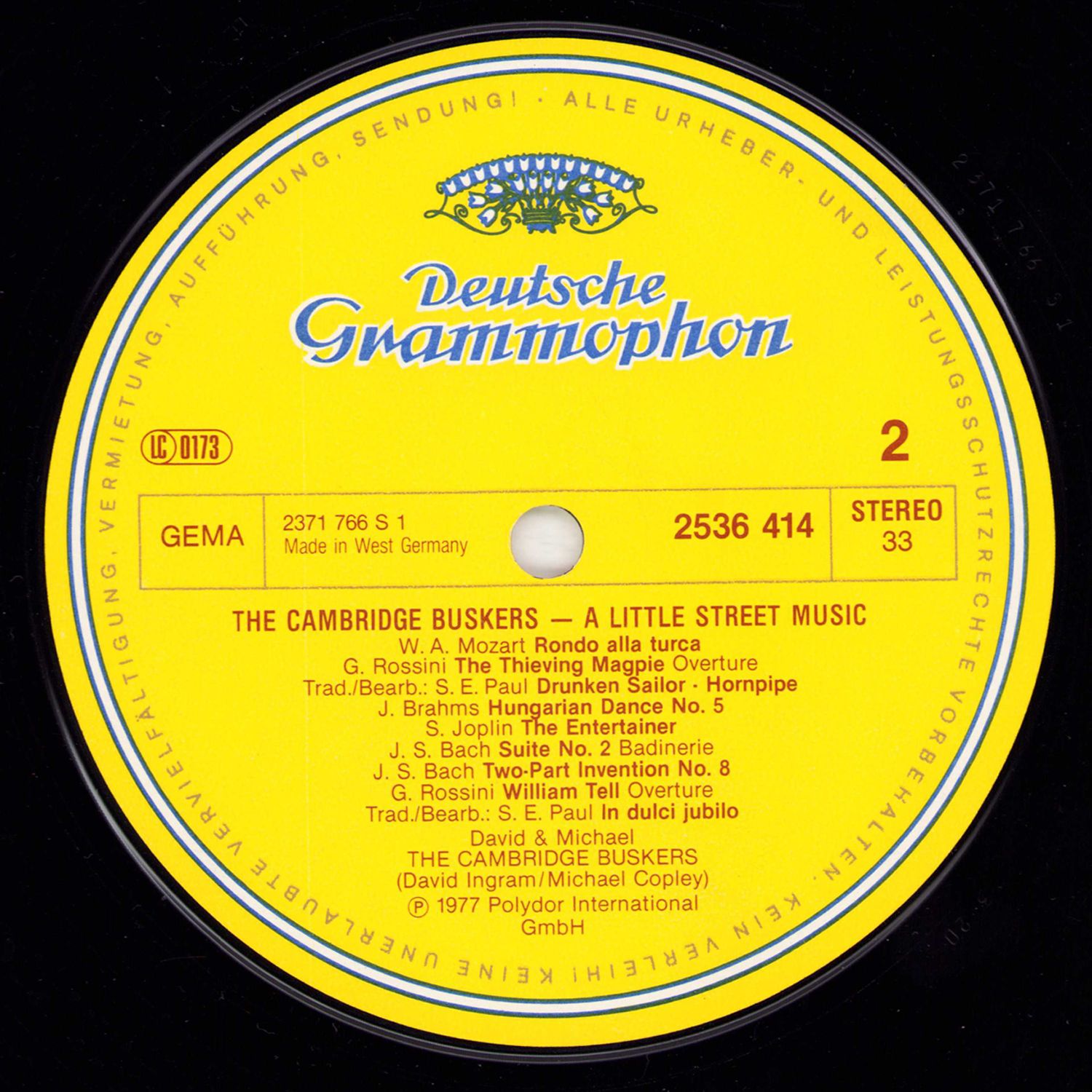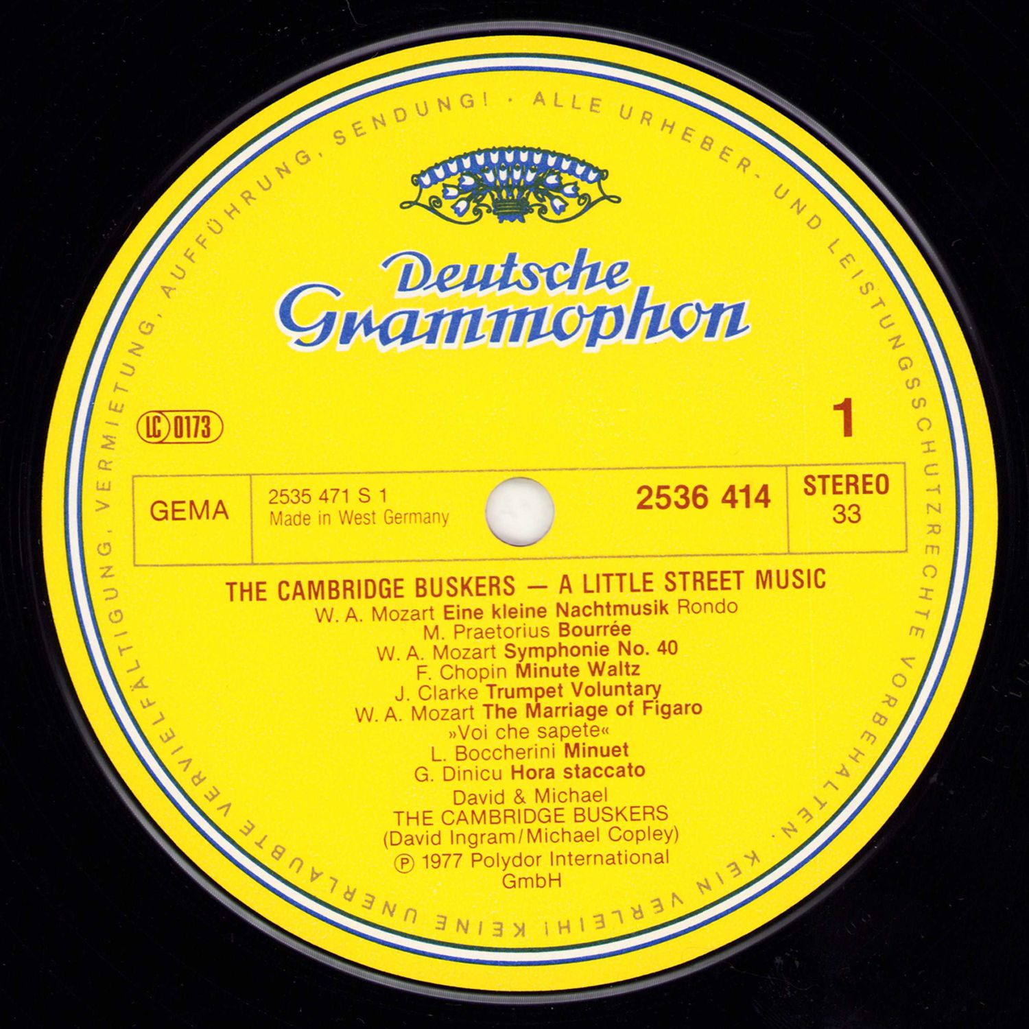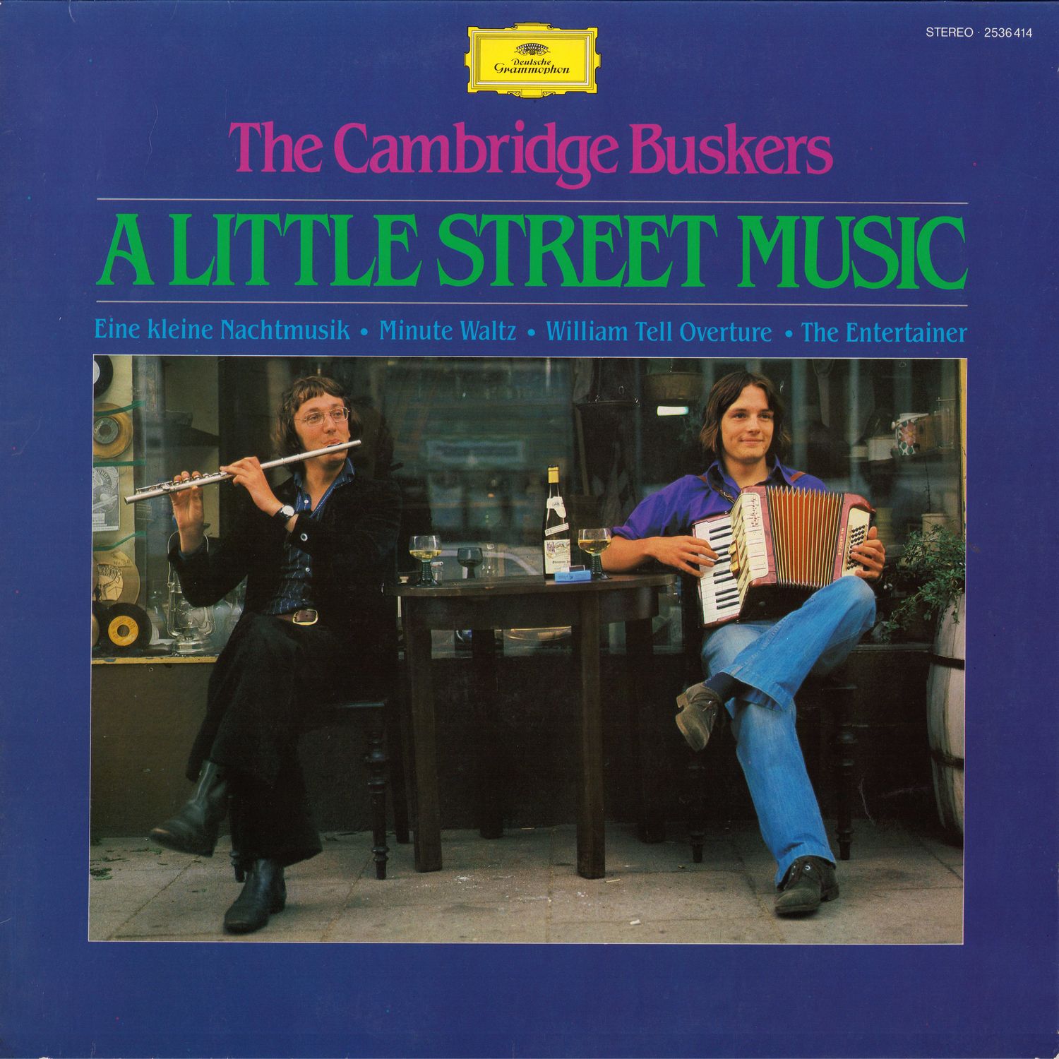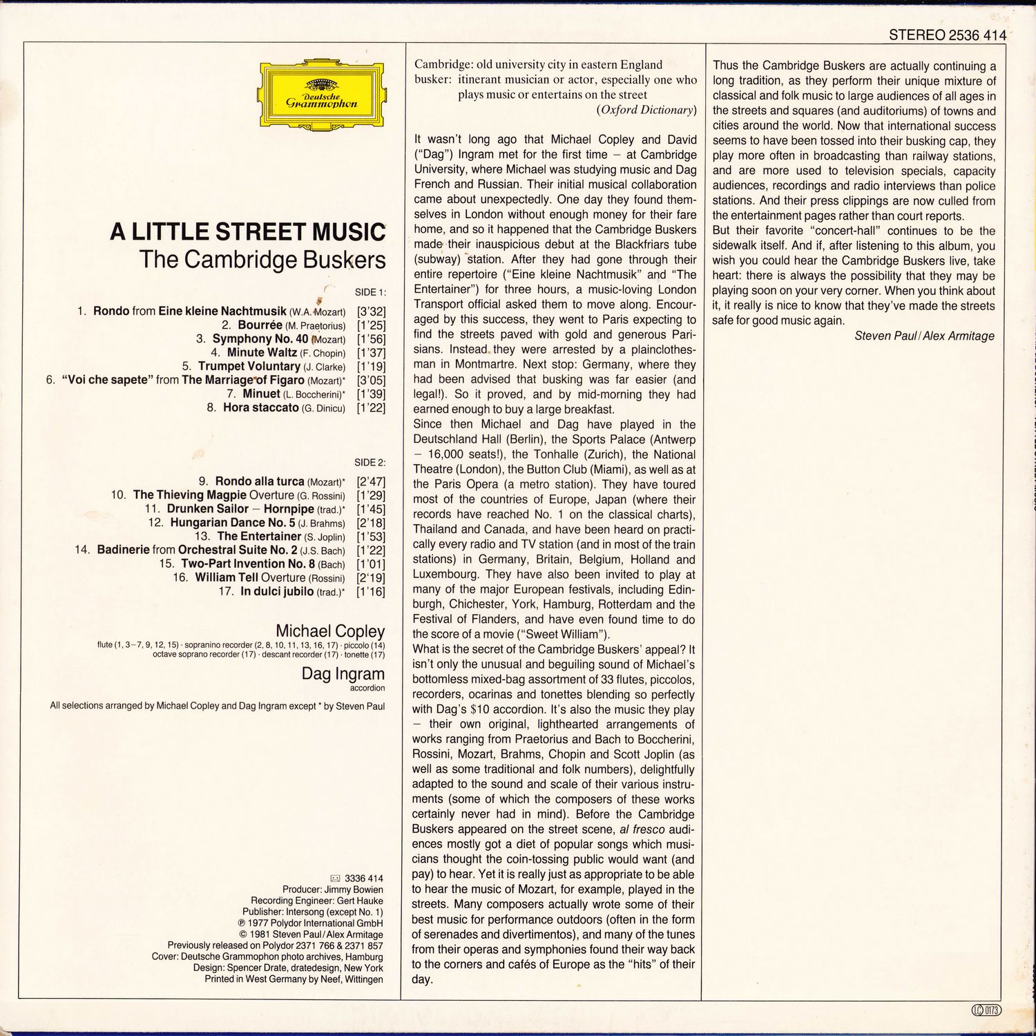 It wasn't long ago that Michael Copley and David ("Dag") Ingram met for the first time — at Cambridge University, where Michael was studying music and Dag French and Russian. Their initial musical collaboration came about unexpectedly. One day they found themselves in London without enough money for their fare home, and so it happened that the Cambridge Buskers made their inauspicious debut at the Blackfriars tube (subway) station. After they had gone through their entire repertoire ("Eine kleine Nachtmusik" and "The Entertainer") for three hours, a music-loving London Transport official asked them to move along. Encouraged by this success, they went to Paris expecting to find the streets paved with gold and generous Parisians. Instead they were arrested by a plainclothes-man in Montmartre. Next stop: Germany, where they had been advised that busking was far easier (and legal!). So it proved, and by mid-morning they had earned enough to buy a large breakfast.