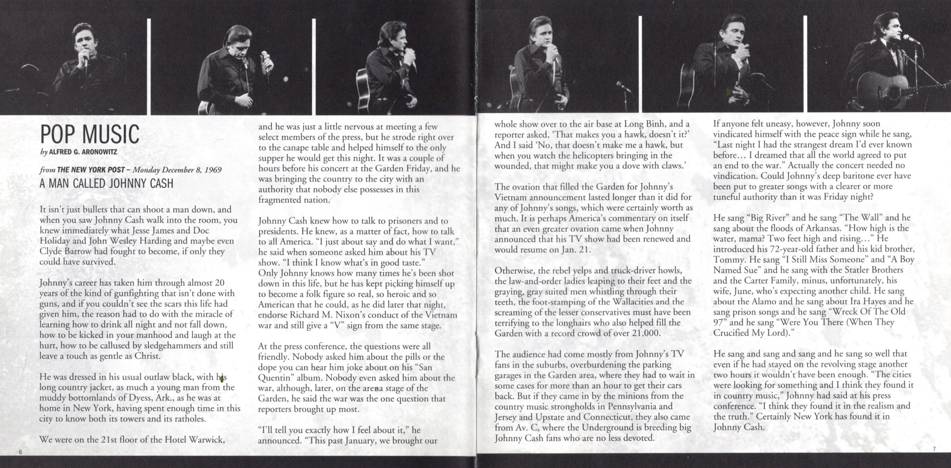 It took a man as courageous, iconoclastic, outspoken, and talented as salt-of-the-earth Johnny Cash to win over a nation divided by war — the one being fought in Southeast Asia and the one waged at home over social, sexual, and lifestyle upheavals brought forth by the burgeoning counterculture. His booming, trademark greeting, "Hello, I'm Johnny Cash," communicated a warmth and camaraderie to long hairs, short hairs, even no hairs — like Shel Silverstein, composer of "Sue" sitting front row center that night at the Garden.