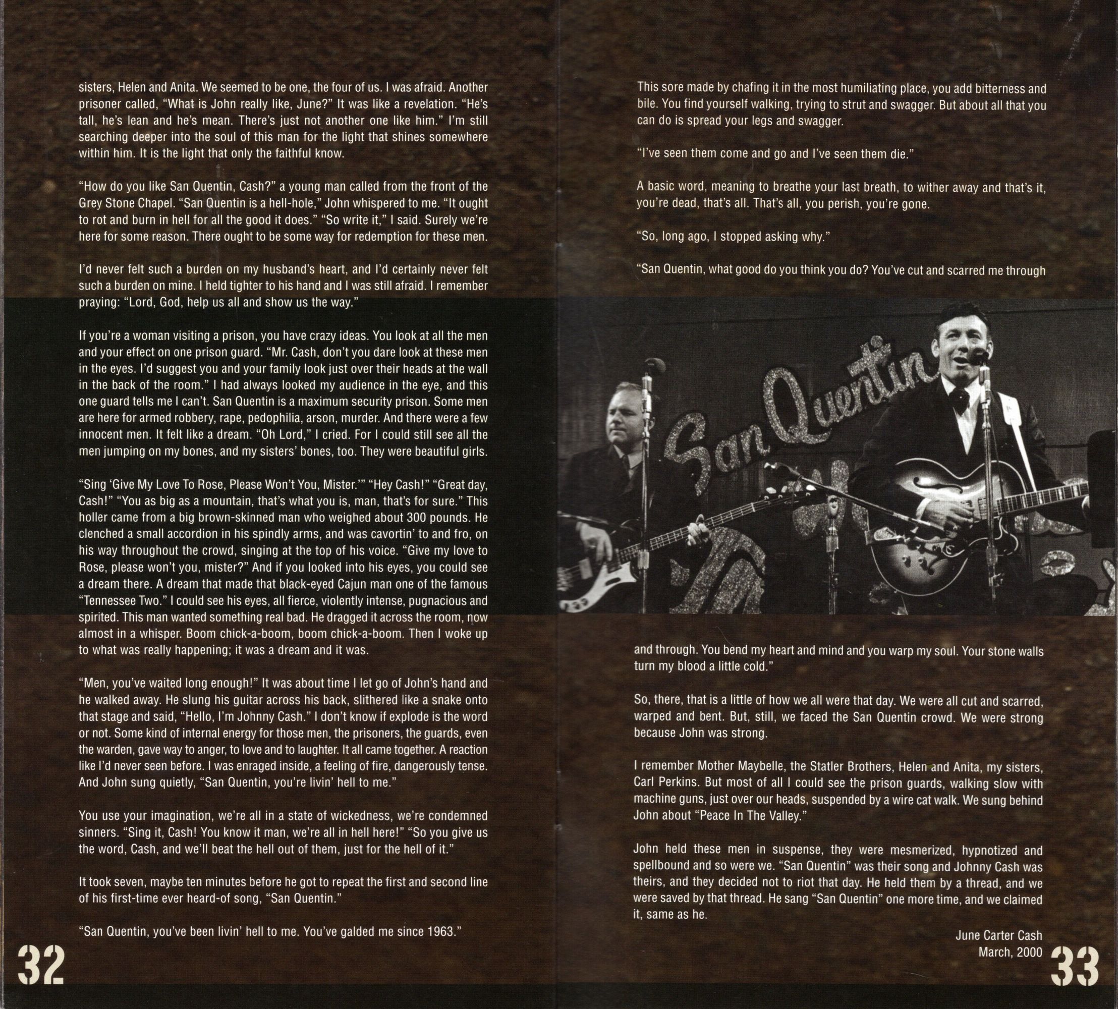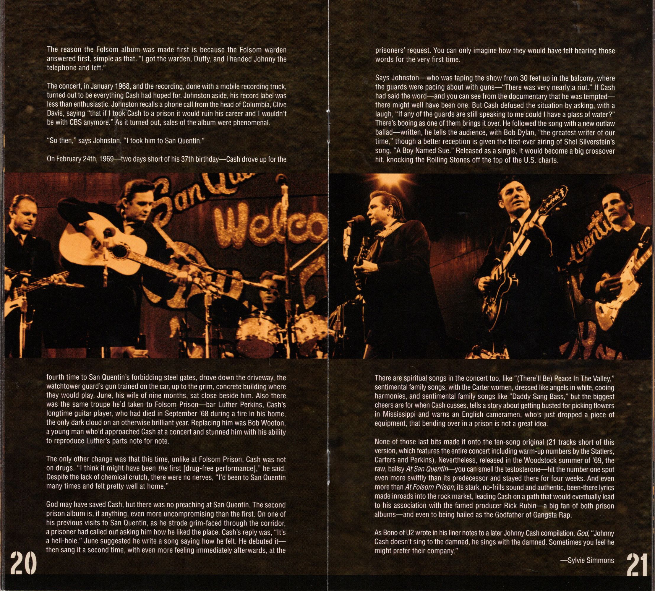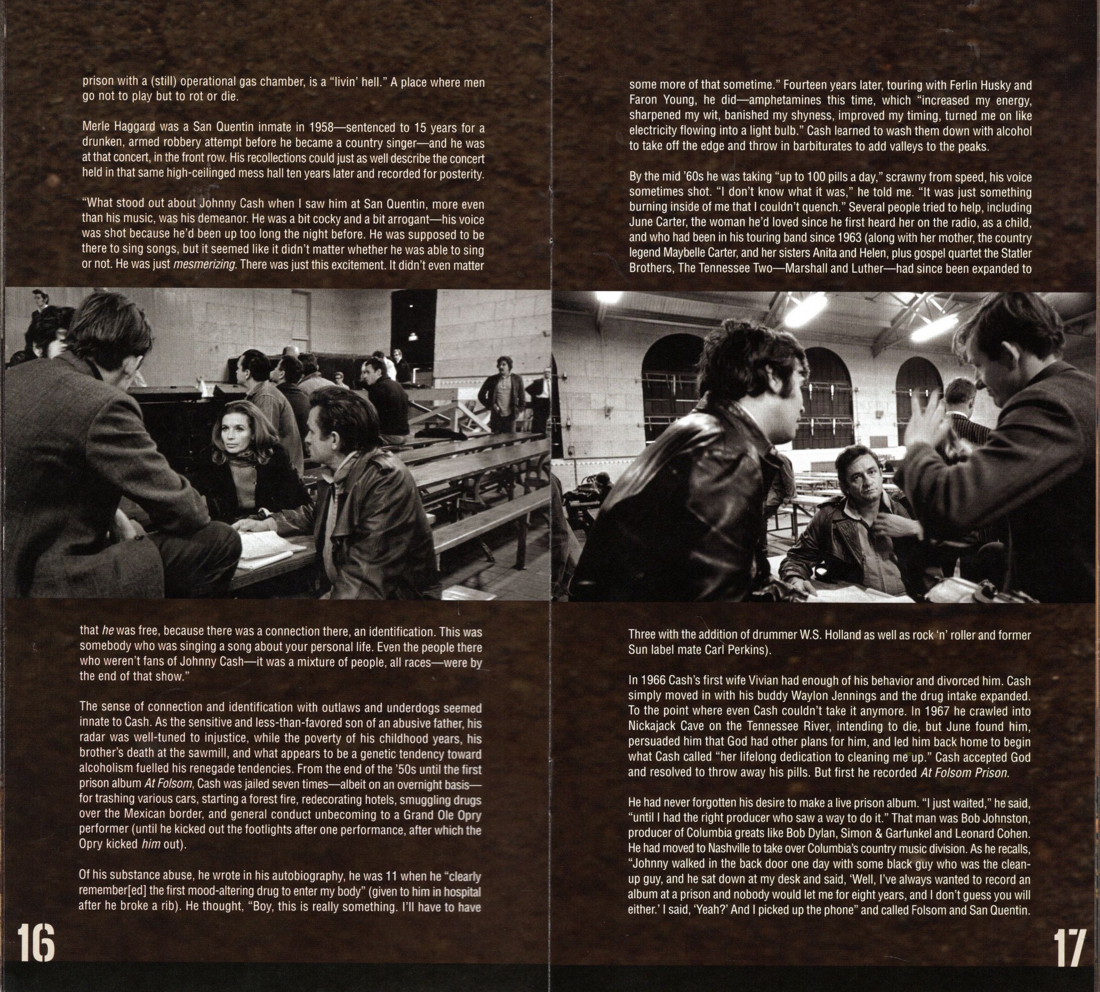 Like a naive fool, I gave him my money then sat up most of the night waiting for him to bring me the tapes. His word was as hollow as a politician's promise. He never returned. I finally gave up, went to bed, and forgot about it...until now. After twenty years, I welcome the re-release of this classic recording, complete with its lost chapters. Locked away in a vault for so long, it showcases Cash at his zenith — a master communicator, interpreter and missionary, who sang songs for the souls locked away, inside one of hell's most famous waiting rooms.