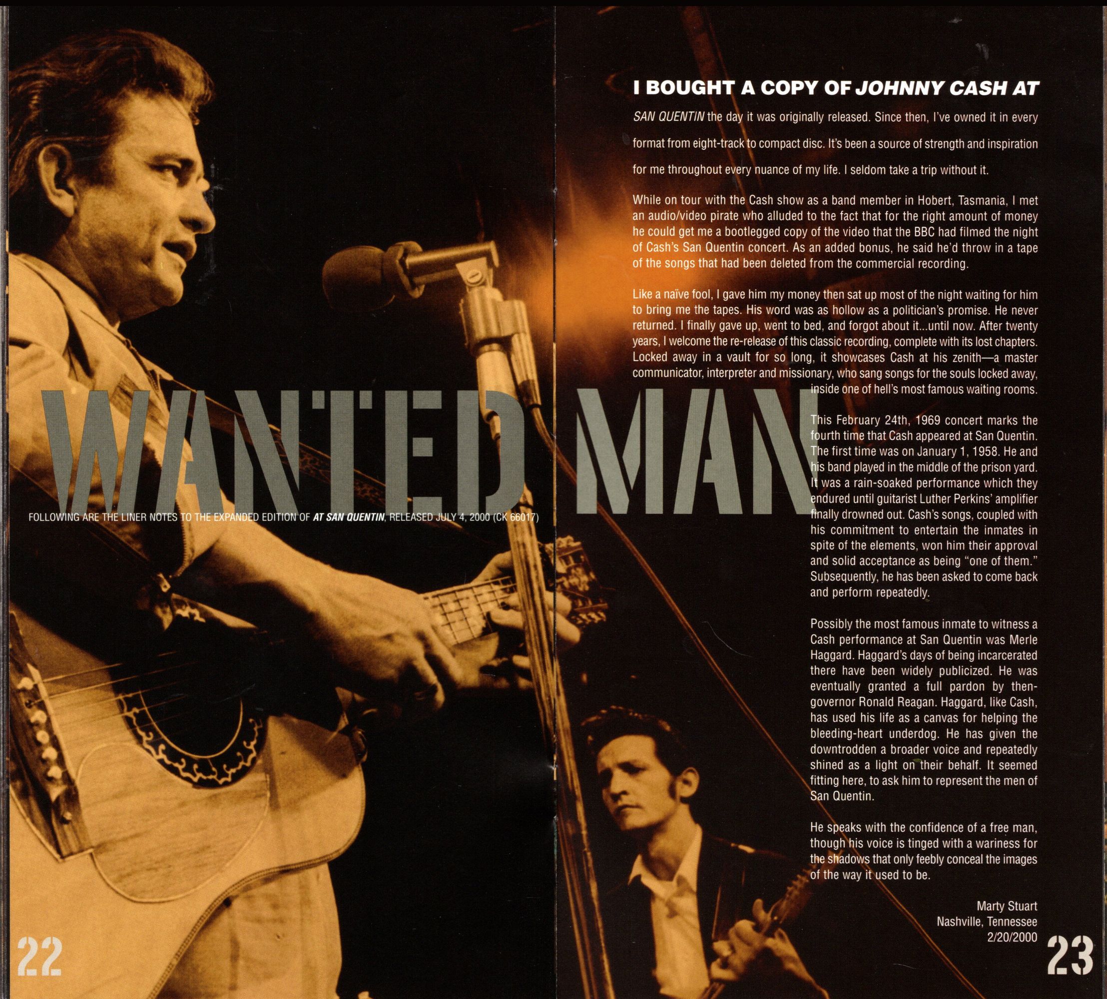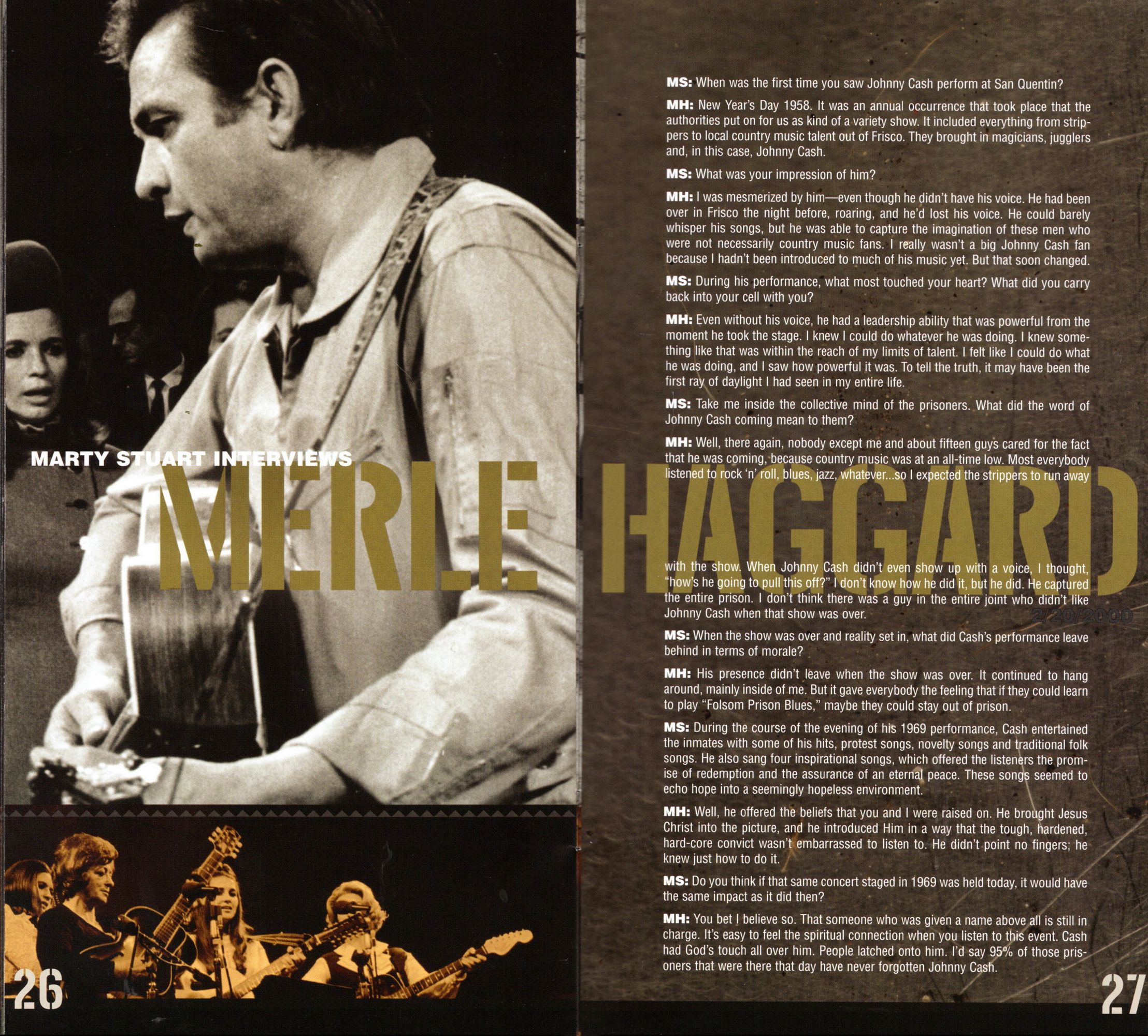 Possibly the most famous inmate to witness a Cash performance at San Quentin was Merle Haggard. Haggard's days of being incarcerated there have been widely publicized. He was eventually granted a full pardon by then-governor Ronald Reagan. Haggard, like Cash, has used his life as a canvas for helping the bleeding-heart underdog. He has given the downtrodden a broader voice and repeatedly shined as a light on their behalf. It seemed fitting here, to ask him to represent the men of San Quentin.