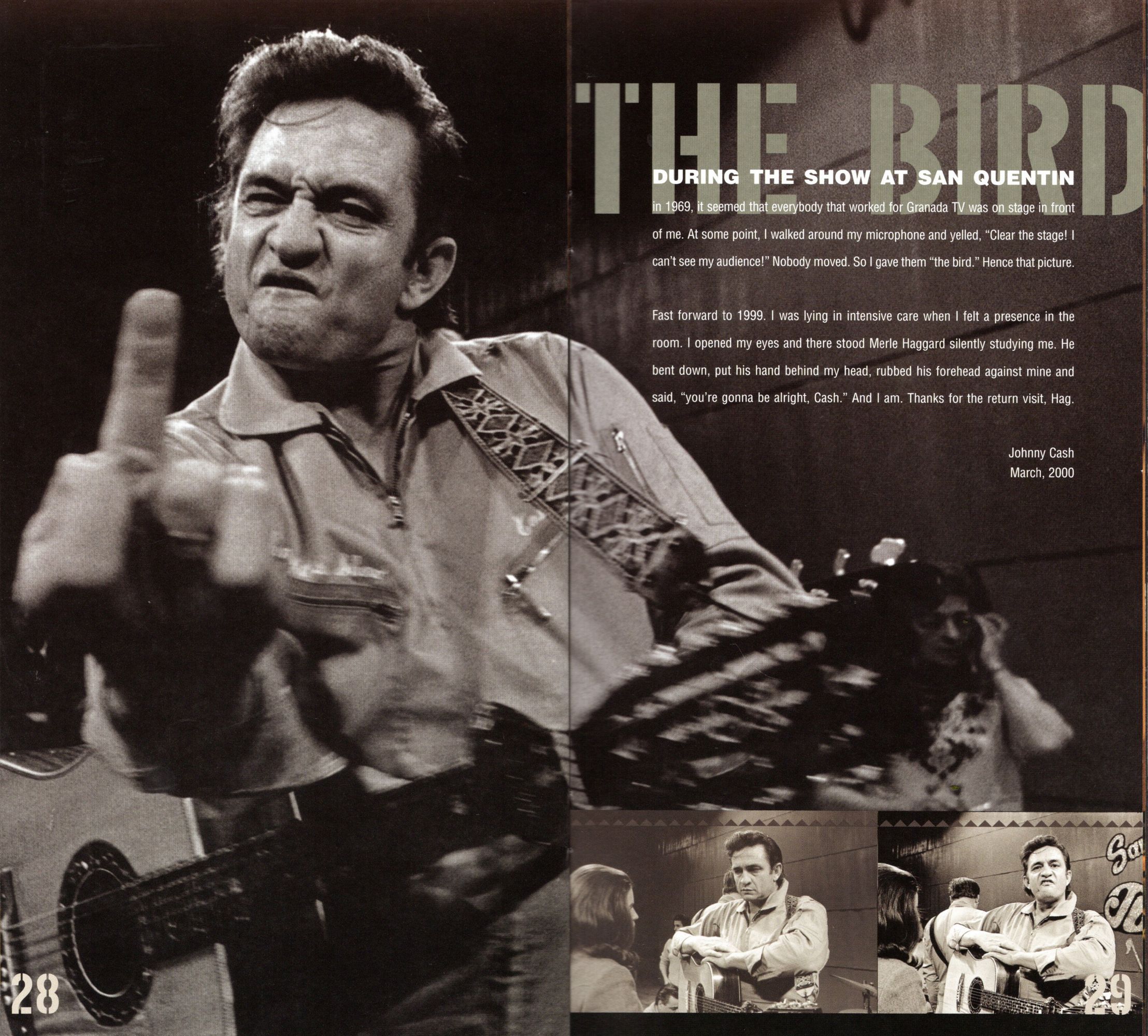 There's a photo of Johnny Cash that has now become iconic — you see it everywhere; teenagers wear it on T-shirts. In it Cash snarls like a punk rocker at the camera with his middle finger raised, flipping the bird. It was taken — by Jim Marshall — during the afternoon rehearsal for Cash's 1969 concert at San Quentin penitentiary. Some say it was aimed at a prison guard; Cash himself once said it was intended for a cameraman from the crew filming the concert for a British TV documentary who was getting between him and the audience. A captive audience, literally. The inmates of San Quentin — or those, at least, who weren't locked up on death row.