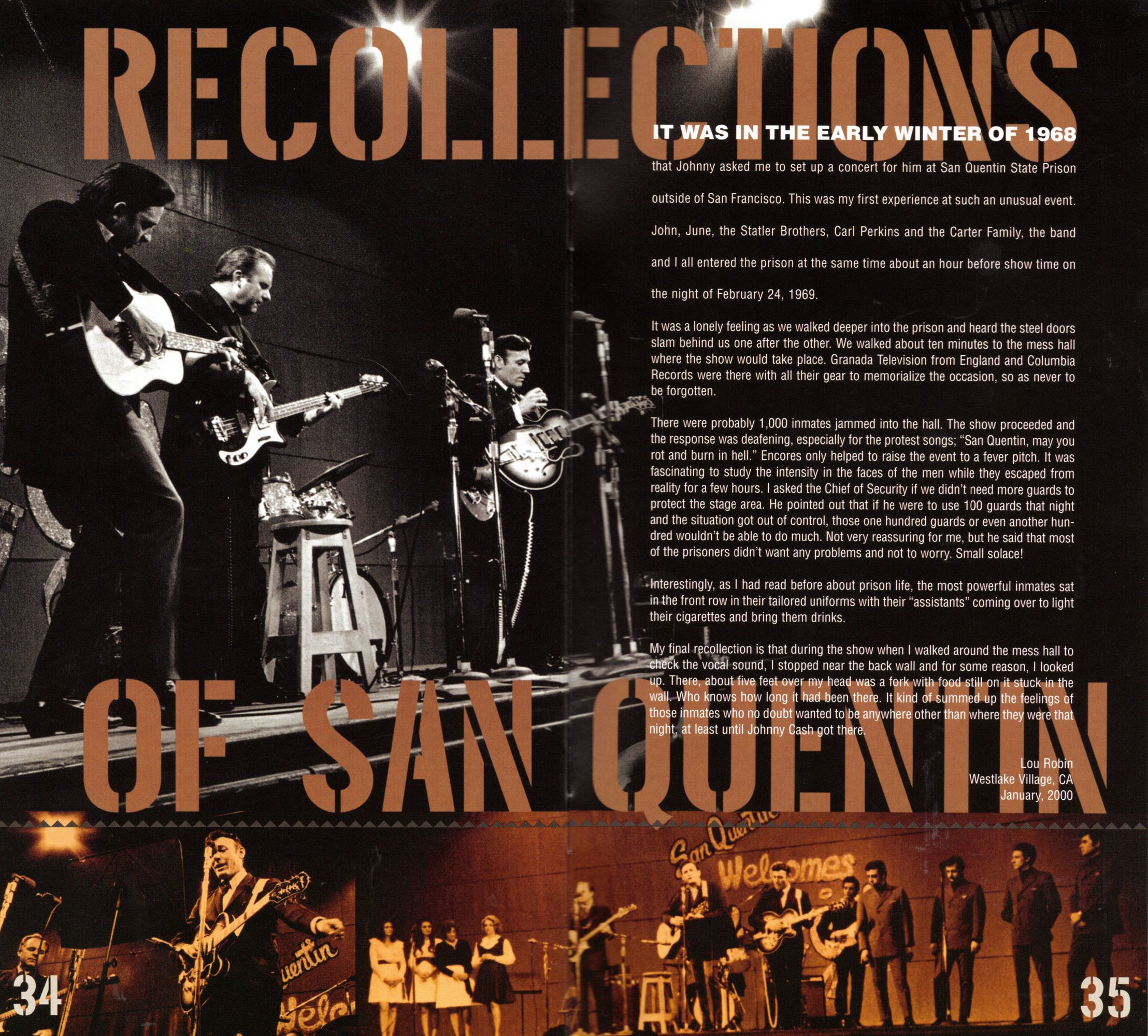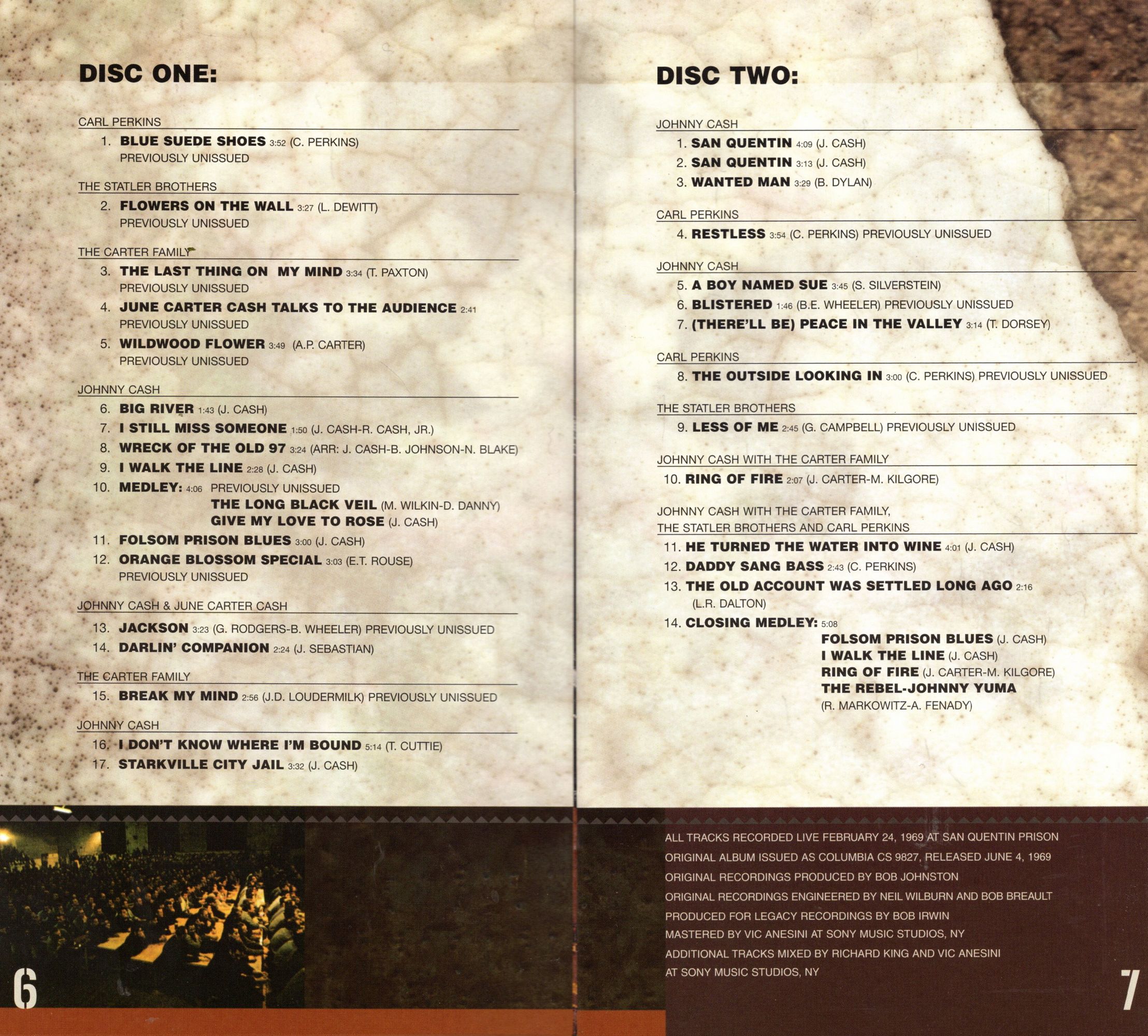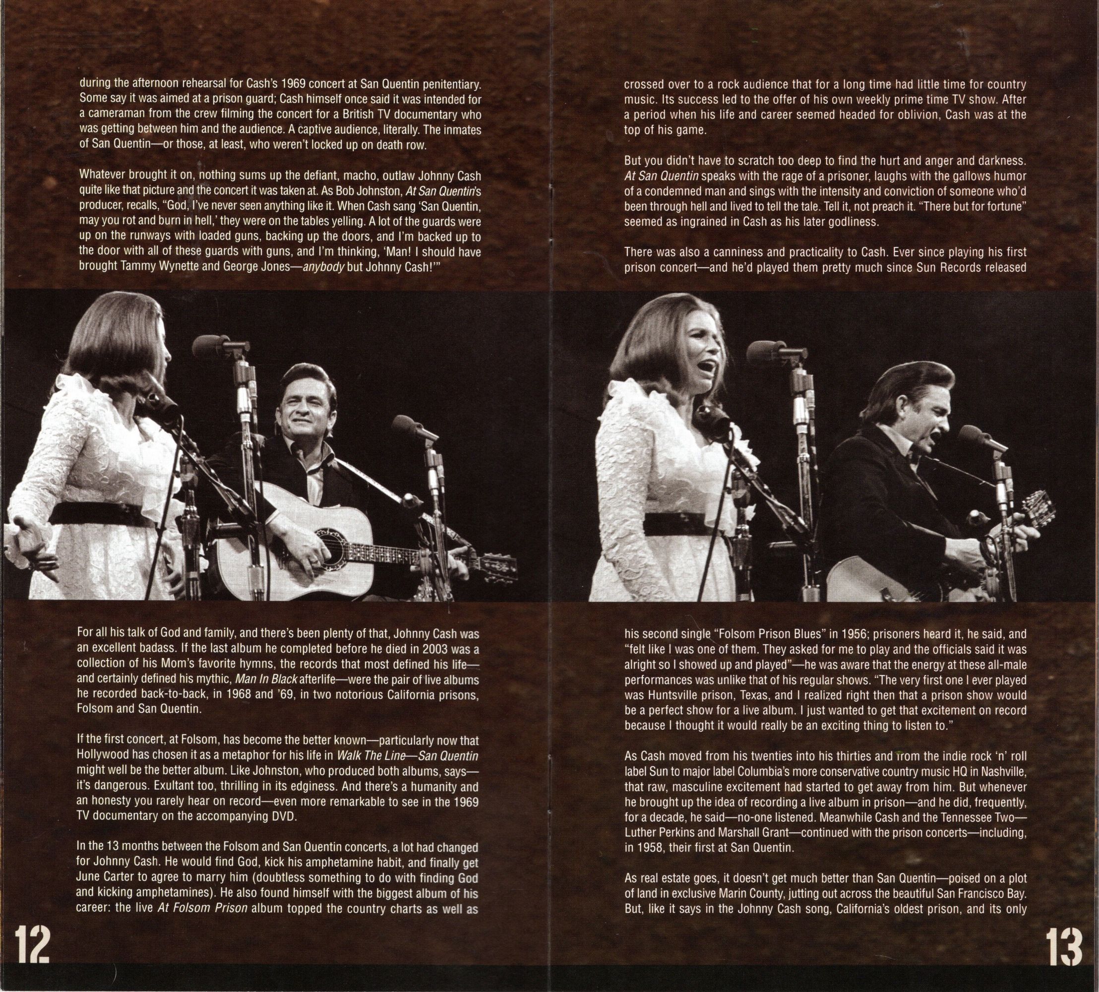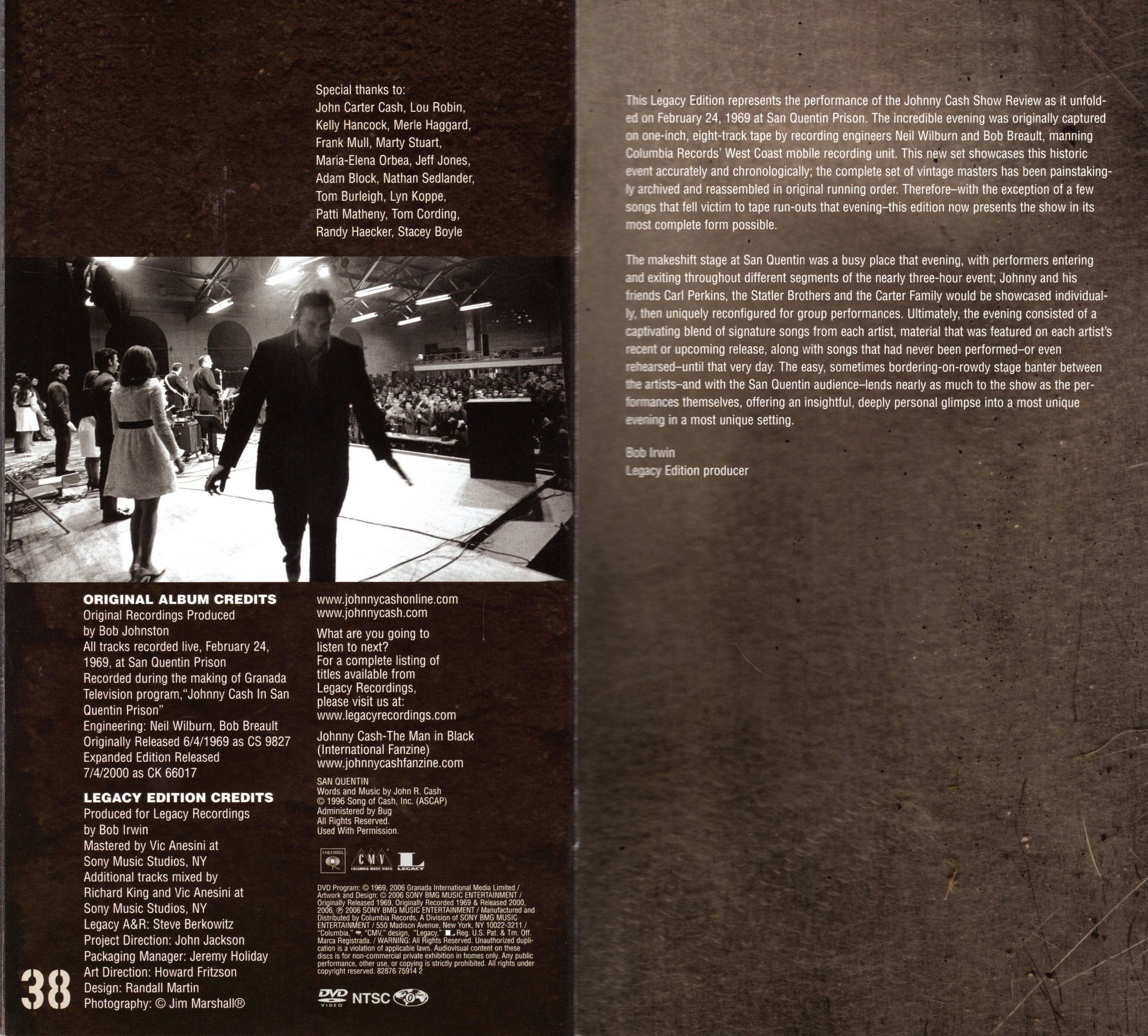 The Legacy Edition represents the performance of the Johnny Cash Show Review as it unfold-ed on February 24,1969 at San Quentin Prison. The incredible evening was originally captured on one-inch, eight-track tape by recording engineers Neil Wilburn and Bob Breault, manning Columbia Records' West Coast mobile recording unit. This new set showcases this historic event accurately and chronologically; the complete set of vintage masters has been painstakingly archived and reassembled in original running order. Therefore — with the exception of a few songs that fell victim to tape run-outs that evening — this edition now presents the show in its most complete form possible.