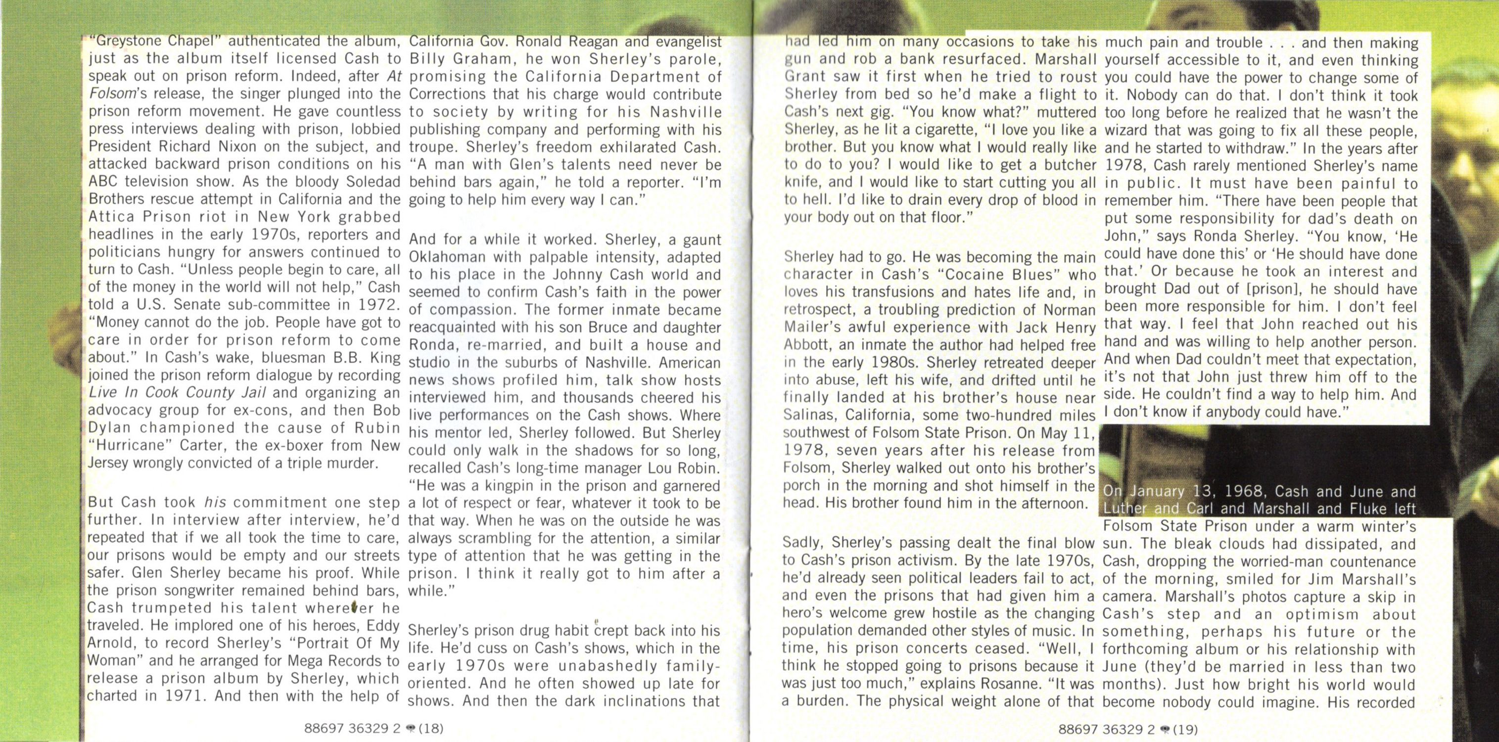 "Greystone Chapel" authenticated the album, just as the album itself licensed Cash to speak out on prison reform. Indeed, after At Folsom's release, the singer plunged into the prison reform movement. He gave countless press interviews dealing with prison, lobbied President Richard Nixon on the subject, and attacked backward prison conditions on his ABC television show. As the bloody Soledad Brothers rescue attempt in California and the Attica Prison riot in New York grabbed headlines in the early 1970s, reporters and politicians hungry for answers continued to turn to Cash. "Unless people begin to care, all of the money in the world will not help," Cash told a U.S. Senate sub-committee in 1972. "Money cannot do the job. People have got to care in order for prison reform to come about." In Cash's wake, bluesman B.B. King joined the prison reform dialogue by recording Live In Cook County Jail and organizing an advocacy group for ex-cons, and then Bob Dylan championed the cause of Rubin "Hurricane" Carter, the ex-boxer from New Jersey wrongly convicted of a triple murder.