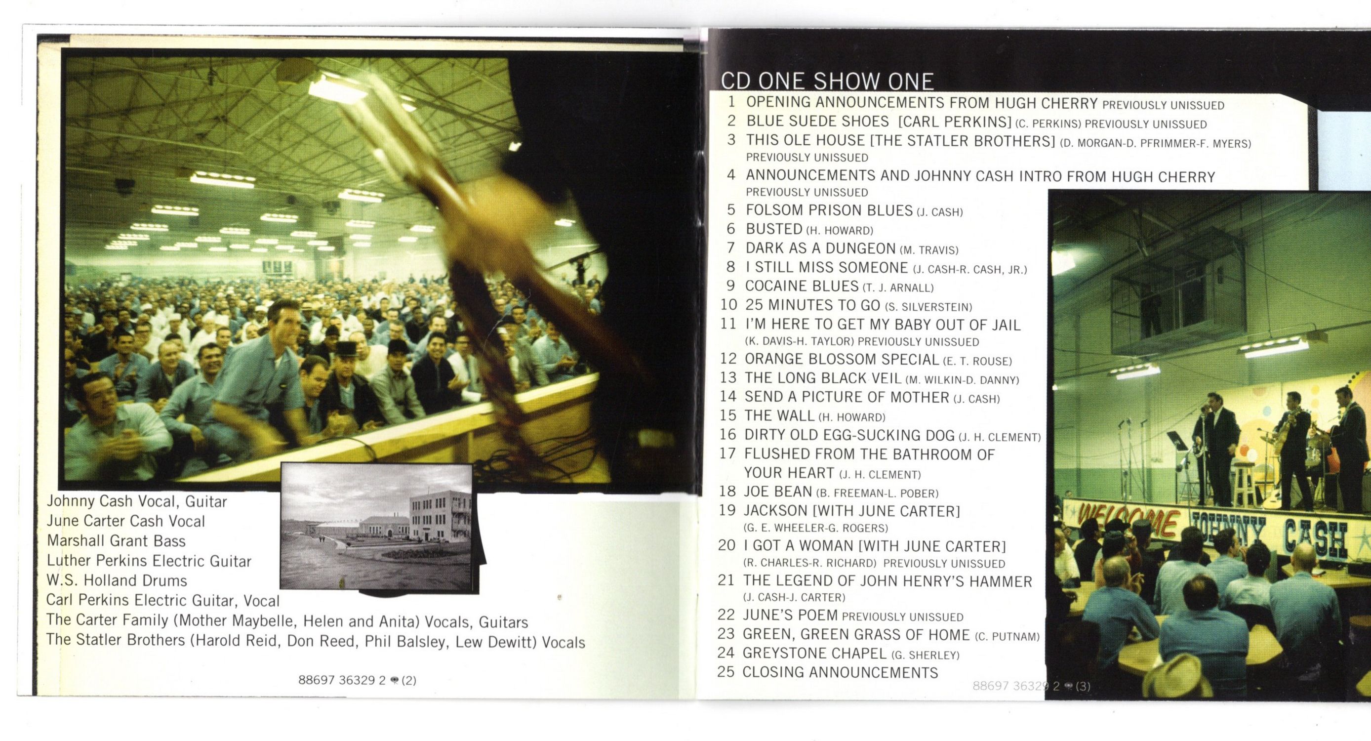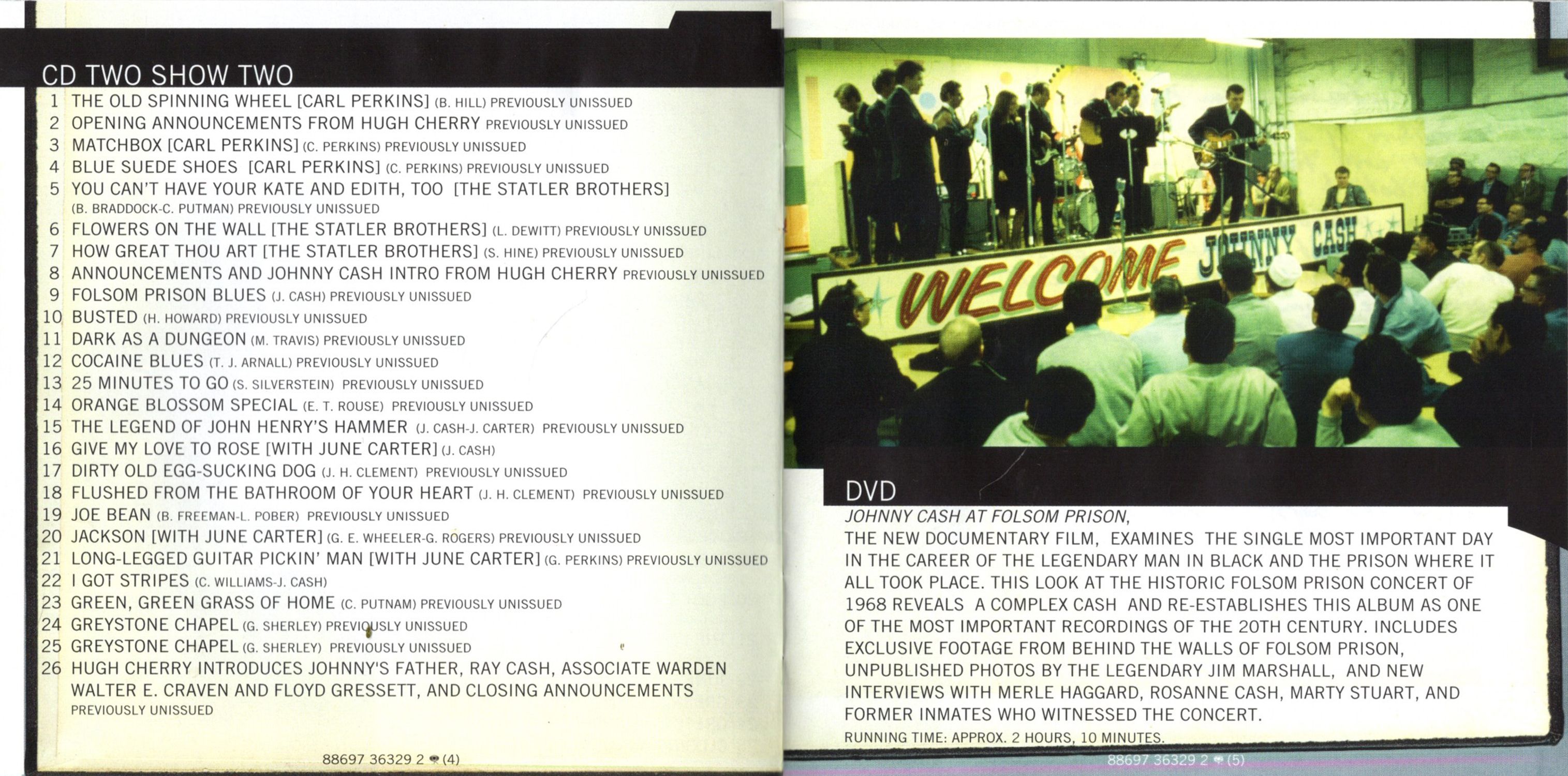 Now available in this deluxe three-disc edition are each one of Cash's thirty-six performances from both shows (sixteen of them unissued until now) and the unreleased performances of his road mates Carl Perkins, The Statler Brothers, and June Carter. The definitive versions of Cash's "Folsom Prison Blues," "Cocaine Blues," "Dark As A Dungeon" and other classics crack from the album like shotgun fire, cementing his mythic man-in-black persona and underscoring his rowdy camaraderie with the imprisoned men. Cash also takes on songs new to him such as the country chestnut "I'm Here To Get My Baby Out Of Jail," and "Greystone Chapel," written by Folsom inmate Glen Sherley.