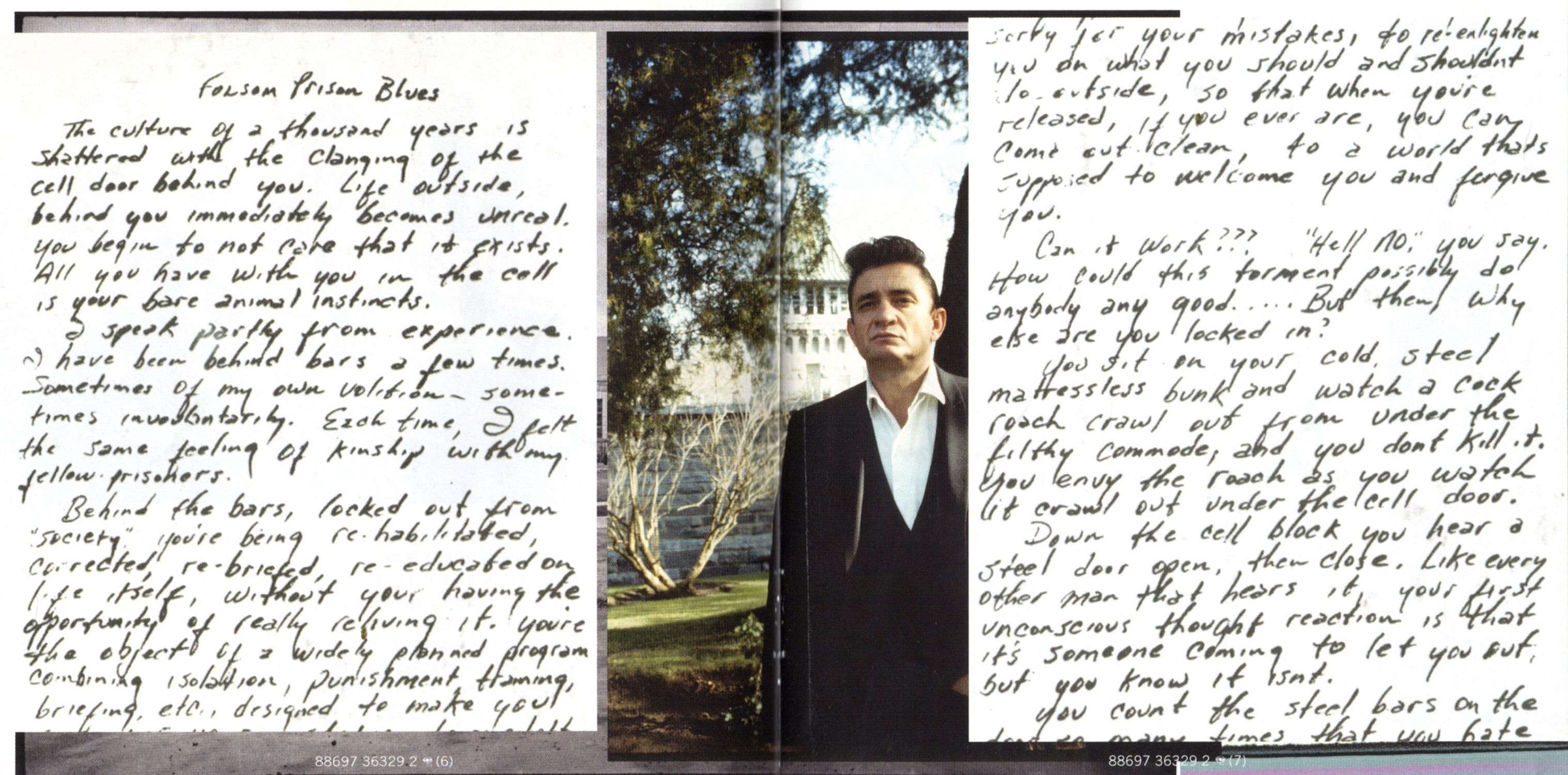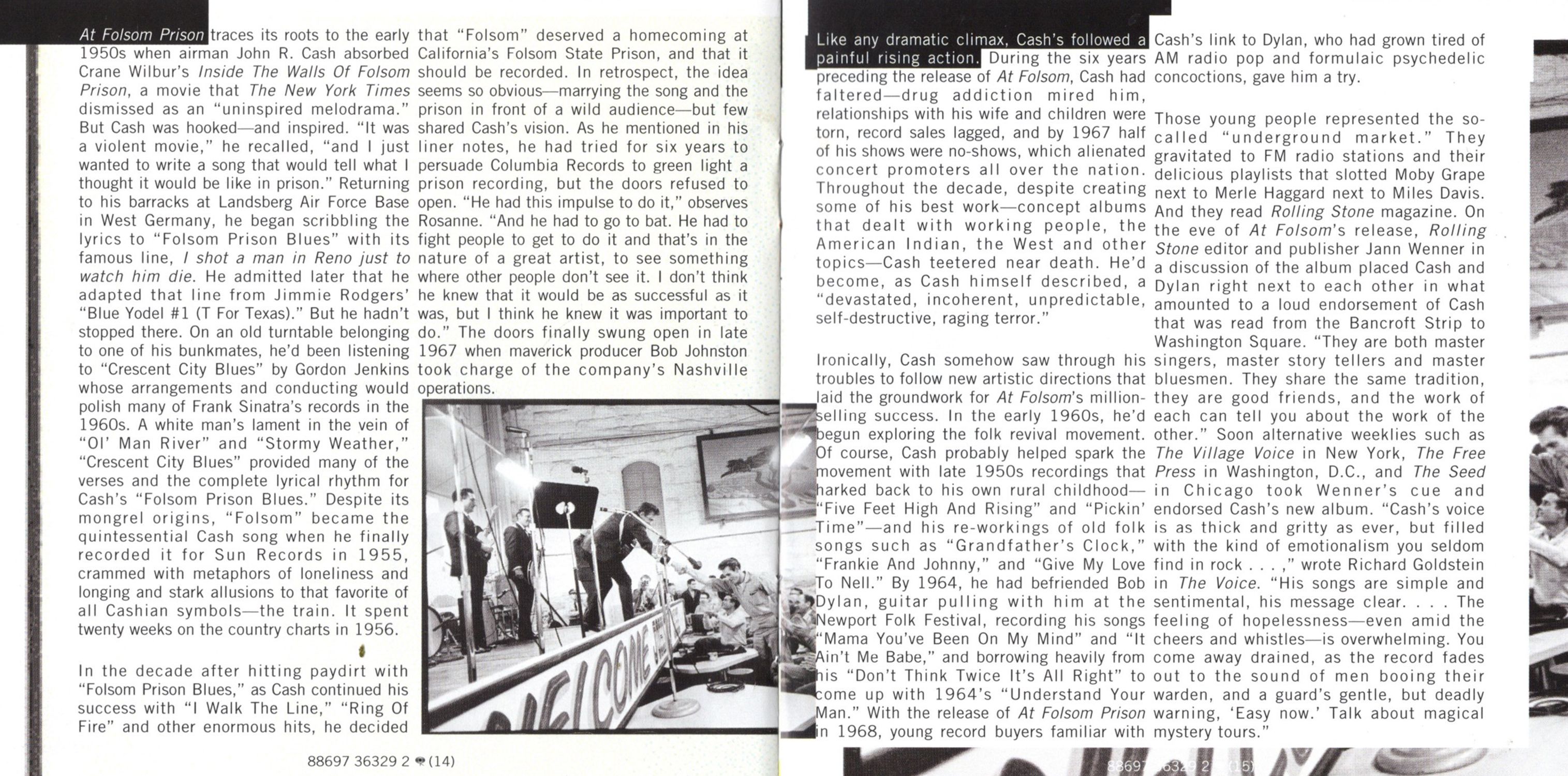 At Folsom Prison traces its roots to the early 1950s when airman John R. Cash absorbed Crane Wilbur's Inside The Walls Of Folsom Prison, a movie that The New York Times dismissed as an "uninspired melodrama." But Cash was hooked — and inspired. "It was a violent movie," he recalled, "and I just wanted to write a song that would tell what I thought it would be like in prison." Returning to his barracks at Landsberg Air Force Base in West Germany, he began scribbling the lyrics to "Folsom Prison Blues" with its famous line, I shot a man in Reno just to watch him die. He admitted later that he adapted that line from Jimmie Rodgers' "Blue Yodel #1 (T For Texas).'' But he hadn't stopped there. On an old turntable belonging to one of his bunkmates, he'd been listening to "Crescent City Blues" by Gordon Jenkins whose arrangements and conducting would polish many of Frank Sinatra's records in the 1960s. A white man's lament in the vein of "0l' Man River" and "Stormy Weather," "Crescent City Blues" provided many of the verses and the complete lyrical rhythm for Cash's "Folsom Prison Blues." Despite its mongrel origins, "Folsom" became the quintessential Cash song when he finally recorded it for Sun Records in 1955, crammed with metaphors of loneliness and longing and stark allusions to that favorite of all Cashian symbols — the train. It spent twenty weeks on the country charts in 1956.