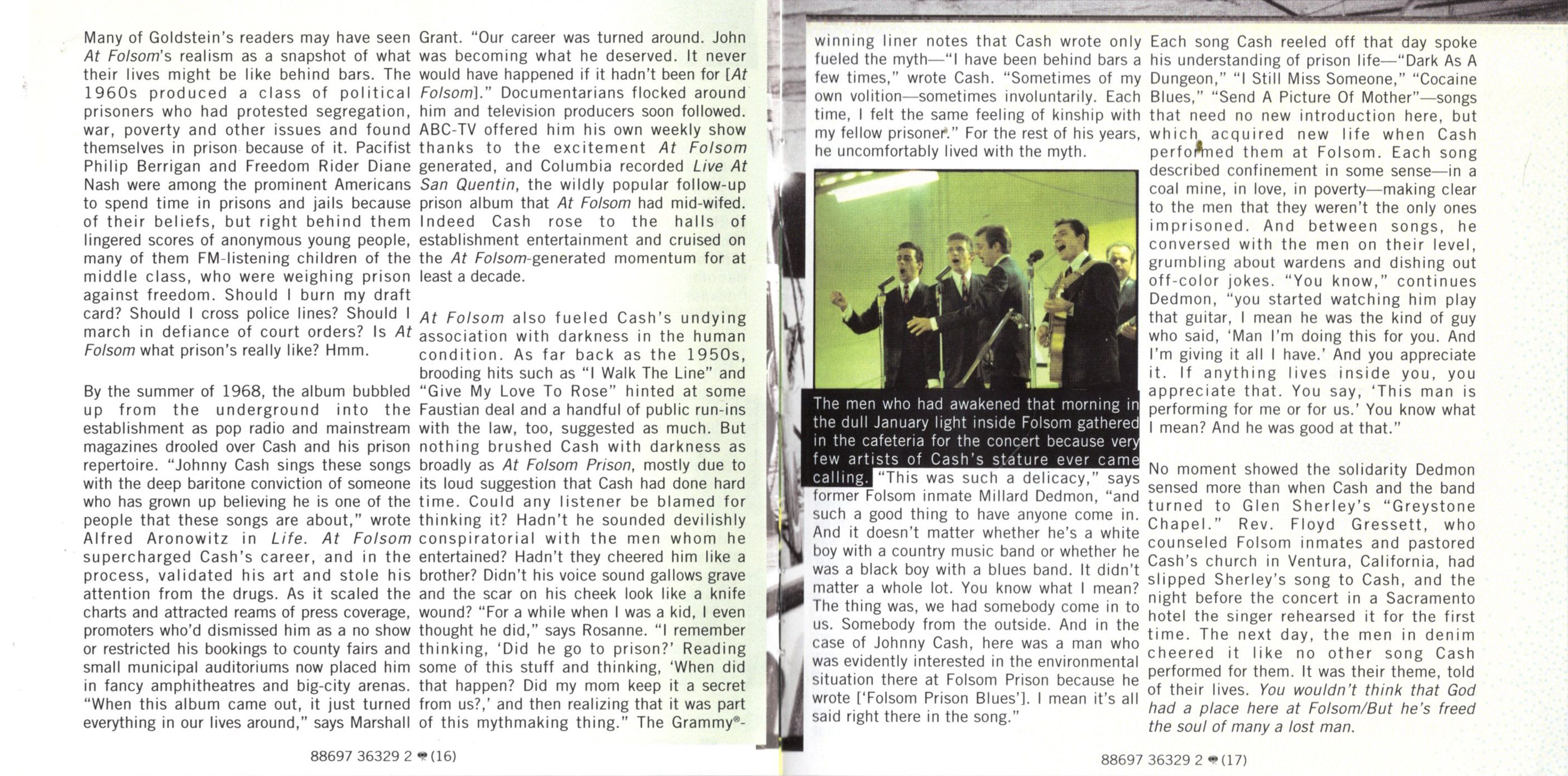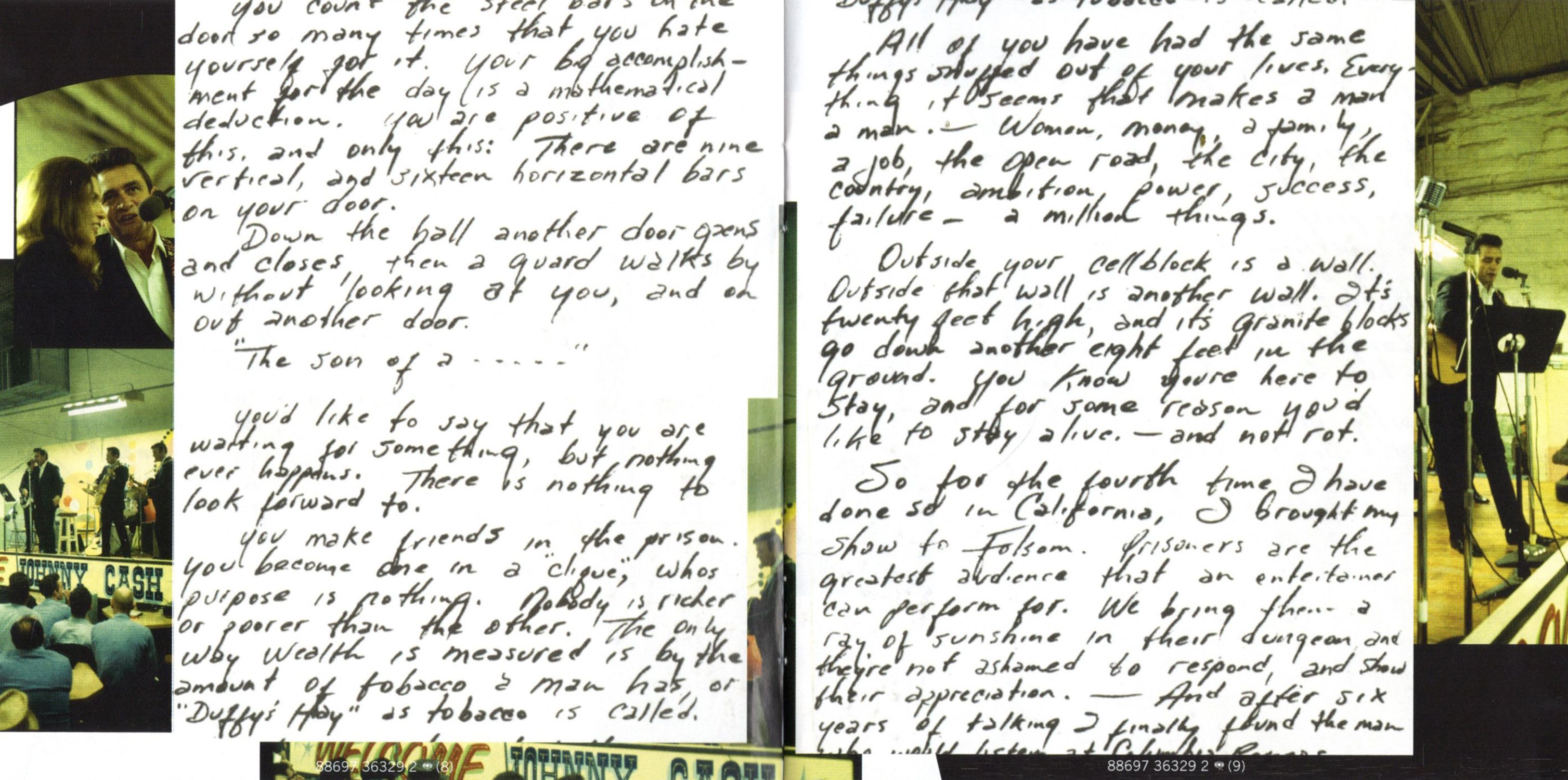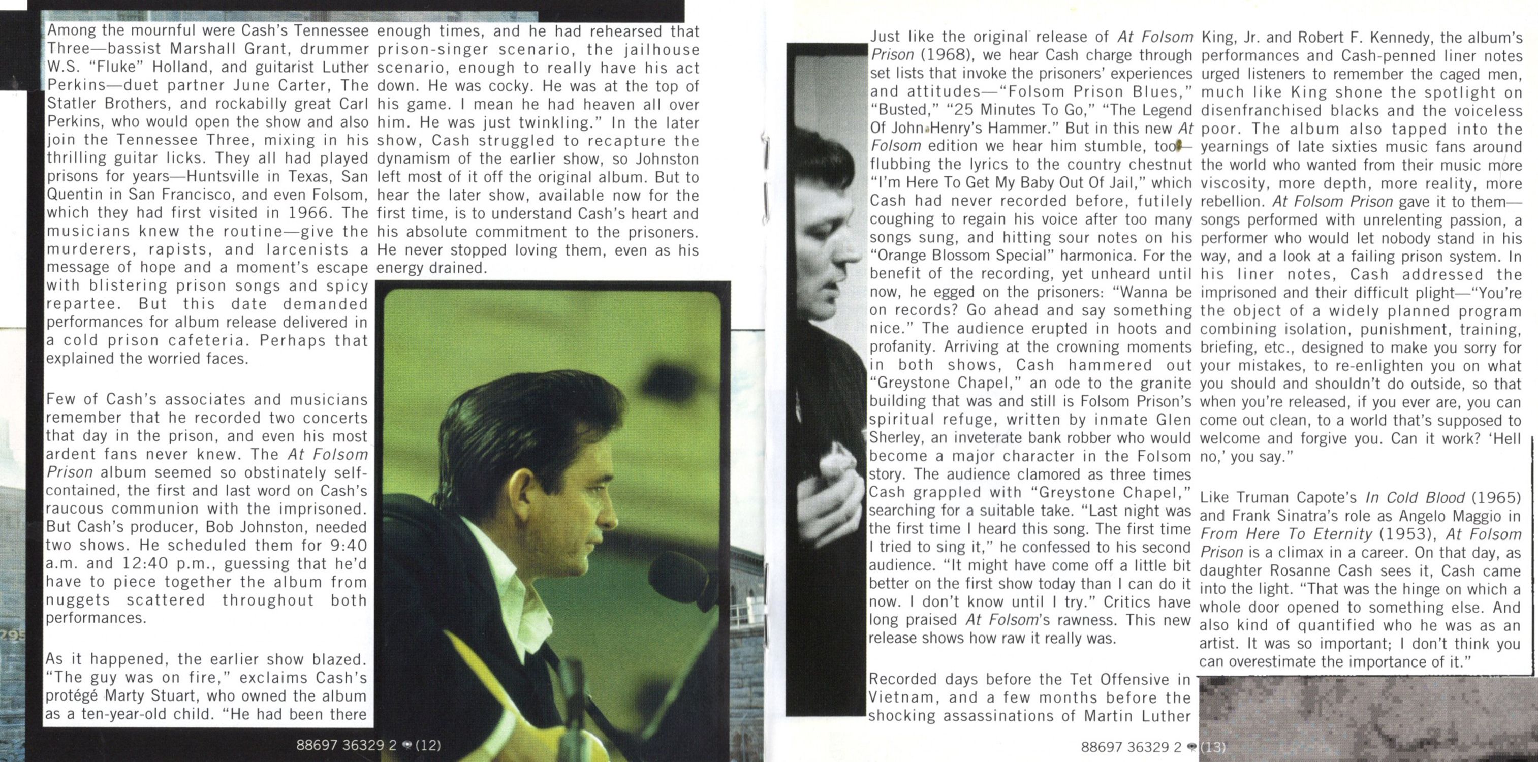 Recorded days before the Tet Offensive in Vietnam, and a few months before the shocking assassinations of Martin Luther King, Jr. and Robert F. Kennedy, the album's performances and Cash-penned liner notes urged listeners to remember the caged men, much like King shone the spotlight on disenfranchised blacks and the voiceless poor. The album also tapped into the yearnings of late sixties music fans around the world who wanted from their music more viscosity, more depth, more reality, more rebellion. At Folsom Prison gave it to them — songs performed with unrelenting passion, a performer who would let nobody stand in his way, and a look at a failing prison system. In his liner notes, Cash addressed the imprisoned and their difficult plight — "You're the object of a widely planned program combining isolation, punishment, training, briefing, etc., designed to make you sorry for your mistakes, to re-enlighten you on what you should and shouldn't do outside, so that when you're released, if you ever are, you can come out clean, to a world that's supposed to welcome and forgive you. Can it work? 'Hell no,' you say."