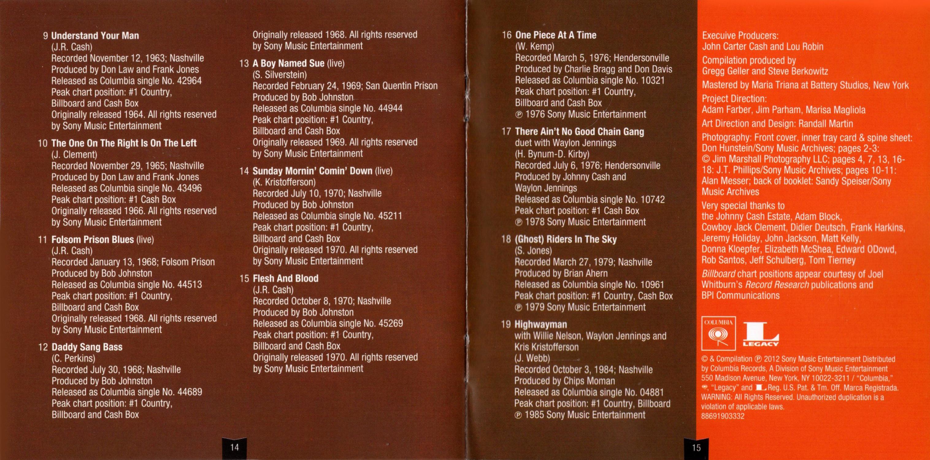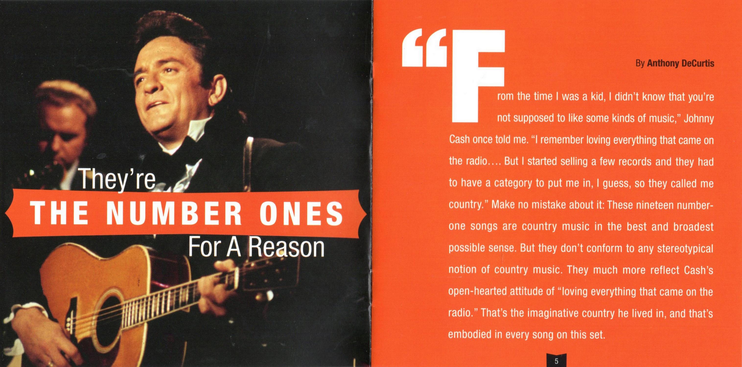 Quoting Johnny Cash approvingly, Willie Nelson once told me that "a hit covers a multitude of sins!" It's a perfect Cash aphorism — funny, Biblical and pragmatic as can be. What he means is that you create music for people to hear and enjoy, and you can't argue with music that accomplishes exactly that. When you manage to do that over an extended period of time, that's an achievement of a very high order. Different as they are from each other, each of these songs hit the number one spot because people found something in them to love. Part of what they found is all the talent, all the humanity and all the conviction, that Johnny Cash represents. And with this collection, we are all given a splendid opportunity to discover and rediscover those peerless qualities again. And again.