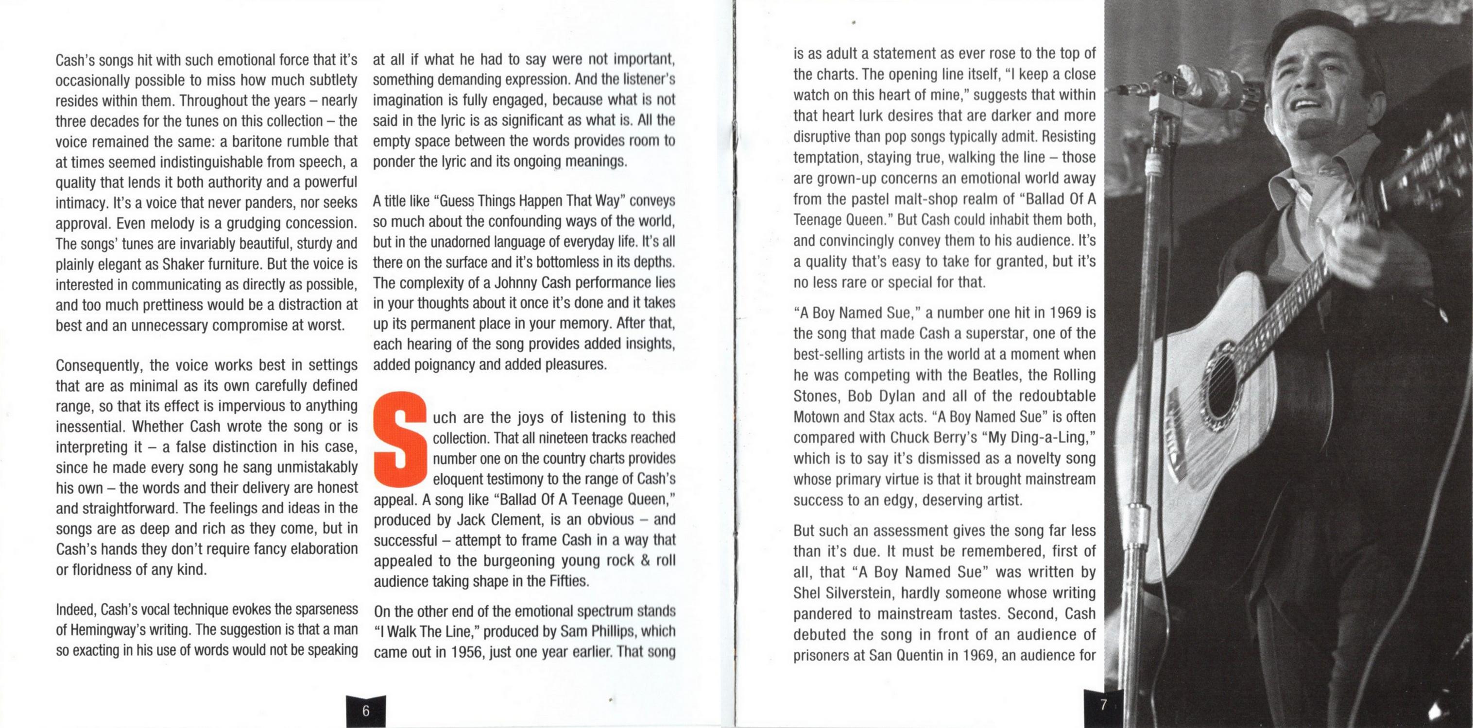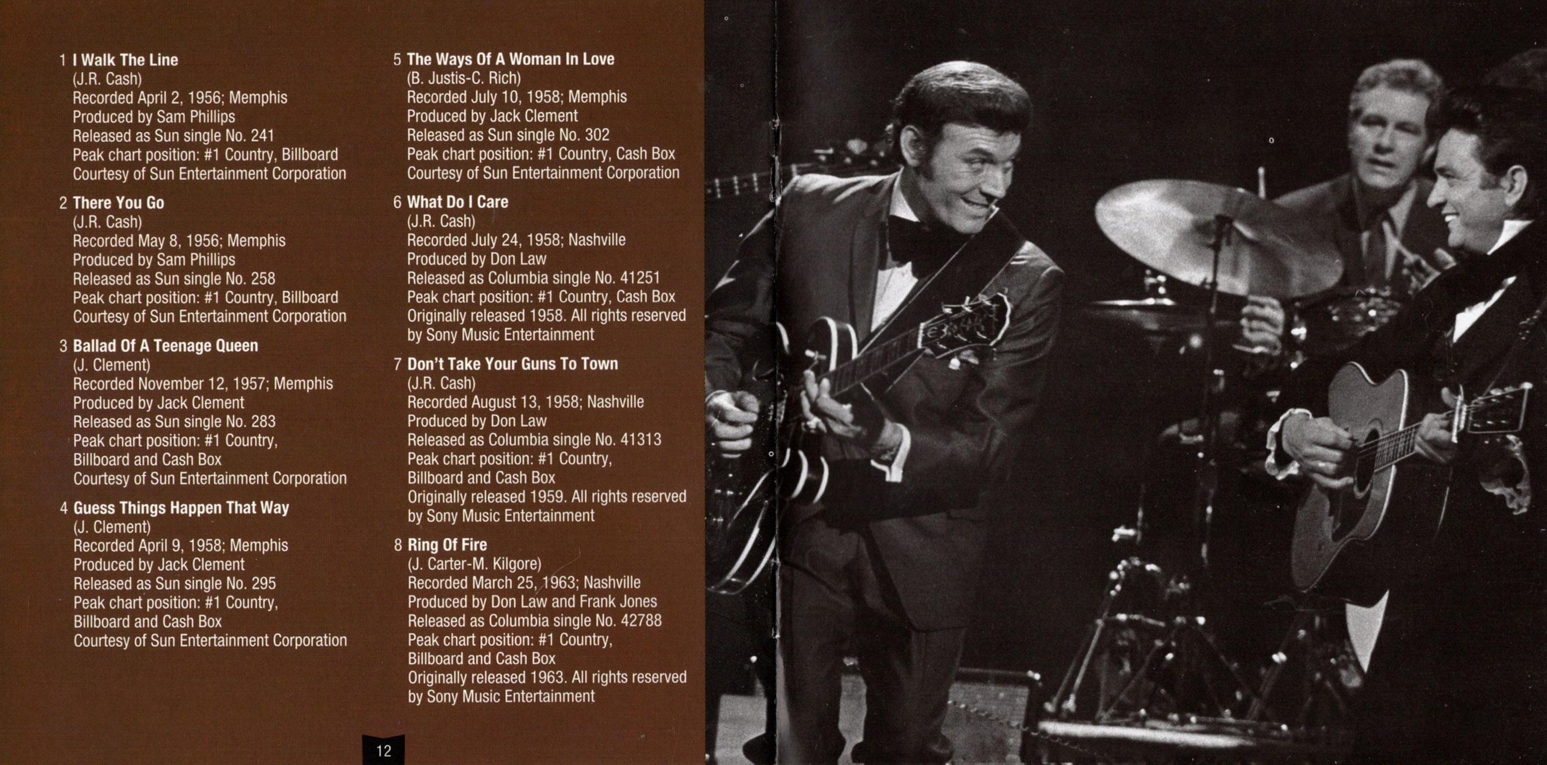 Such are the joys of listening to this collection. That all nineteen tracks reached number one on the country charts provides eloquent testimony to the range of Cash's appeal. A song like "Ballad Of A Teenage Queen," produced by Jack Clement, is an obvious — and successful — attempt to frame Cash in a way that appealed to the burgeoning young rock & roll audience taking shape in the Fifties.