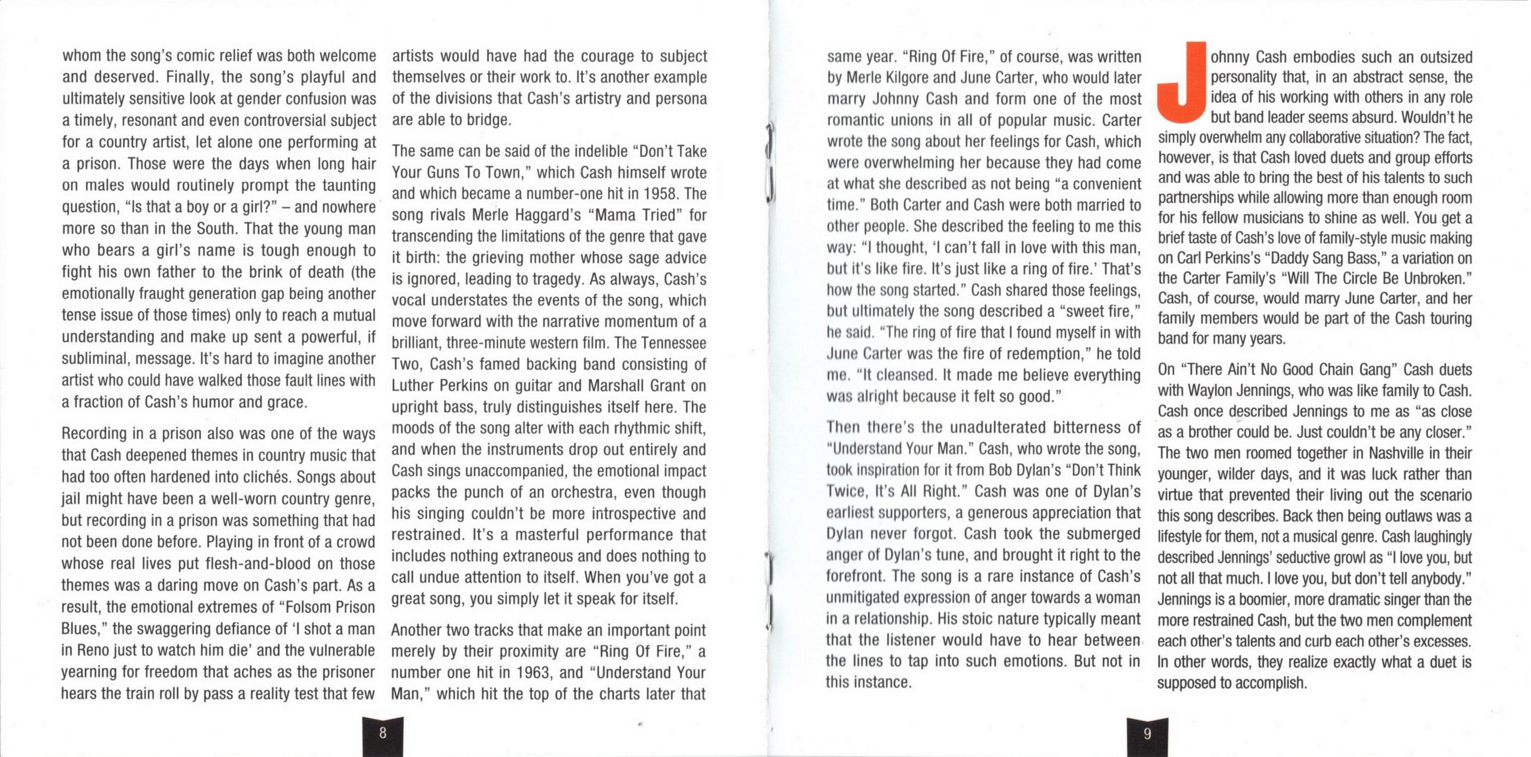 "From the time I was a kid, I didn't know that you're not supposed to like some kinds of music," Johnny Cash once told me. "I remember loving everything that came on the radio … But I started selling a few records and they had to have a category to put me in, I guess, so they called me country." Make no mistake about it: These nineteen number-one songs are country music in the best and broadest possible sense. But they don't conform to any stereotypical notion of country music. They much more reflect Cash's open-hearted attitude of "loving everything that came on the radio." That's the imaginative country he lived in, and that's embodied in every song on this set.