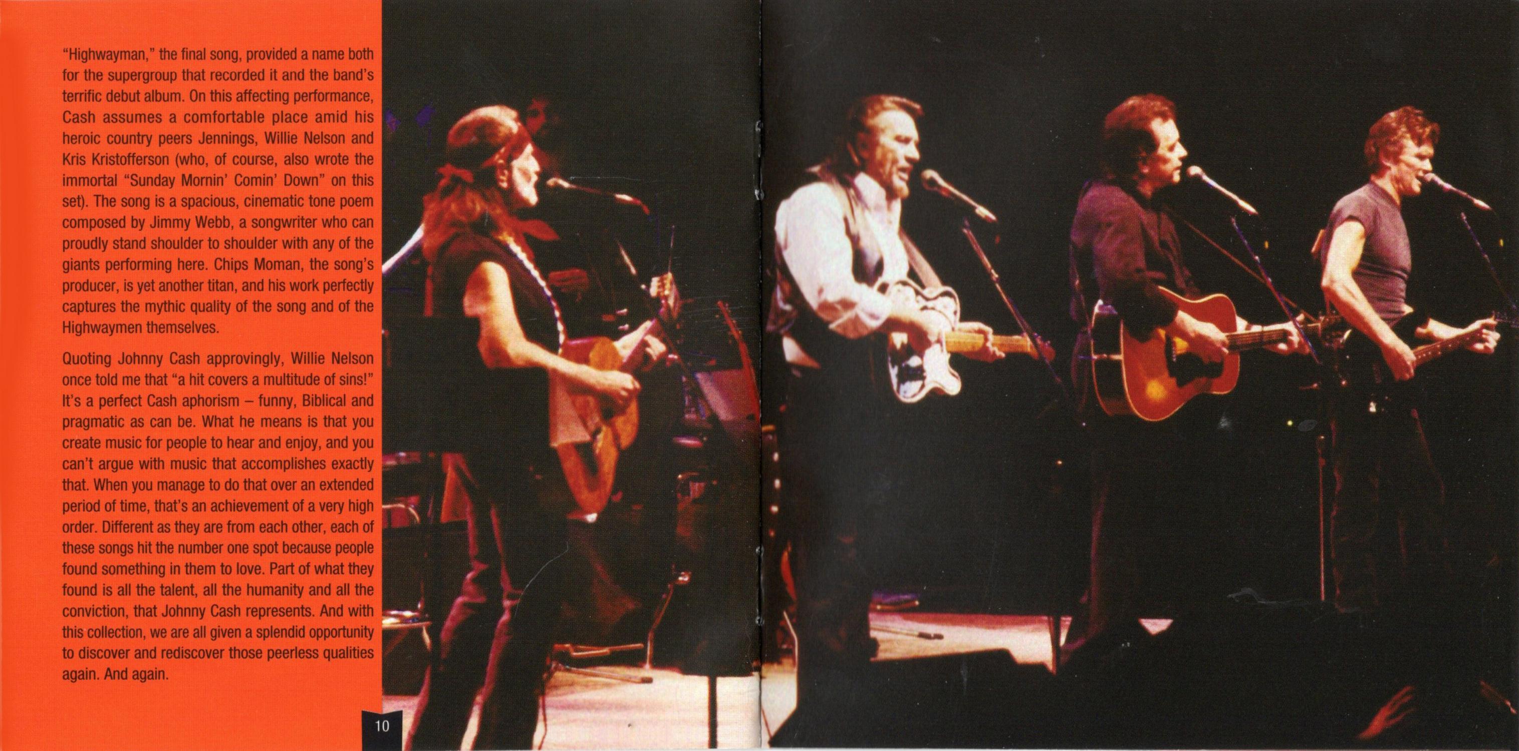 "Highwayman," the final song, provided a name both for the supergroup that recorded it and the band's terrific debut album. On this affecting performance, Cash assumes a comfortable place amid his heroic country peers Jennings, Willie Nelson and Kris Kristofferson (who, of course, also wrote the immortal "Sunday Mornin' Comin' Down" on this set). The song is a spacious, cinematic tone poem composed by Jimmy Webb, a songwriter who can proudly stand shoulder to shoulder with any of the giants performing here. Chips Moman, the song's producer, is yet another titan, and his work perfectly captures the mythic quality of the song and of the Highwaymen themselves.