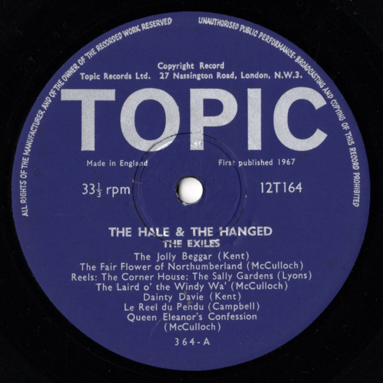 This the second LP devoted entirely to The Exiles. Their first was a record of protest songs old and new, Freedom Come All Ye (Topic 12T143). The group comprises three outstanding singers and instrumentalists from Glasgow, Enoch Kent Gordon McCulloch and Bobby Campbell, who left their native land to find work in the South (Enoch Kent has since accepted exile in ever remoter regions, moving on to Canada). On this record, they are joined by another exile, from Ireland this time, in Tim Lyons, an excellent button-accordion player whom the English must count as,yet another of the treasures we have plundered from the land of Granuaile.