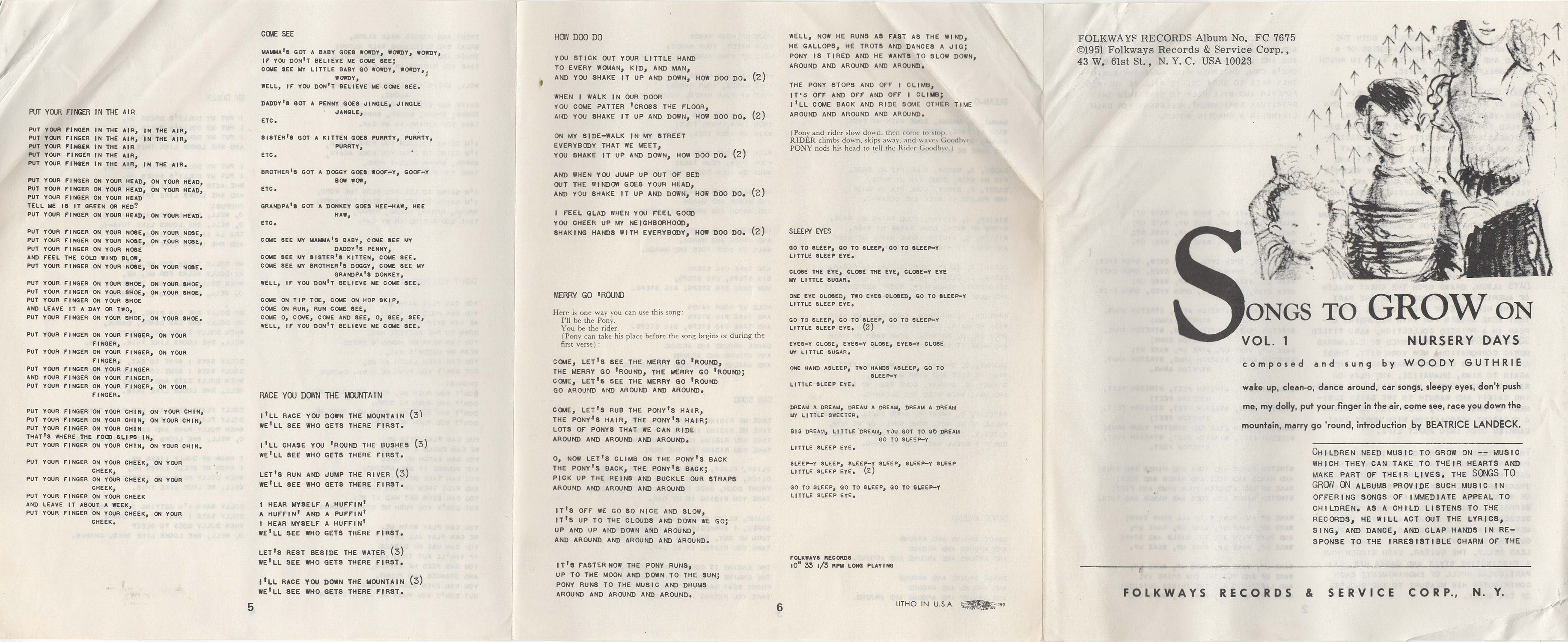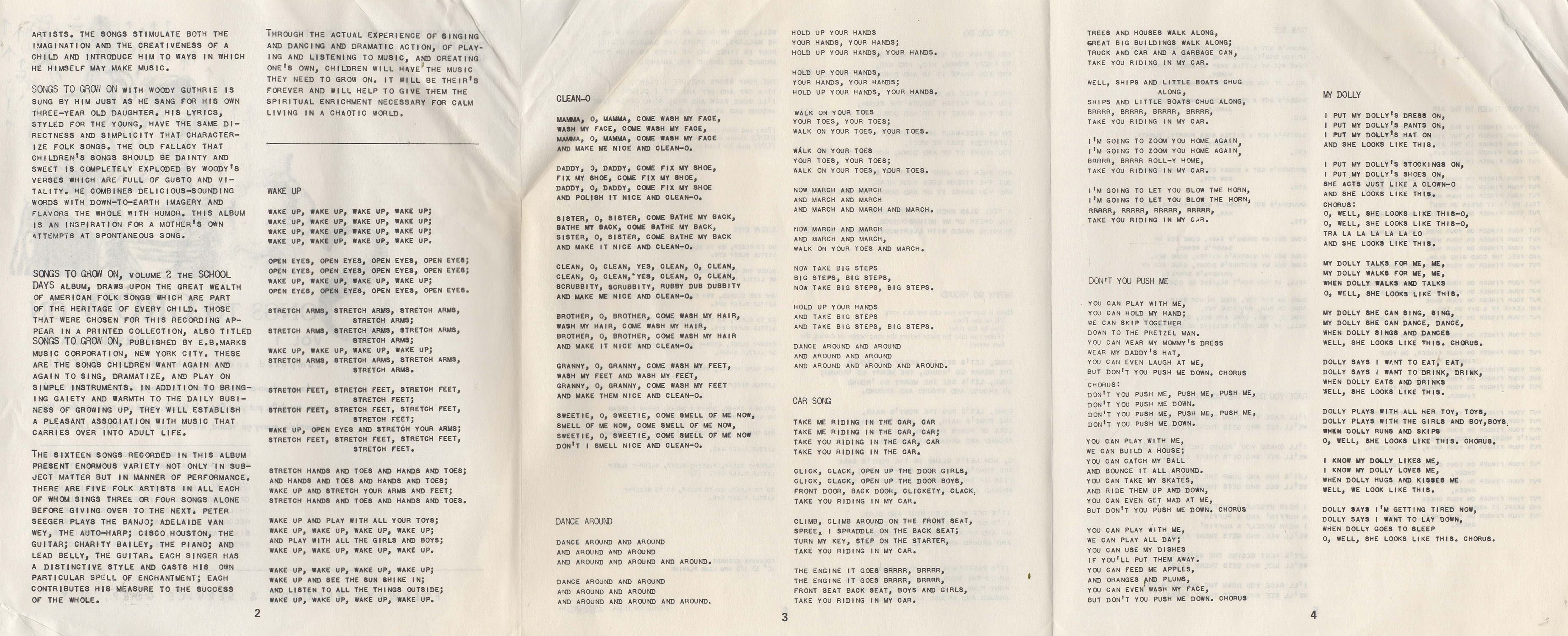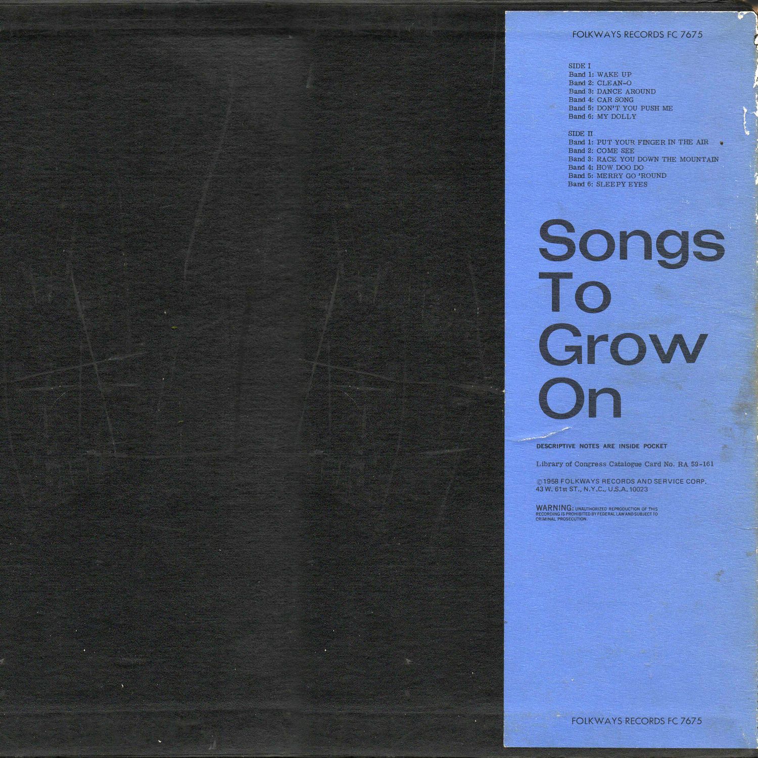 Children need music to grow on — music which they can take to their hearts and make part of their lives, the songs to grow on albums provide such music in offering songs of immediate appeal to children. As a child listens to the records, he will act out the lyrics, sing, and dance, and clap hands in response to the irresistible charm of the artists. The songs stimulate both the imagination and the creativeness of a child and introduce him to ways in which he himself may make music.