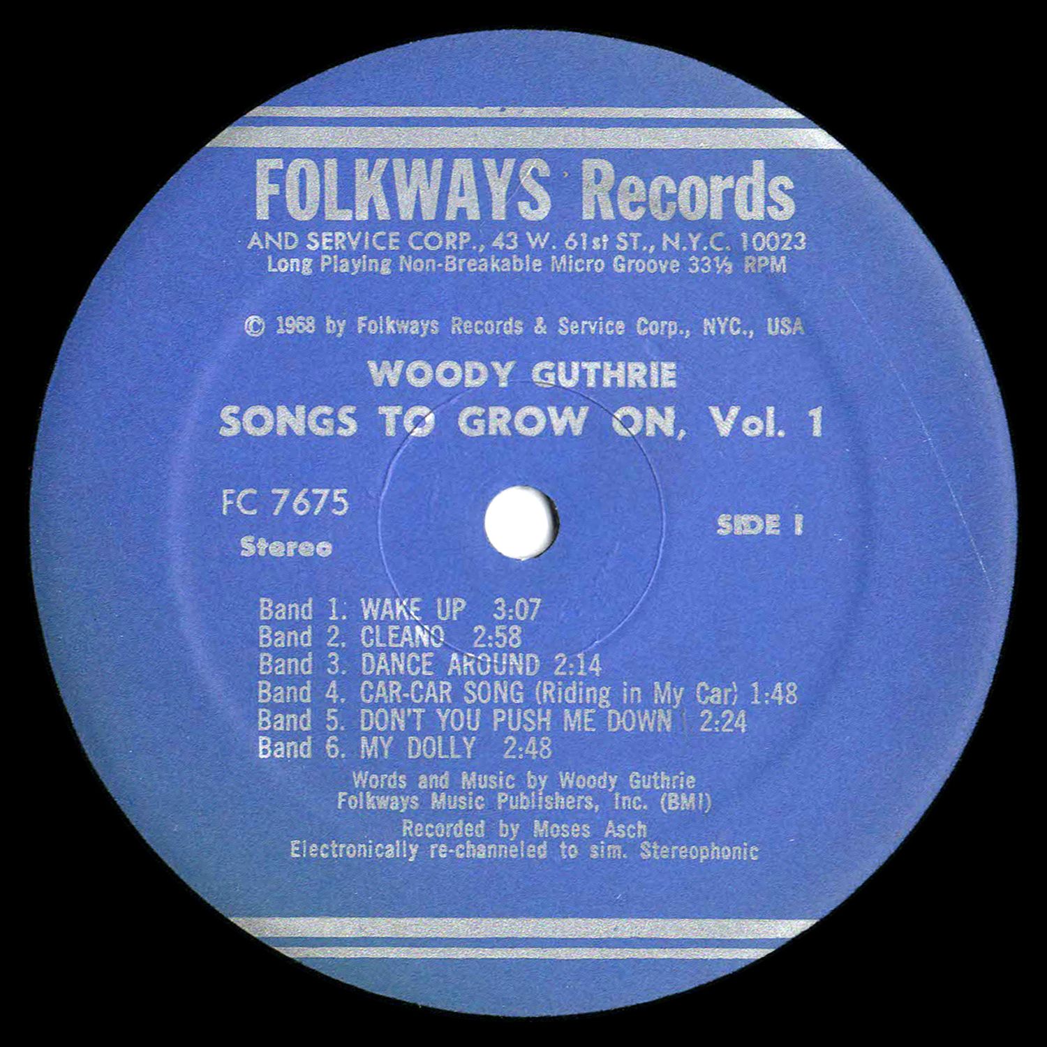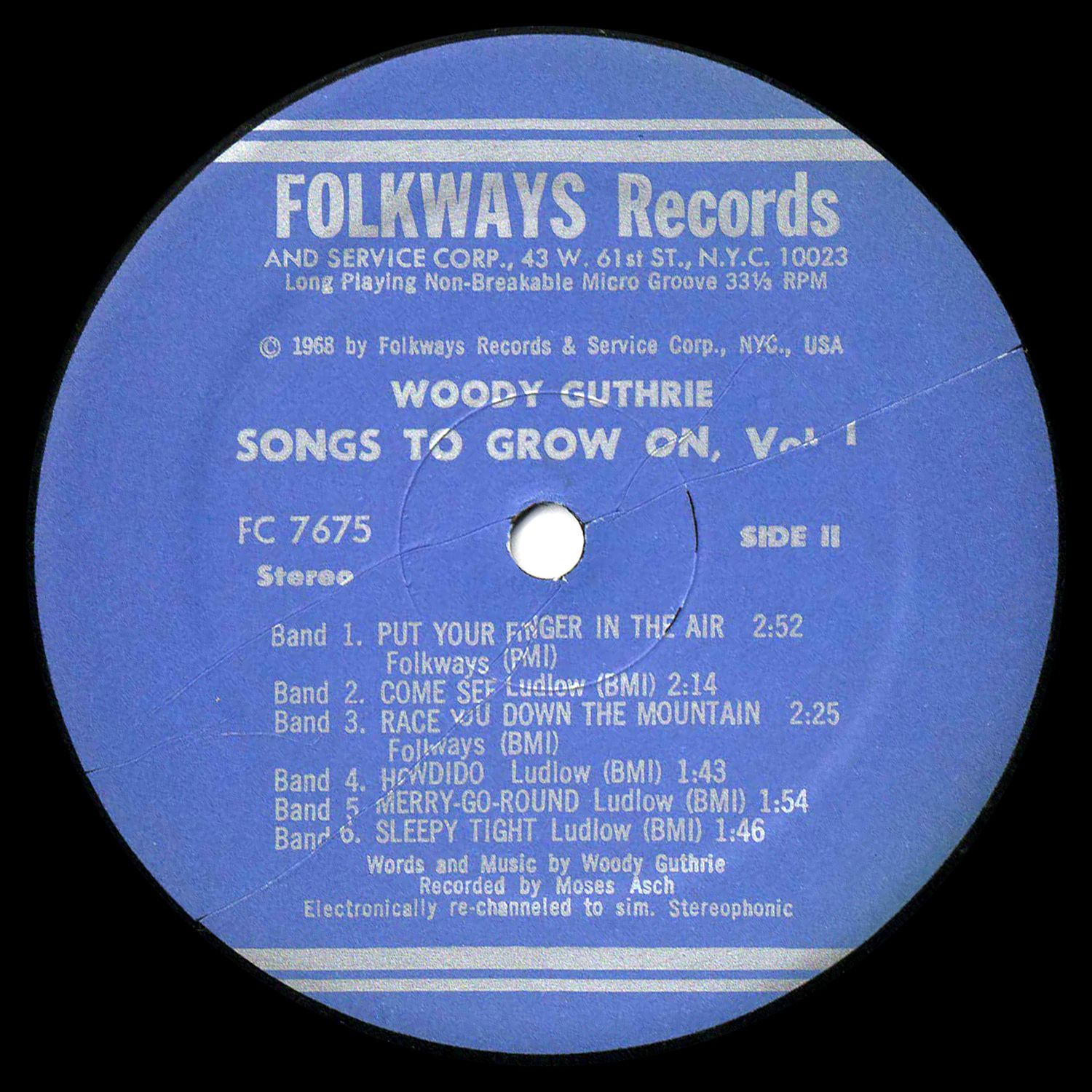 Songs To Grow On with Woody Guthrie is sung by him just as he sang for his own three-year old daughter. His lyrics, styled for the young, have the same directness and simplicity that characterize folk songs. The old fallacy that children's s0ngs should be dainty and sweet is completely exploded by woody's verses which are full of gusto and vitality. He combines delicious-sounding words with down-to-earth imagery and flavors the whole with humor. This album is an inspiration for a mother's own attempts at spontaneous song.