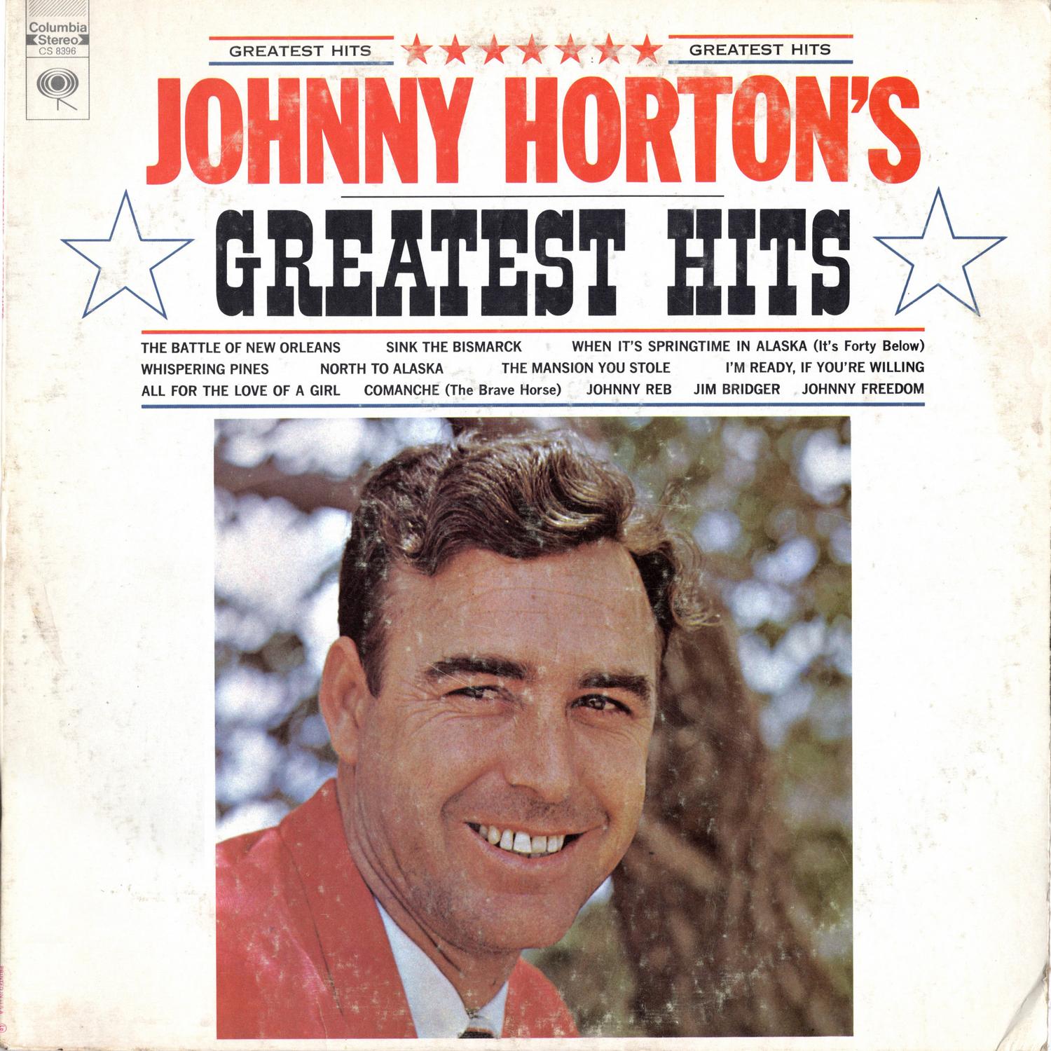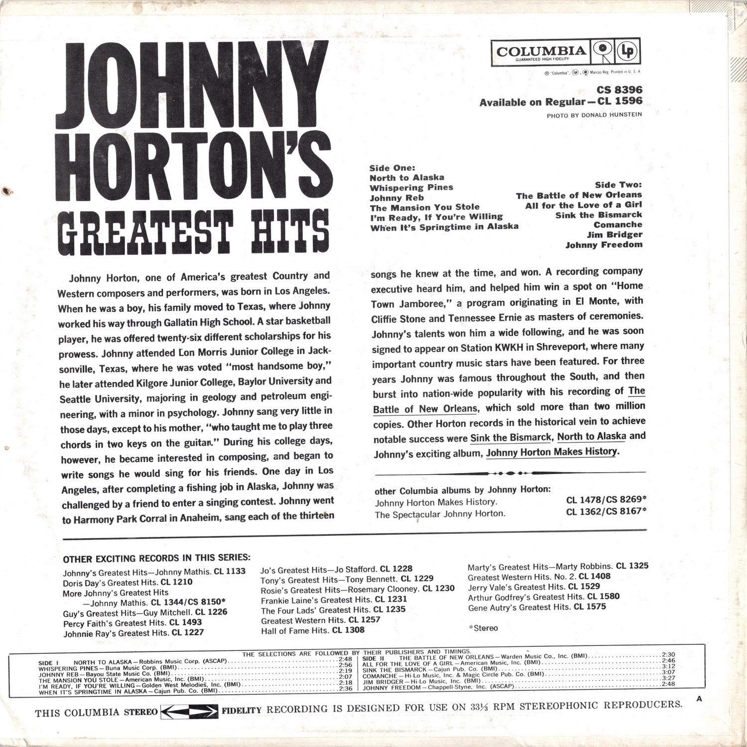 Johnny Horton, one of America's greatest Country and Western composers and performers, was born in Los Angeles. When he was a boy, his family moved to Texas, where Johnny worked his way through Gallatin High School. A star basketball player, he was offered twenty-six different scholarships for his prowess. Johnny attended Lon Morris Junior College in Jacksonville, Texas, where he was voted "most handsome boy," he later attended Kilgore Junior College, Baylor University and Seattle University, majoring in geology and petroleum engineering, with a minor in psychology. Johnny sang very little in those days, except to his mother, "who taught me to play three chords in two keys on the guitar." During his college days, however, he became interested in composing, and began to write songs he would sing for his friends. One day in Los Angeles, after completing a fishing job in Alaska, Johnny was challenged by a friend to enter a singing contest. Johnny went to Harmony Park Corral in Anaheim, sang each of the thirteen songs he knew at the time, and won. A recording company executive heard him, and helped him win a spot on "Home Town Jamboree," a program originating in El Monte, with Cliffie Stone and Tennessee Ernie as masters of ceremonies. Johnny's talents won him a wide following, and he was soon signed to appear on Station KWKH in Shreveport, where many important country music stars have been featured. For three years Johnny was famous throughout the South, and then burst into nation-wide popularity with his recording of The Battle of New Orleans, which sold more than two million copies. Other Horton records in the historical vein to achieve notable success were Sink the Bismarck, North to Alaska and Johnny’s exciting album, Johnny Horton Makes History.