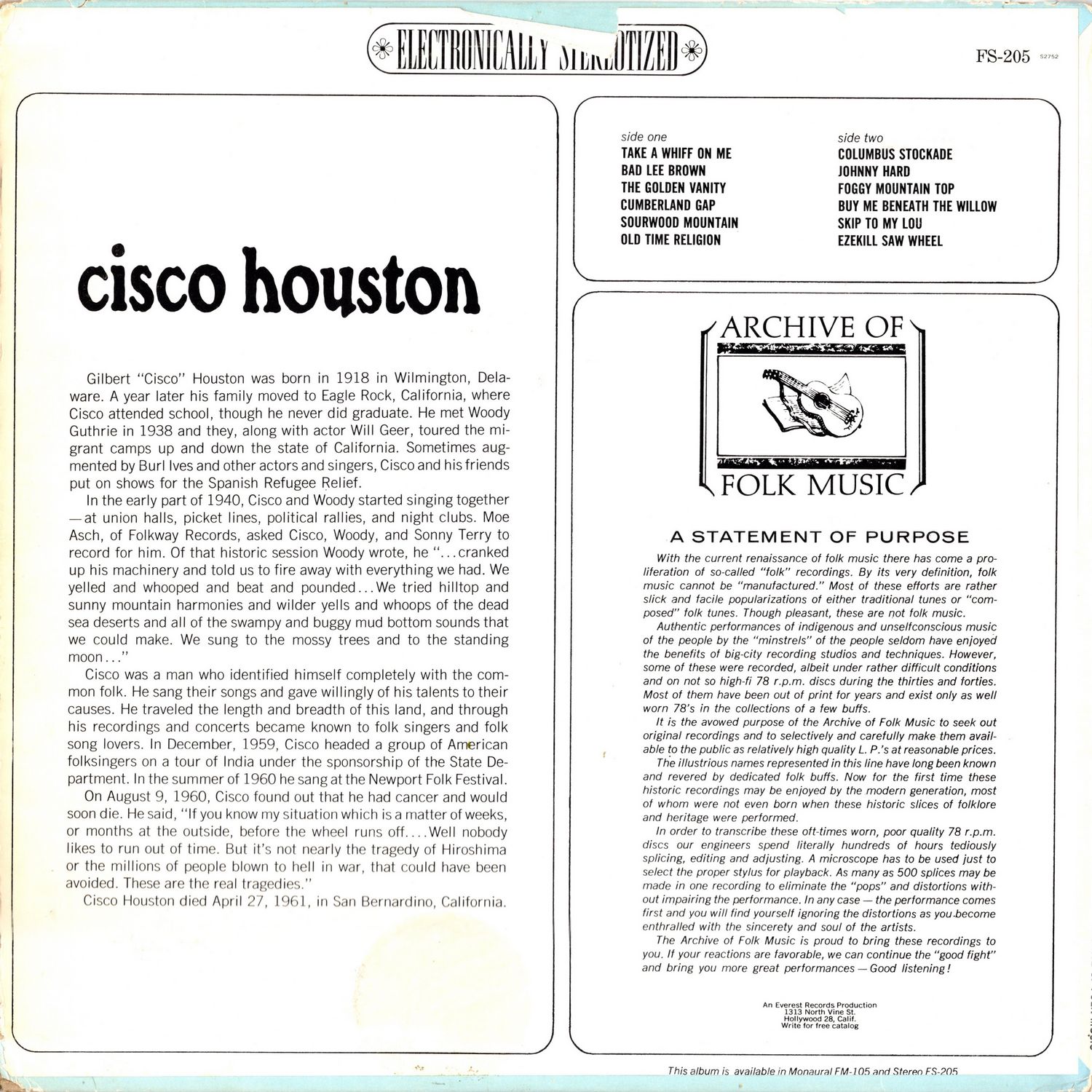 Gilbert "Cisco" Houston was born in 1918 in Wilmington, Delaware. A year later his family moved to Eagle Rock, California, where Cisco attended school, though he never did graduate. He met Woody Guthrie in 1938 and they, along with actor Will Geer, toured the migrant camps up and down the state of California. Sometimes augmented by Burl Ives and other actors and singers, Cisco and his friends put on shows for the Spanish Refugee Relief.
