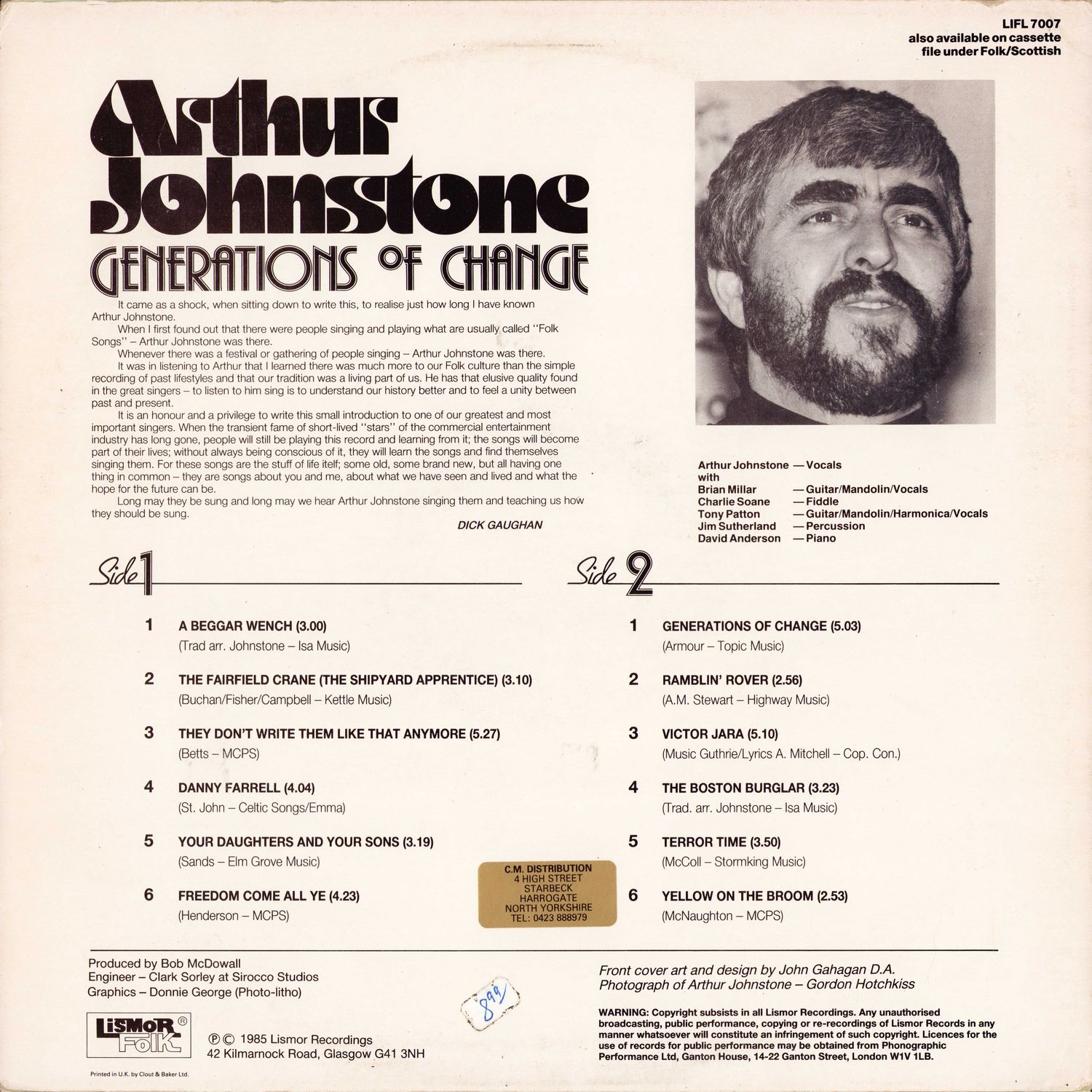 It is an honour and a privilege to write this small introduction to one of our greatest and most important singers. When the transient fame of short-lived "stars" of the commercial entertainment industry has long gone, people will still be playing this record and learning from it; the songs will become part of their lives; without always being conscious of it, they will learn the songs and find themselves singing them. For these songs are the stuff of life itself; some old, some brand new, but all having one thing in common — they are songs about you and me, about what we have seen and lived and what the hope for the future can be.