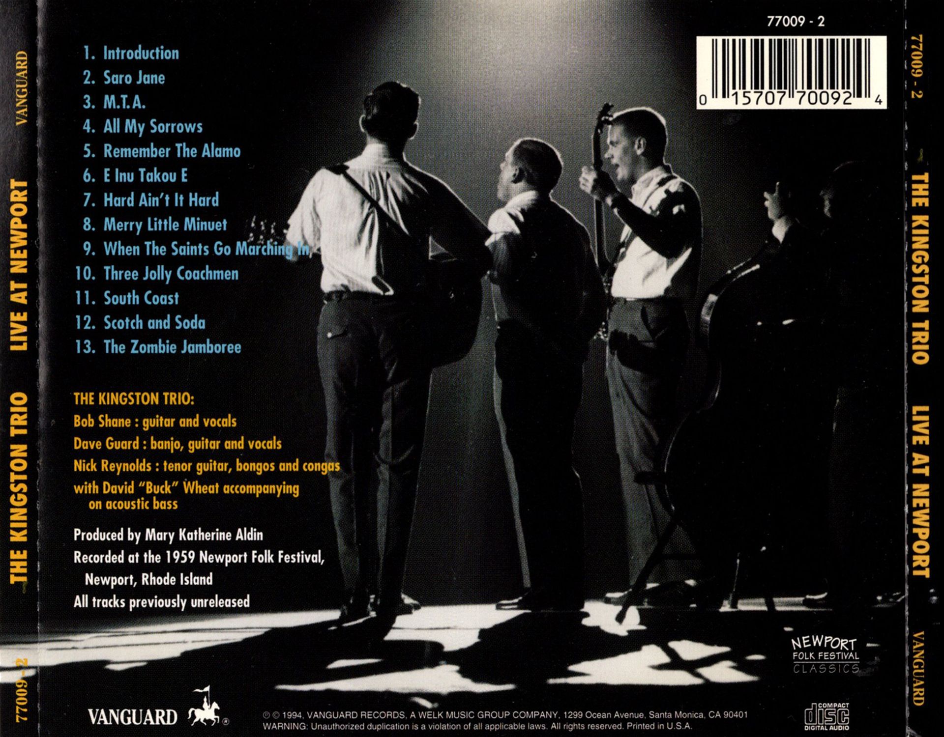The songs heard here are all vintage Kingston Trio. Learning an important lesson from the fate of the Weavers, the outspokenly left-wing folk group who'd been blacklisted out of existence only a handful of years previously, the Trio selected material to perform and record that was funny, interesting, and occasionally thought-provoking, but never politically controversial. Hence, traditional and contemporary folk songs shared the bill with occasional original compositions by one or more members of the group. And the songs they did at Newport were largely familiar to their audience, since "Saro Jane," "Hard, Ain't It Hard," "Three Jolly Coachmen," and "Scotch and Soda" were all from their first Capitol album, The Kingston Trio, while "Merry Little Minuet," "South Coast," and The Zombie Jamboree" appeared on their second LP, Live From the Hungry i. Additionally, a single had been released of "M.T.A." in June of 1959, which had already reached #15 on the Billboard charts by the time the group came to Newport and to this day it remains one of their two most requested songs.