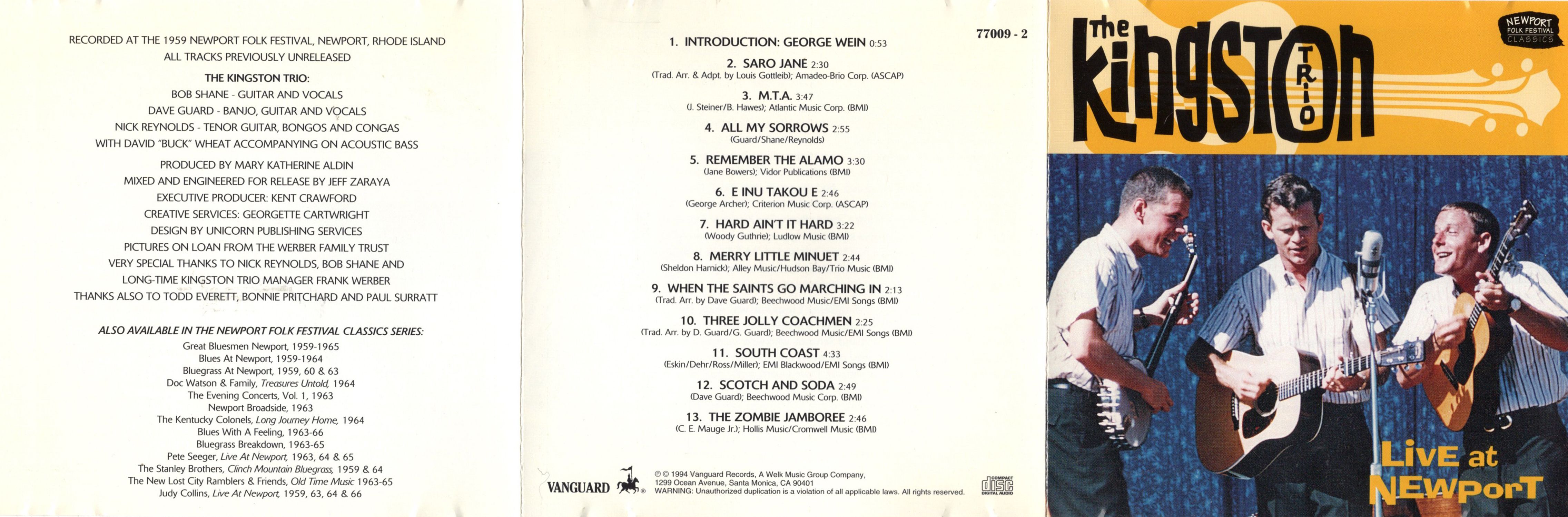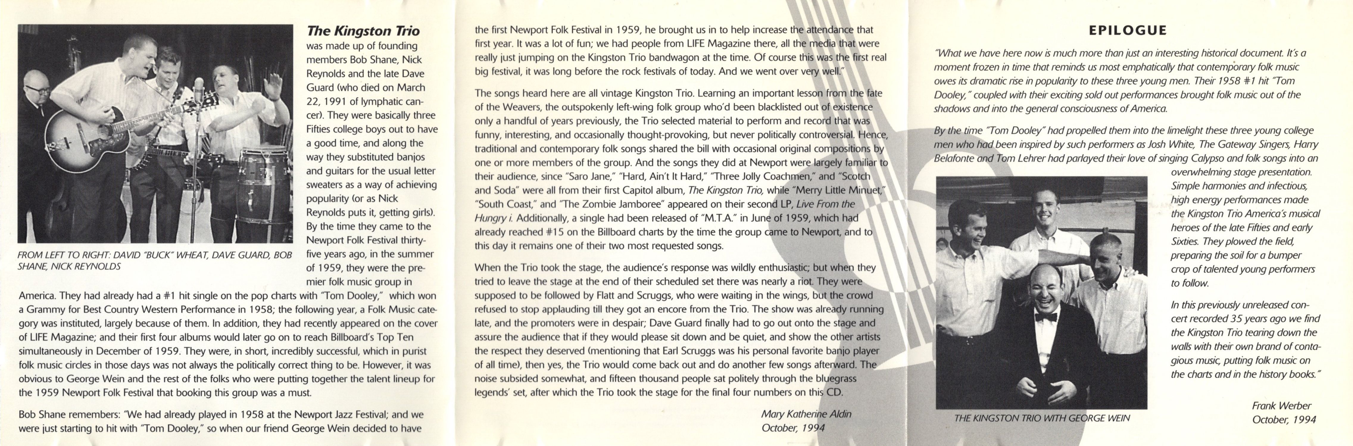 Bob Shane remembers: "We had already played in 1958 at the Newport Jazz Festival; and we were just starting to hit with "Tom Dooley," so when our friend George Wein decided to have the first Newport Folk Festival in 1959, he brought us in to help increase the attendance that first year. It was a lot of fun; we had people from LIFE Magazine there, all the media that were really just jumping on the Kingston Trio bandwagon at the time. Of course this was the first real big festival, it was long before the rock festivals of today. And we went over very well."